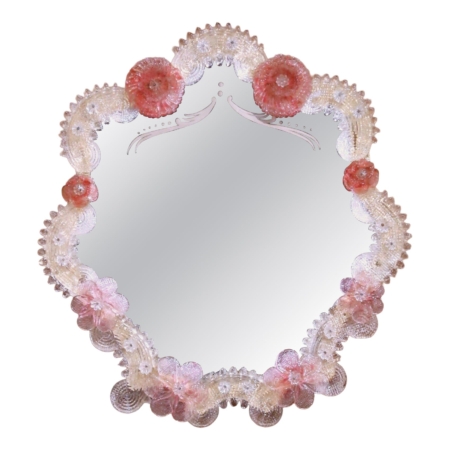 • Mid-Century Italian Murano Glass Vanity Mirror with Pink Flowers
