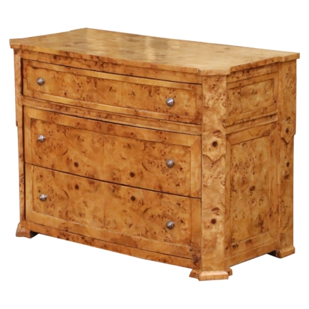 • Mid-Century French Charles X Style Burl Elm Three-Drawer Chest Commode