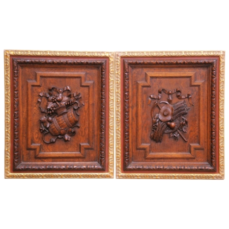 Pair of 19th Century French Carved Oak Wall Harvest Panels in Gilt Frames