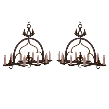 Pair of 19th Century French Gothic Wrought Iron Eight-Light Chandeliers