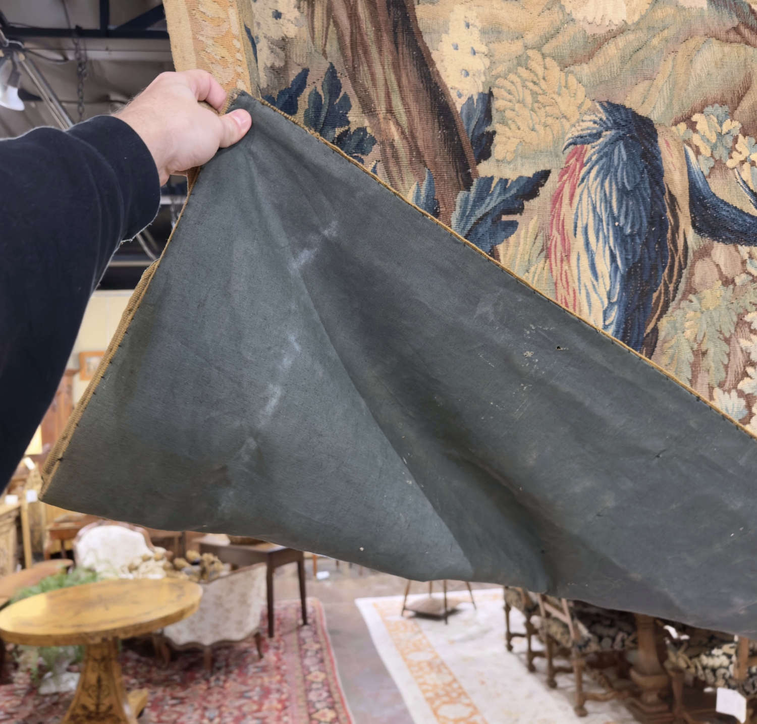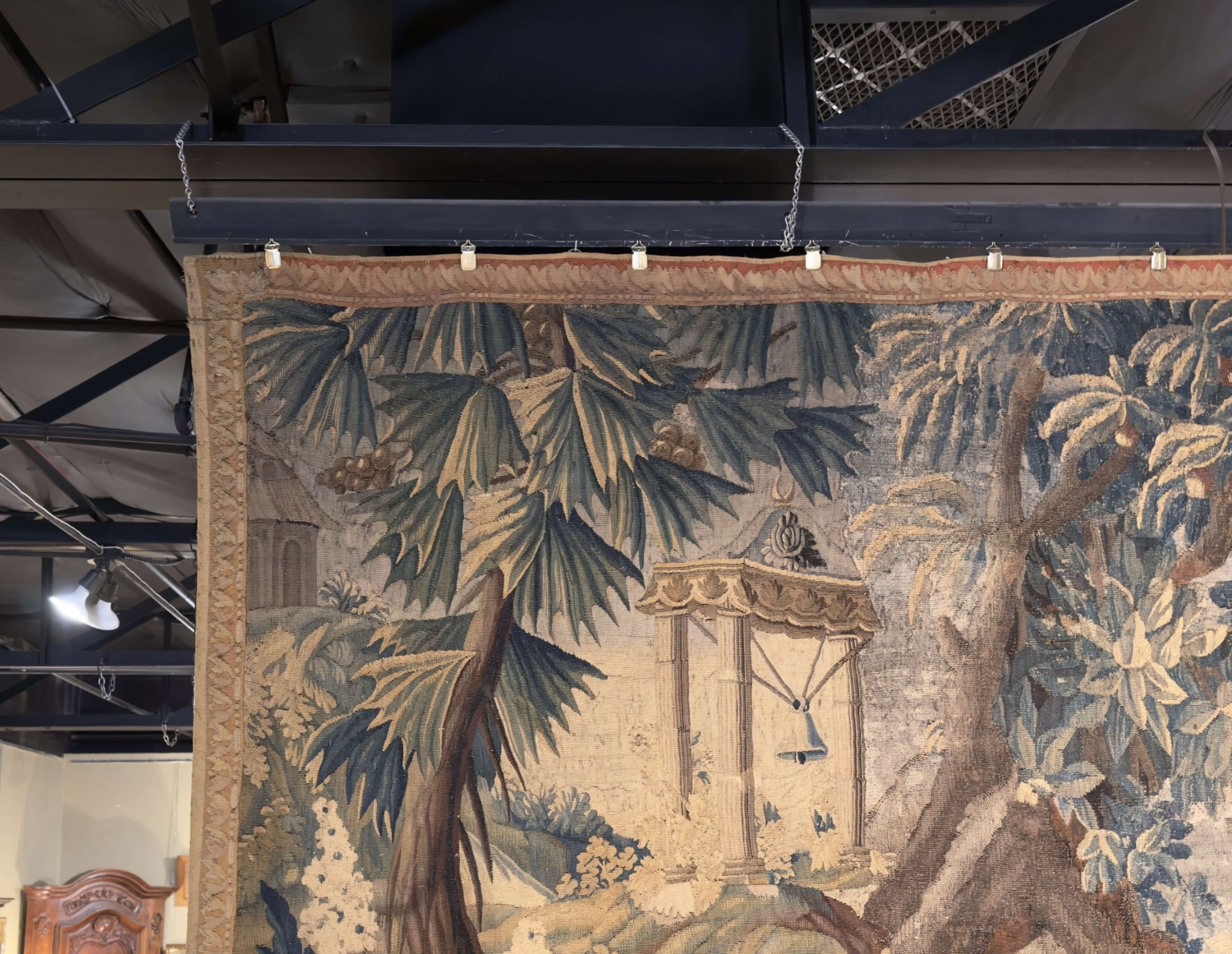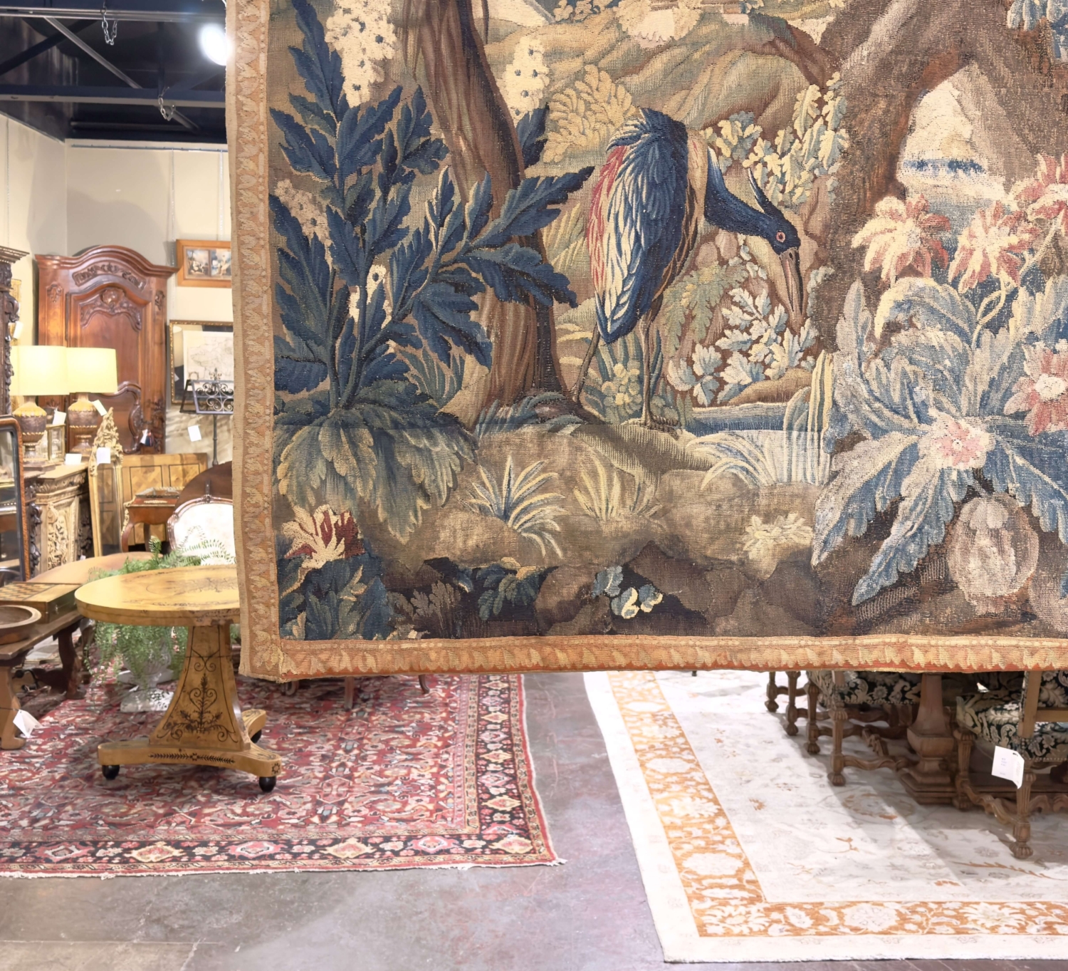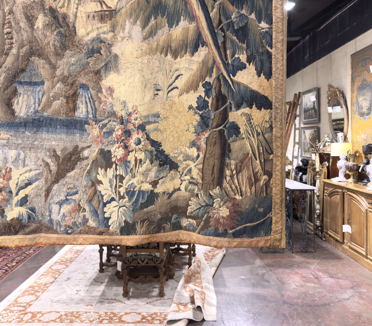 This exquisite antique tapestry was handwoven in Aubusson, France, circa 1760, and exemplifies the refined artistry and technical mastery for which this historic weaving center is celebrated. Rectangular in form and monumental in scale at 140 inches wide by 82.25 inches high, the composition presents a lush wooded landscape animated by exotic birds, blooming foliage, and romantic architectural ruins nestled in the distance. A flowing river with cascades adds depth and movement, while the presence of birds including cranes and parrots introduces a dynamic narrative within the tranquil setting. Rendered in a harmonious palette of soft blues, beiges, greens, and ochres, the scene is framed with its original floral border, typical of 18th-century Aubusson work, which features scrolling foliate and stylized motifs. The tapestry is backed with a protective white canvas and outfitted with hanging rings for secure and easy wall display. Aubusson, located in central France along the river Creuse, became a prominent center of tapestry production in the 17th and 18th centuries under royal patronage. Employing the horizontal low-warp loom technique known as “basse-lisse,” Aubusson artisans achieved remarkable pictorial detail and a sense of spatial depth, as beautifully evidenced in this piece. In excellent condition commensurate with age and use, this richly detailed tapestry would make an impressive statement on a grand staircase, in a formal salon, or as a focal point in an entry hall. A rare and decorative work of textile art that embodies the grandeur and sophistication of the Louis XV era.