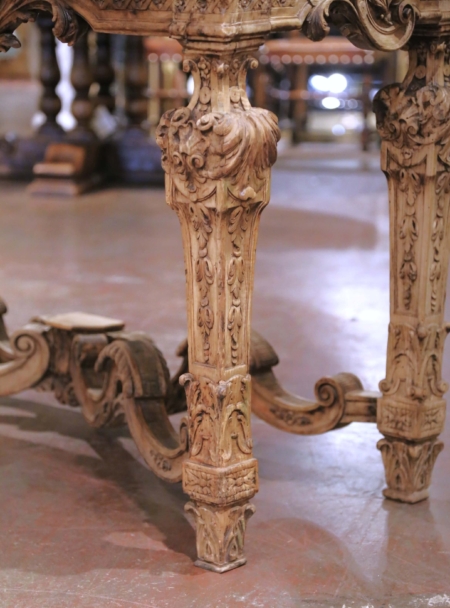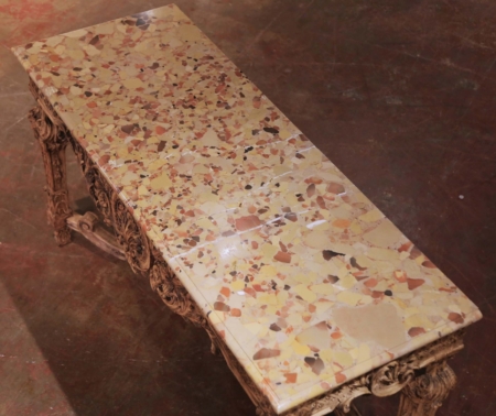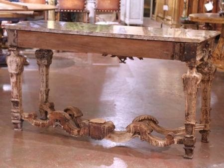 This elegant antique salon table was crafted in France circa 1780 in the grand Louis XIV style. The rectangular surface is fitted with a luxurious Brèche d’Ardèche marble top, admired for its striking variegated palette of ochre, terracotta, cream, and black fragments, all framed by a molded bullnose edge. The richly colored marble provides a dramatic contrast to the lighter base below. The carved walnut frame has been carefully bleached, giving the wood a soft, neutral tone that highlights the depth of its hand-carved ornamentation. The frieze is decorated with scrolling foliate motifs and elaborate pierced scrollwork, centered with a bold acanthus cartouche. Each tapering square leg is profusely carved with floral and foliate reliefs, and all are joined by an ornate scrolling X-form stretcher with volutes and gadrooned accents, exemplifying the opulence and symmetry of Louis XIV design. The console table is in excellent condition commensurate with age and use, with the bleached walnut patina lending a fresh, versatile character to the piece while maintaining its antique integrity. Substantial and refined, it would make a striking statement in a salon, entryway, or dining room. Measures: 35.25” H x 64” W x 22.75” D