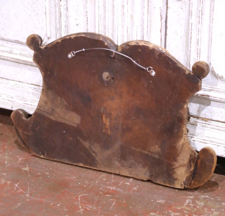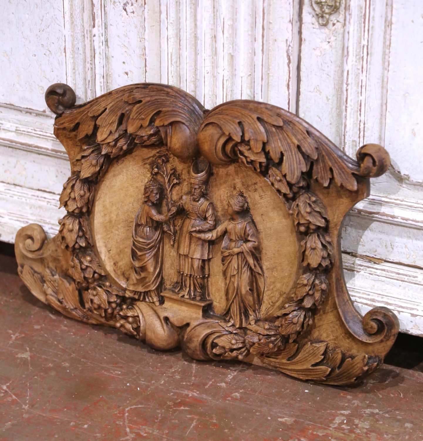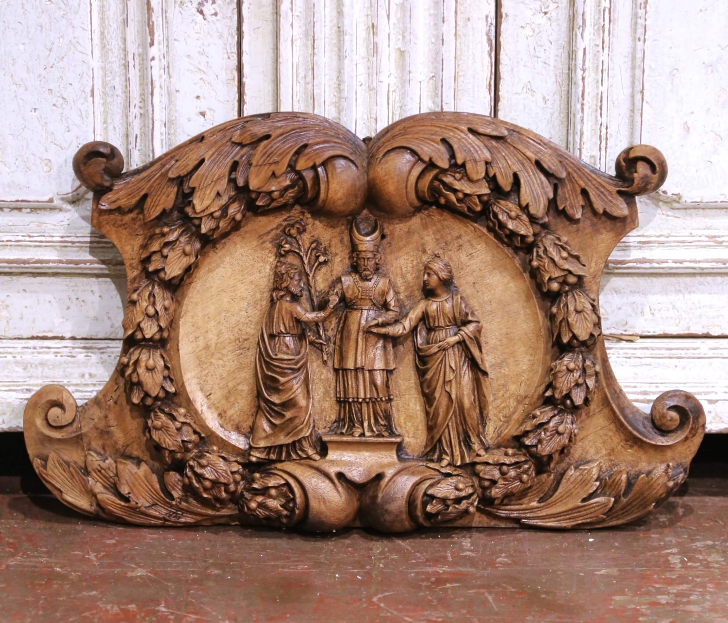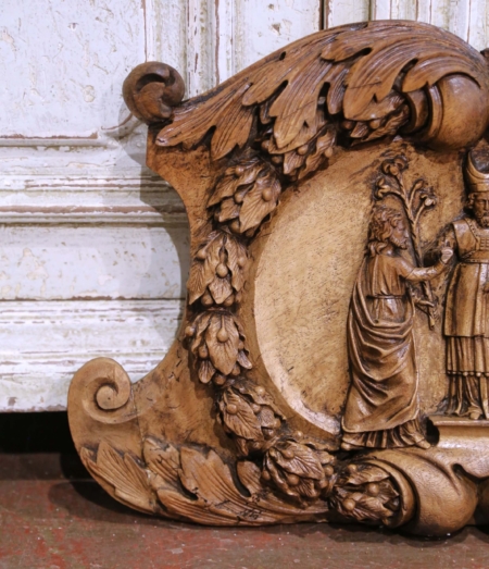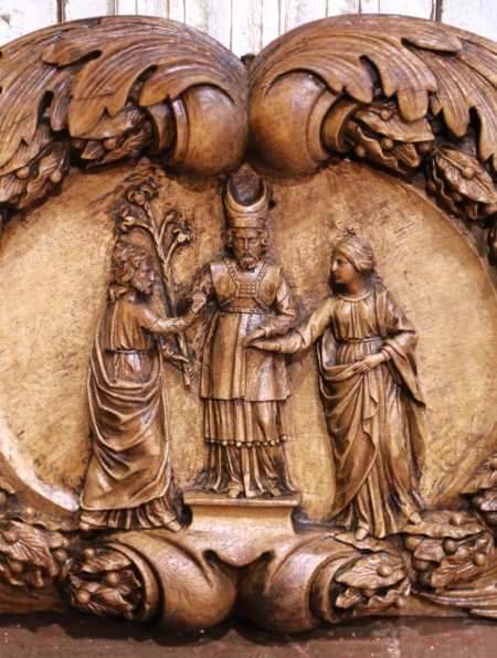 This exceptional hand-carved French walnut relief, circa 1780, likely represents “The Betrothal of the Virgin Mary and Saint Joseph”, a traditional Christian theme depicting the moment when the high priest unites the couple in holy matrimony. The central figure, a bishop or priest, extends his hand to join theirs, symbolizing divine blessing. Executed in deep Baroque-style relief, the composition features a sweeping oval medallion framed with acanthus scrolls, leaves, and fruiting branches, symbolizing faith and endurance. The sculptural depth and movement of the drapery evoke the lively expressiveness characteristic of the late Baroque and early Rococo period. The piece adorns a rich walnut patinated finish, enhancing its dimensionality and depth. A new hanging device has been added to the back for easy wall display. Measures: 21.25″ W x 2″ D x 13″ H.