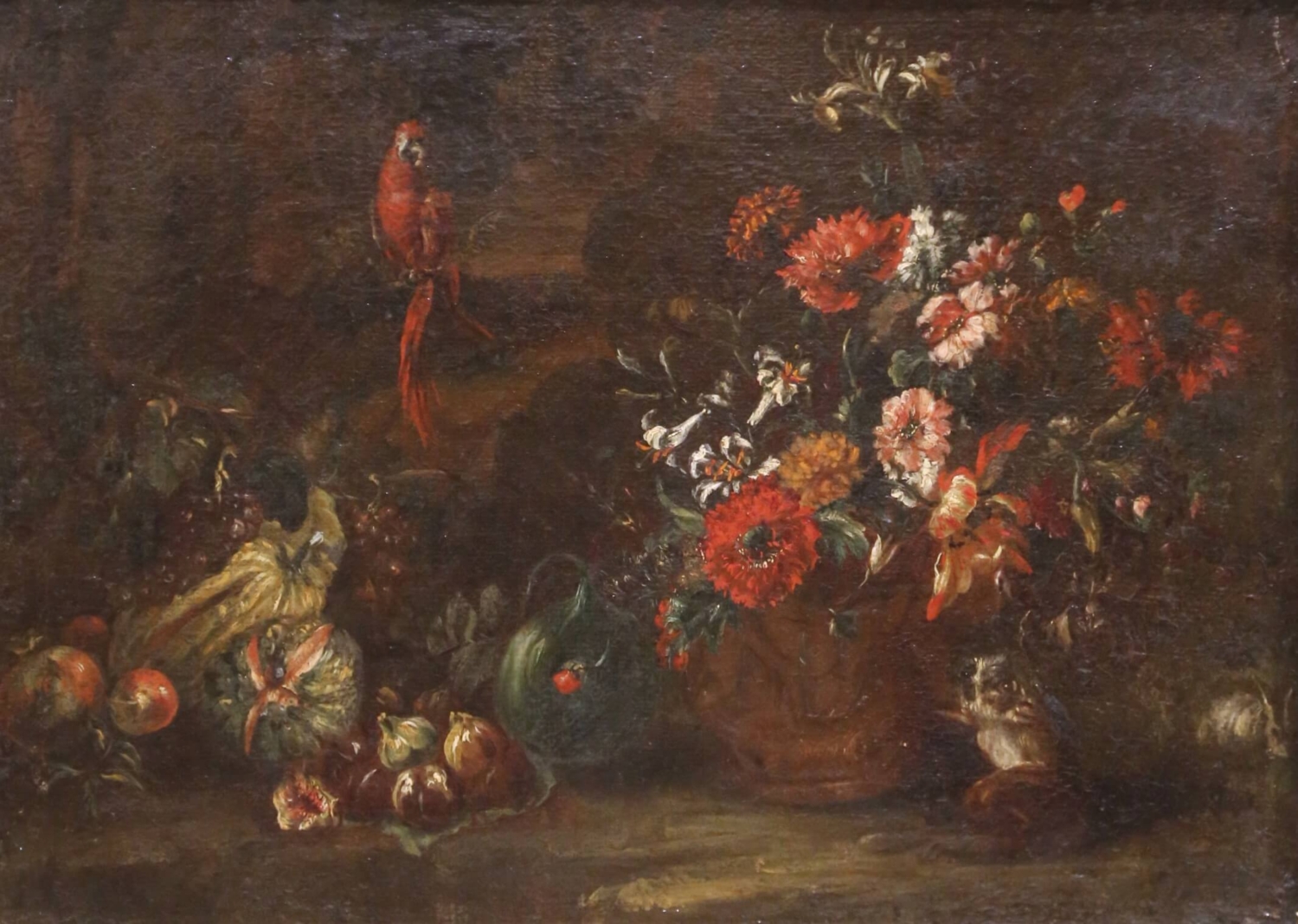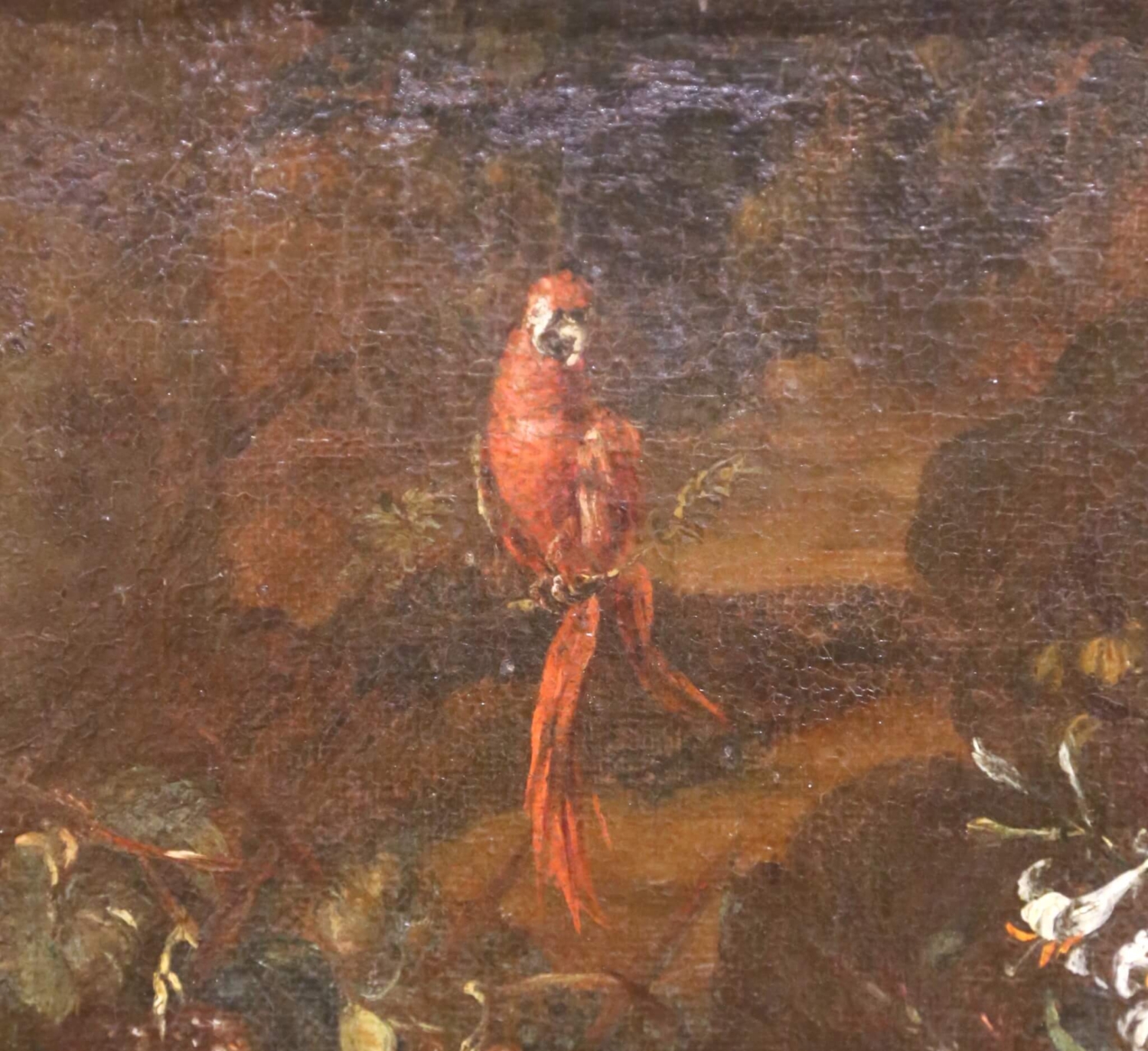 18th Century Flemish School Still Life Painting with Flowers and Parrot