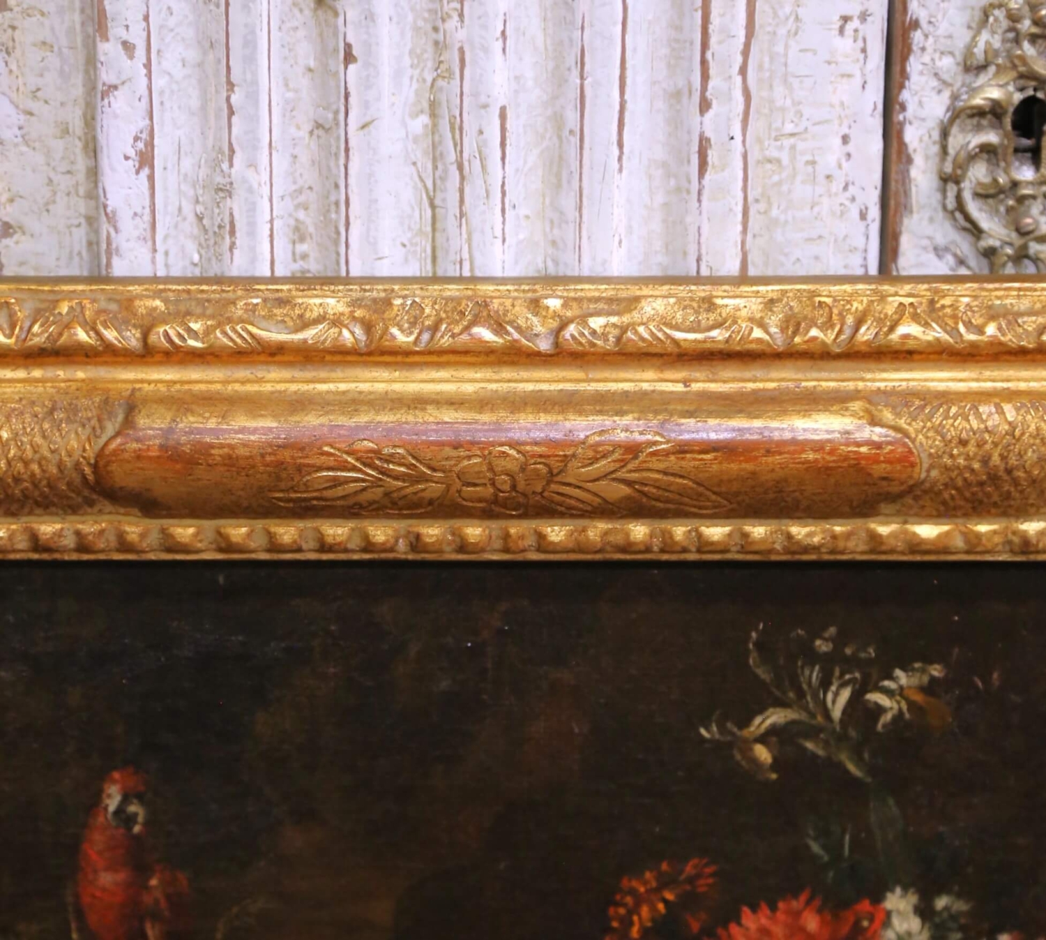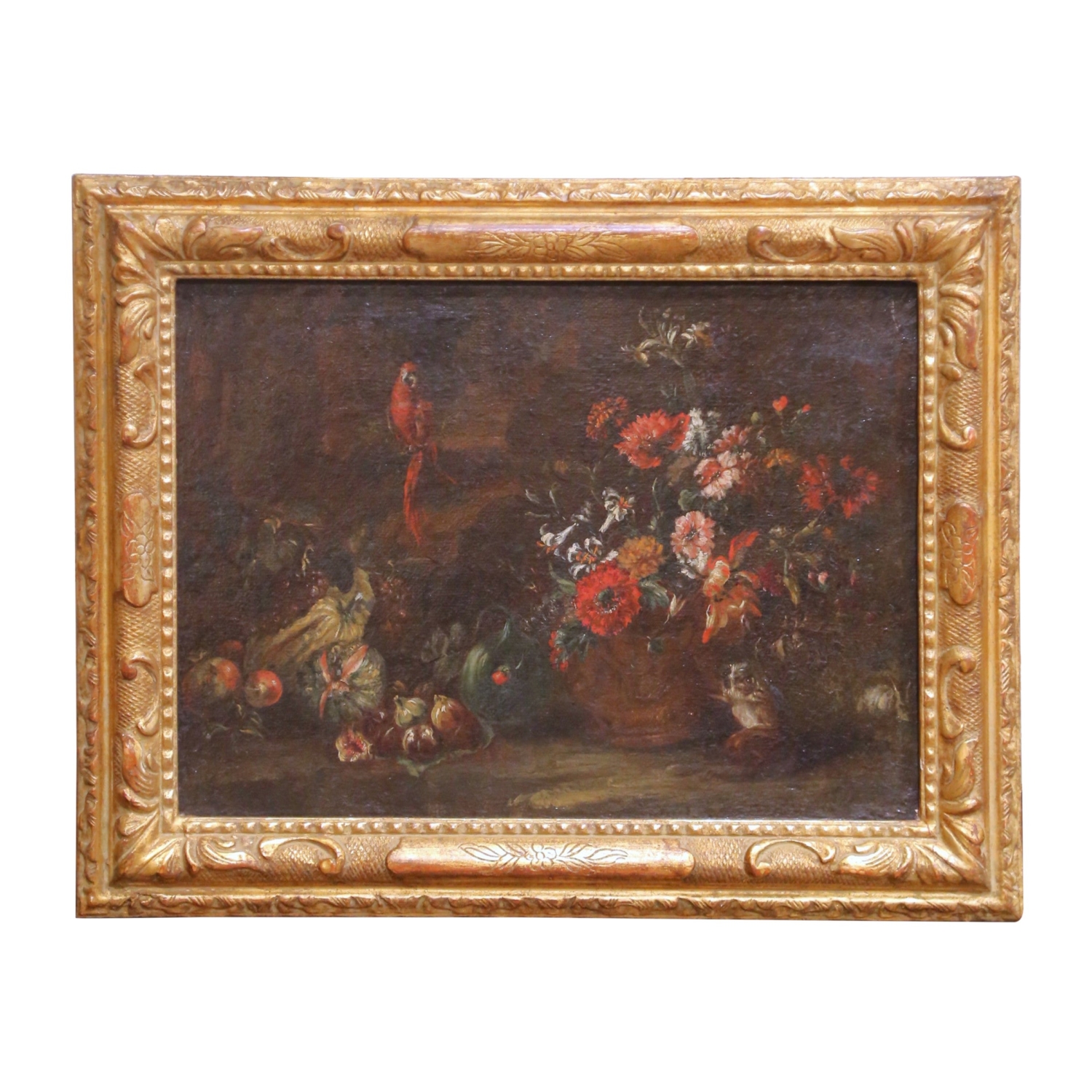 This elegant antique Flemish School still life painting was executed in oil on canvas circa 1770, and reflects the refined Northern European tradition of floral still-life painting. The composition is rendered in the manner of Jan van Huysum, whose influence is evident in the lush abundance of flowers, balanced structure, and sophisticated use of color and light. Set against a dark, atmospheric ground, the painting depicts a richly layered bouquet of flowers in warm reds, soft pinks, and creamy whites, accented with foliage and fruit. A striking red parrot in flight enlivens the upper portion of the composition, an exotic motif favored in Flemish and Dutch interiors that introduces movement and visual drama. The artist’s confident brushwork and controlled chiaroscuro lend depth and dimension, while the surface displays fine craquelure and a warm, naturally aged patina consistent with age and use, reinforcing the painting’s authentic antique character. The work is presented in a carved and giltwood frame with scrolling foliate decoration, visually harmonious and appropriate to the period. The painting remains in excellent condition, with honest wear commensurate with age. Decorative and collectible, this antique still life would make a refined statement in a traditional interior, library, dining room, or curated gallery wall. Dimensions: 22″W x 17″H (framed)