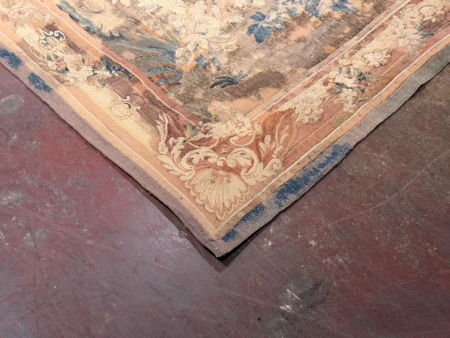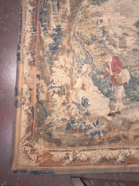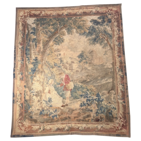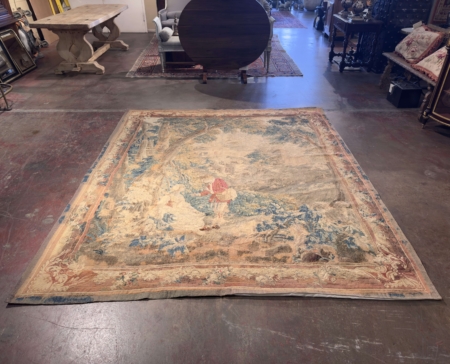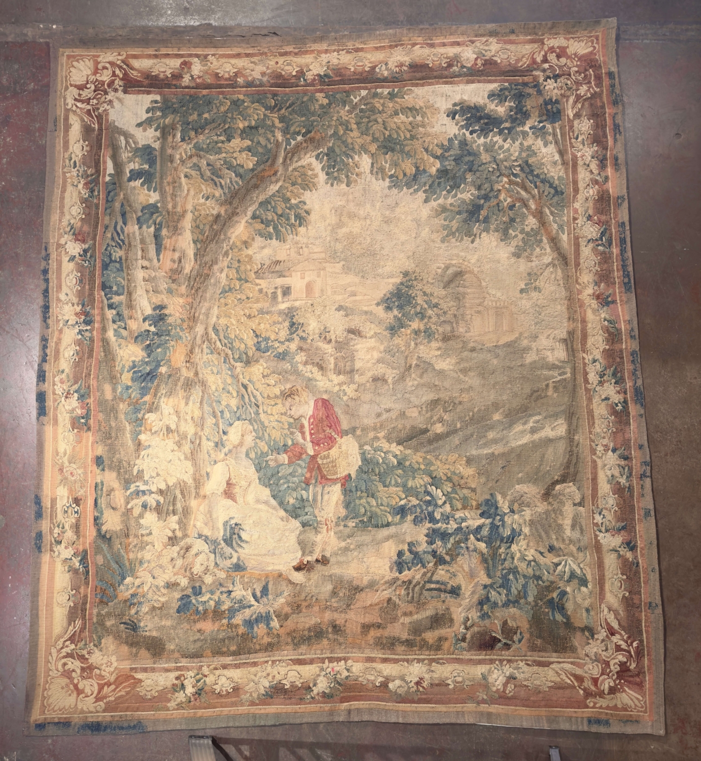 Bring a touch of romance and history into your home with this large antique Aubusson tapestry. Woven in France circa 1780, the work is based on a cartoon attributed to Jean-Baptiste Huet (French, 1745–1811), one of the leading Rococo painters and designers of his era, celebrated for his pastoral scenes and animal studies. Huet was closely associated with the Manufacture de Beauvais and the Gobelins Manufactory, where his designs became prized for their lively compositions and refined color palettes. This exceptional example captures one of Huet’s favorite themes: an idyllic courtship scene with a gentleman offering affection to a seated lady beneath a sweeping tree, her loyal dog at her side, with a distant village beyond. A scrolling floral and foliate border in shades of rose, cream, and pale blue frames the scene. Standing over nine feet tall, the tapestry’s soft palette has mellowed beautifully over time, enhancing its romantic and painterly quality. Aubusson, located on the River Creuse, was granted the title of “Royal Manufacturer” in 1665 and produced commissions for Louis XV, Louis XVI, and Napoleon I. Today, pieces like this are sought after for their artistry and historical significance. In excellent condition commensurate with age and use, with minor repairs and wear consistent with its 18th-century origins; recently backed for stability. A spectacular wall piece for a grand living room, library, or gallery space. Measures: 93.5″ W x 111″ H