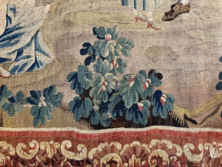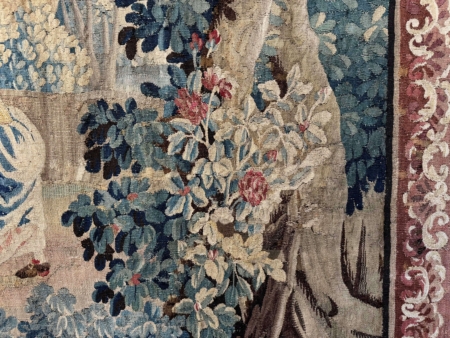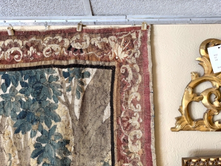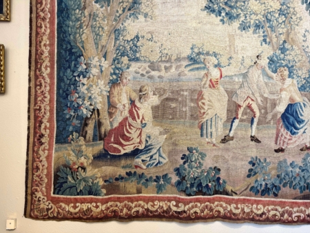 This large and elegant antique tapestry was woven in Aubusson, France, circa 1760. The handwoven scene depicts a lively group of figures engaged in the popular 18th-century game Colin-Maillard (Blind Man’s Buff), set within a lush wooded landscape near a stone balustrade. Dressed in historically accurate French costumes, the participants are beautifully rendered in shades of crimson, ivory, and sky blue, contrasted by rich foliage in soft green and teal tones. The tapestry retains its original scrolling floral border, while a new heavy white canvas backing provides reinforcement and protection. Aubusson tapestries represent the pinnacle of French weaving tradition. Originating in the Creuse region of central France, the Aubusson workshops flourished under royal patronage during the reign of Louis XIV. Renowned for their refined verdure and pastoral scenes, these handwoven textiles were created on low-warp looms (“basse lisse”) using wool and silk to achieve remarkable depth, tonal harmony, and painterly realism. Valued by European nobility for their beauty and grandeur, Aubusson tapestries remain enduring symbols of French craftsmanship and timeless elegance. Executed in fine wool and silk, this courtly 18th-century Aubusson piece is in excellent condition commensurate with age and use, displaying vibrant colors, strong definition, and a well-preserved original border. Measures: 116″ W × 89″ H.