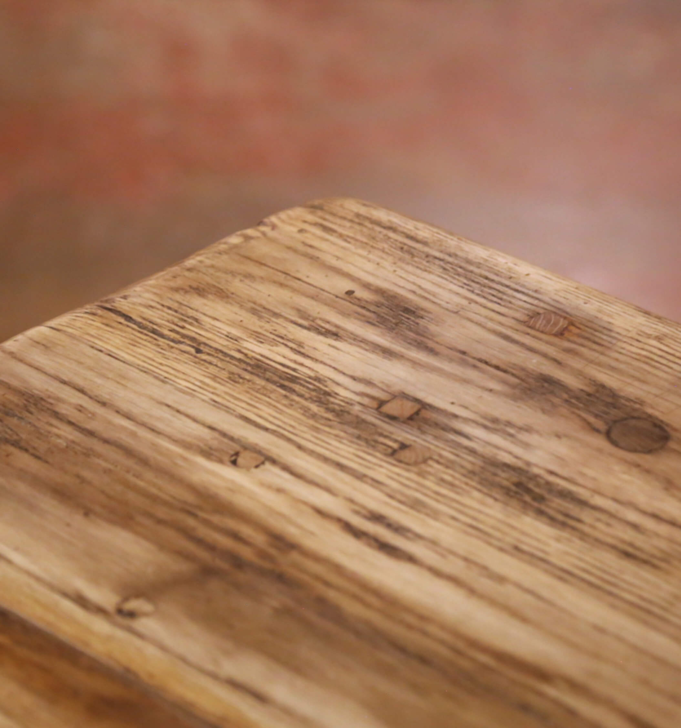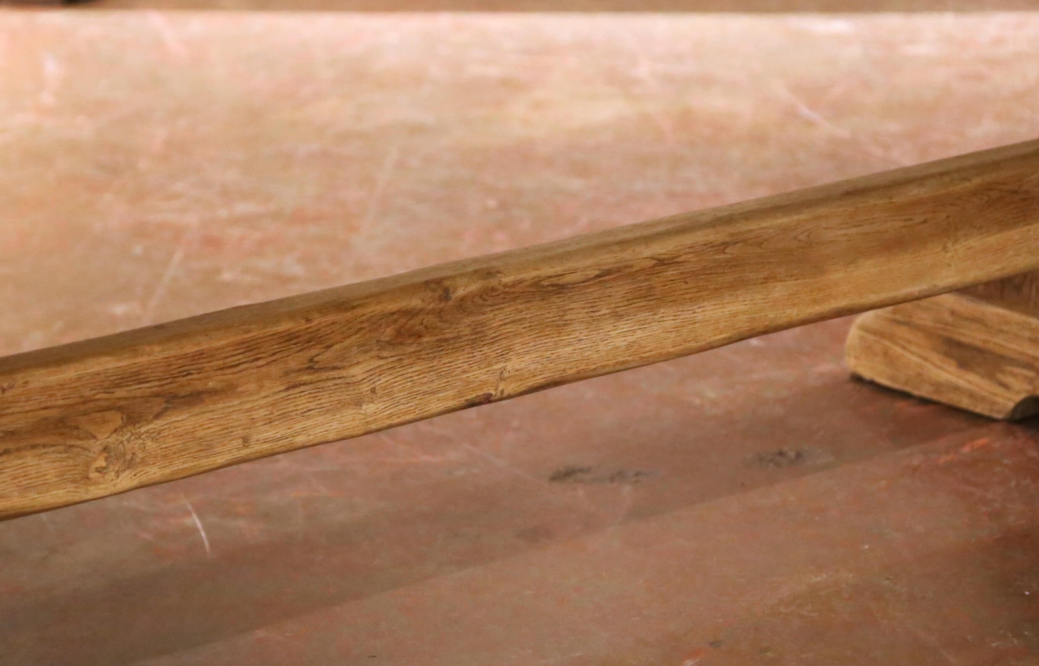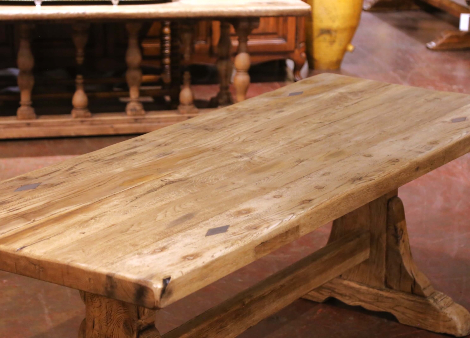 Crafted in France circa 1780, this antique monastery refectory table embodies the strength and rustic character of traditional provincial craftsmanship. The long rectangular top is constructed from thick solid oak planks, finished in a soft bleached patina that highlights the dramatic grain, knots, and natural movement of the wood accumulated over centuries of use. Decorative wrought iron diamond-shaped nailheads are inset across the surface, providing subtle visual contrast and reinforcing the historic character of the piece.