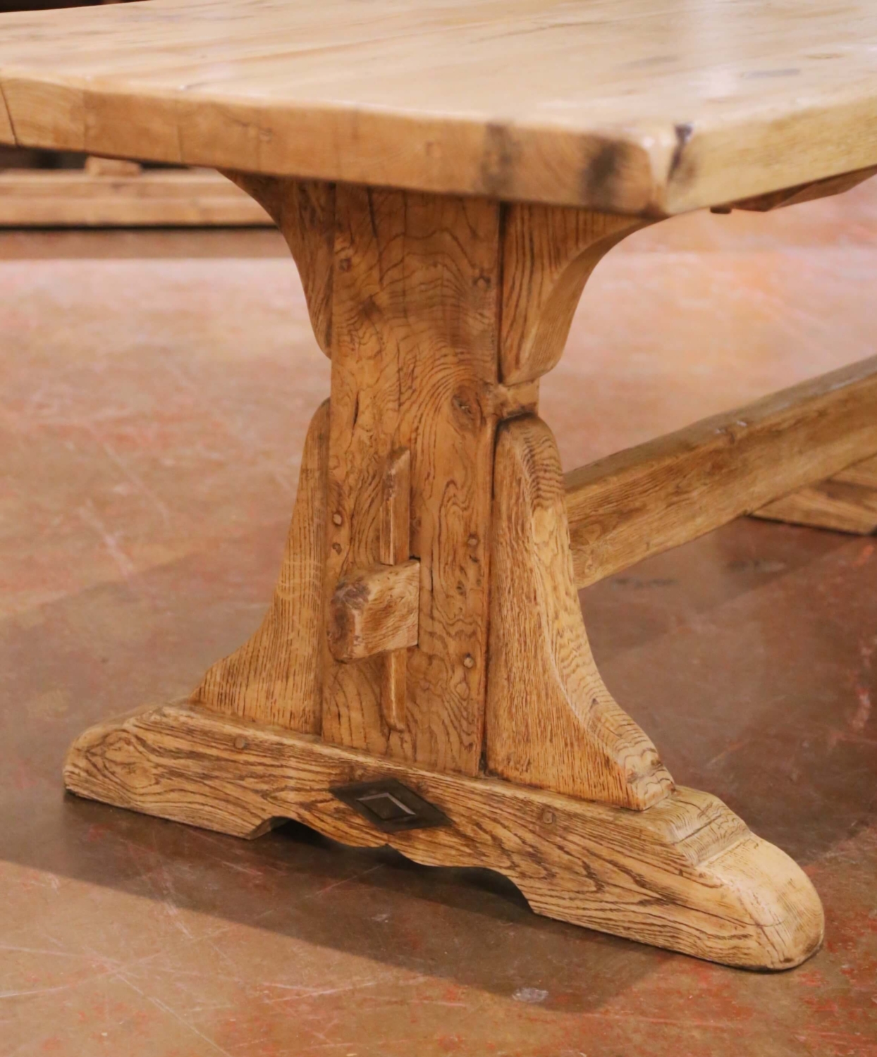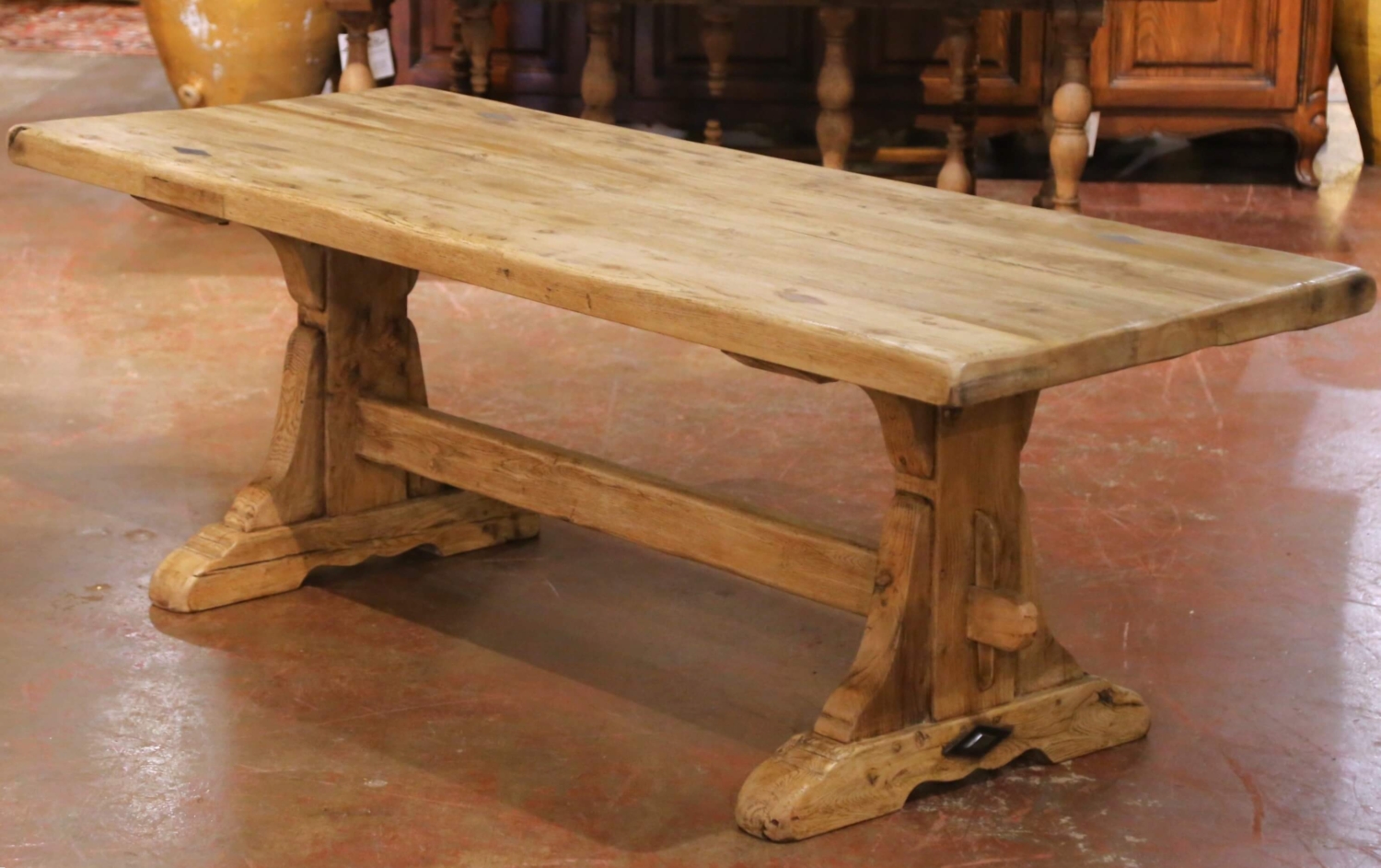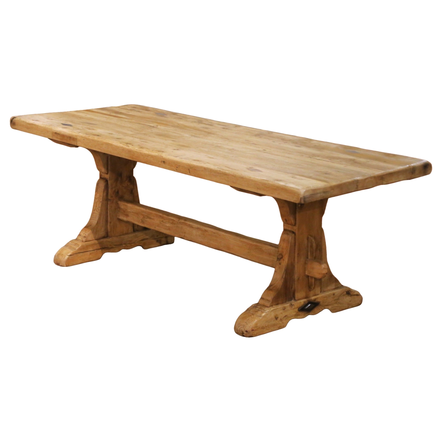 The table rests on robust trestle supports with shaped brackets, joined by a substantial mortise and tenon cross stretcher. The base terminates in stepped bridge feet, a classic feature of early French refectory and monastery tables designed for durability in communal dining halls. Traditional square peg joinery remains visible throughout the construction, further emphasizing its authentic period craftsmanship.
