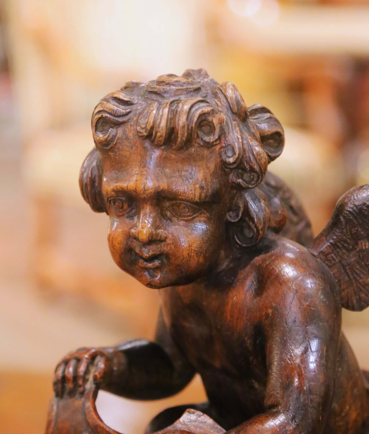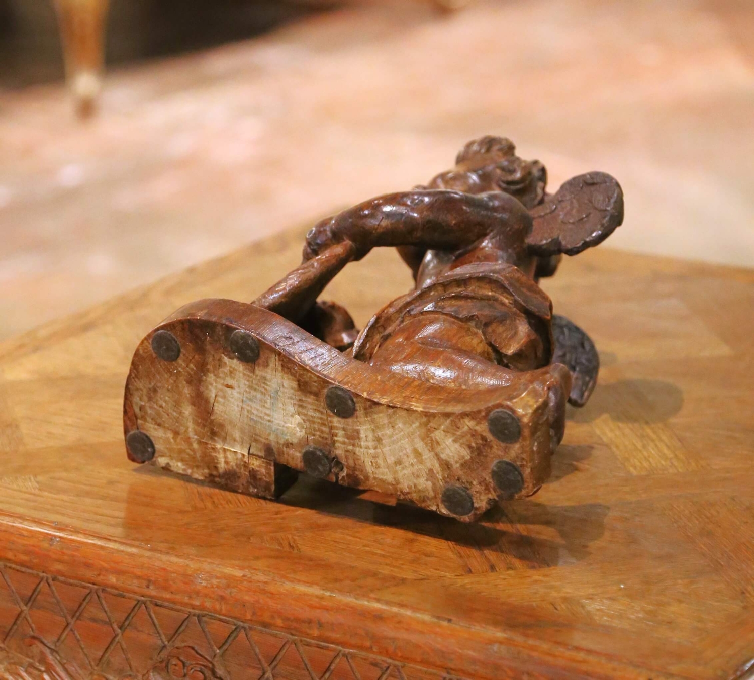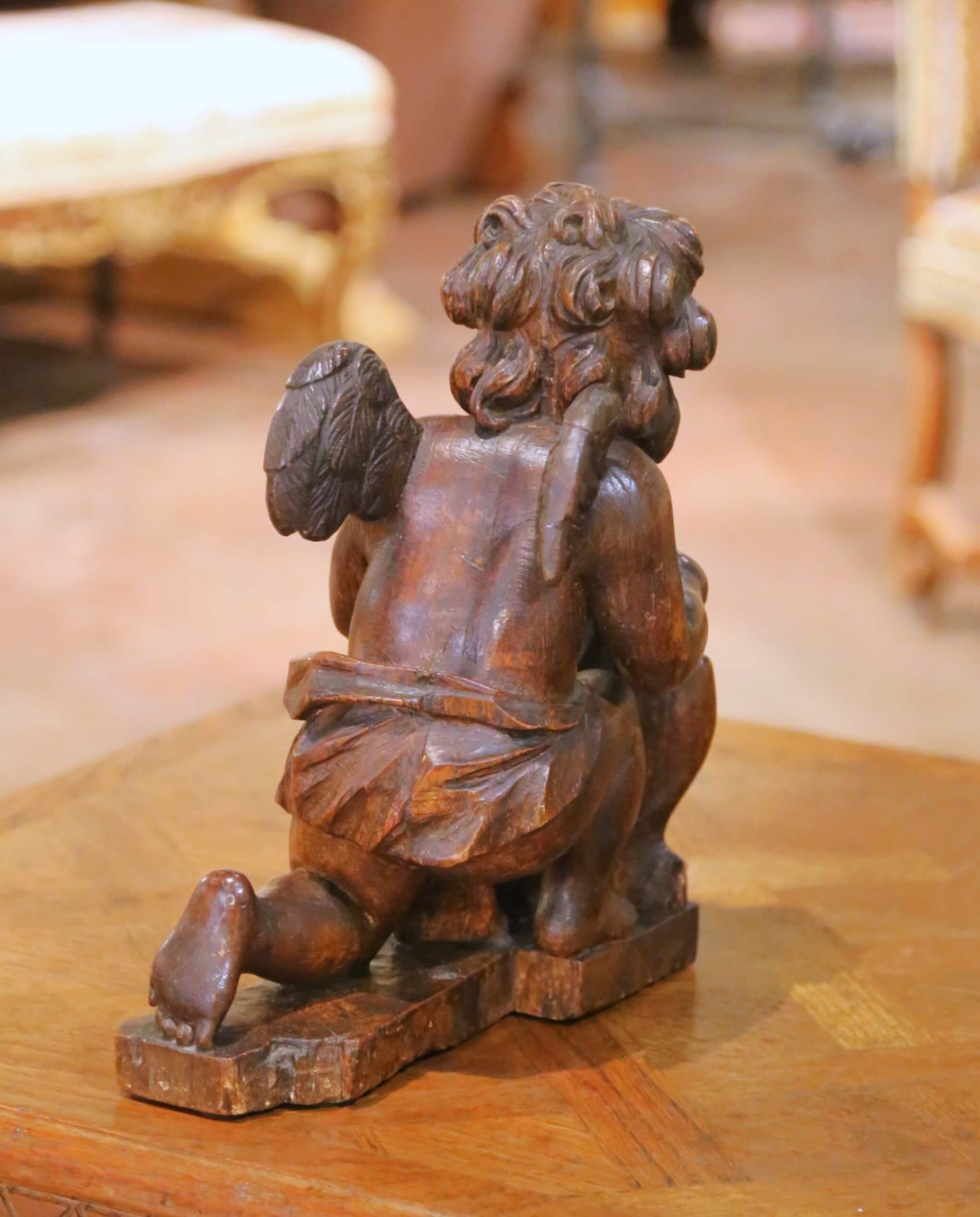 Hand-carved in France circa 1780, this exceptional antique oak sculpture depicts a kneeling winged putto presenting a heraldic shield centered with three fleur-de-lys. The composition reflects the refined decorative vocabulary of late 18th century French craftsmanship, where ecclesiastical symbolism and noble heraldry were integrated into architectural ornament. Executed from solid oak, the figure displays beautifully modeled anatomy and expressive detailing. The cherub’s softly rounded face is framed by deeply undercut curls, while the wings are carved with layered feather work that demonstrates confident hand craftsmanship. The draped cloth at the waist is rendered with fluid, naturalistic folds, adding movement to the devotional stance. The shield is framed with scrolling foliate carving and prominently decorated with three carved fleur-de-lys, emblematic of French royal symbolism. The sculpture retains a rich, darkened oak patina that enhances the depth of carving and highlights the natural grain. The underside reveals early hand-worked tool marks and age-related shrinkage consistent with 18th century construction. The antique piece is in excellent condition commensurate with age and use, with minor surface wear and natural separations typical of solid oak of this period. Likely originating as an architectural fragment from a church interior, choir stall, or noble residence, this 18th century French carving now serves beautifully as a sculptural accent on a console, library table, or mantel, bringing historical presence and sculptural character to both traditional and curated modern interiors. Dimensions: 11″W x 6.5″D x 13.75″H