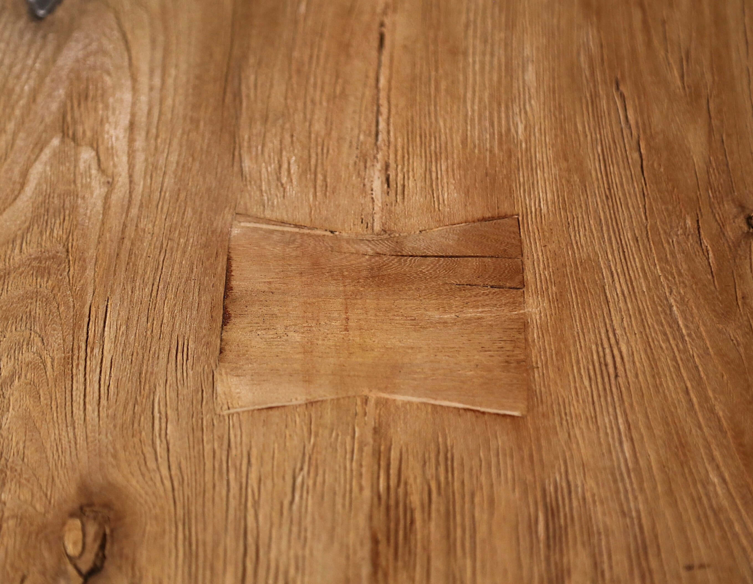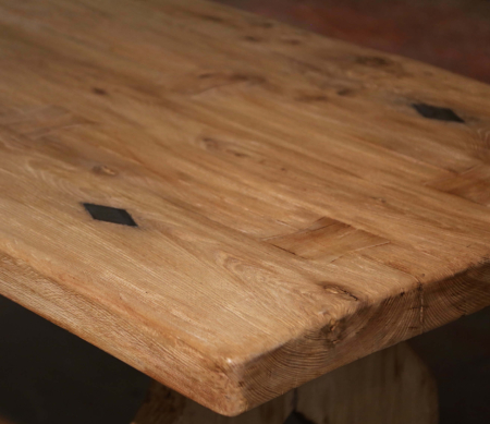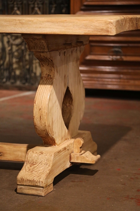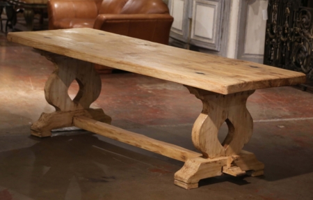 This elegant antique dining table was crafted in Normandy, France circa 1780. Built from solid oak, the long rectangular monastery table rests on bold baluster-form trestle legs with pierced centers, joined by a sturdy cross stretcher and secured with traditional mortise and tenon joinery. Each foot terminates in a molded shoe base, ensuring both strength and visual weight. The thick 2.5-inch top showcases a beautiful bleached finish that enhances the natural grain of the oak, giving the table a warm yet contemporary feel. The surface is decorated with butterfly joinery and forged iron diamond-shaped accents, both functional and decorative, underscoring its authentic Provincial character. Large in scale yet restrained in design, this Louis XIII style farm table easily accommodates 8 to 10 guests, making it ideal for a family dining room, a rustic kitchen, or even as a striking conference table. The piece is in excellent condition commensurate with age and use, boasting a well-preserved patina and desirable surface distress that adds charm and authenticity. Measures: 94″ W x 33″ D x 30″ H.