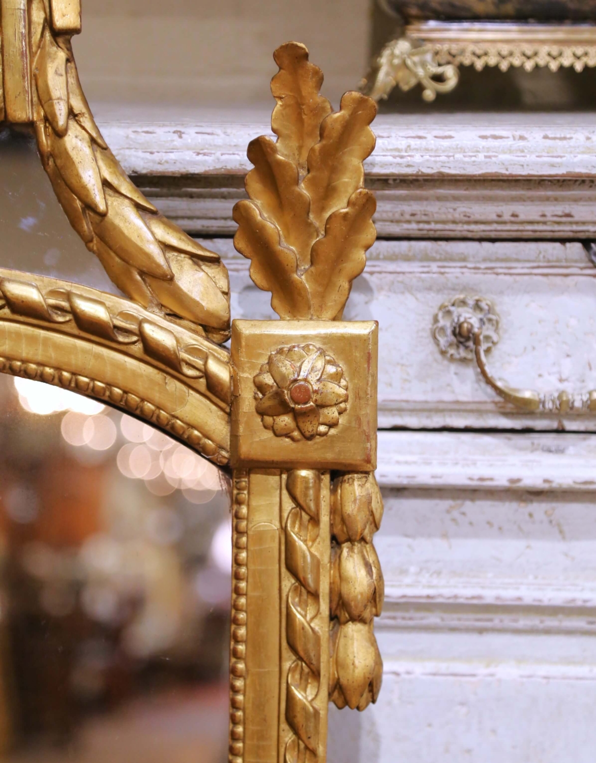 This refined antique French mirror was crafted in southern France circa 1780, and exemplifies the elegant restraint of the Louis XVI period. Carved from wood and finished in its original gilt surface, the frame is adorned with crisply defined classical motifs including twisted ribbon molding, laurel garlands, floral rosettes, and an urn-form crest surmounted by floral finials. The balanced proportions and architectural detailing give the piece a timeless presence while remaining light and graceful. The wall mirror retains its original mercury glass plate and original wooden backing, a highly desirable survival that speaks to its authenticity and quality. The glass displays gentle age-related sparkle and subtle imperfections consistent with period manufacture, adding depth and character without distracting from its clarity. The gilt finish shows warm tonal variation and fine wear commensurate with age and use, enhancing the mirror’s patina rather than detracting from it. An exceptional size for a powder room, entryway, or above a console, this antique mirror offers both decorative impact and historical integrity. Dimensions: 25.25″ W x 46.5″ H
