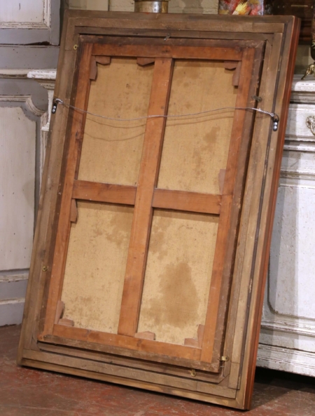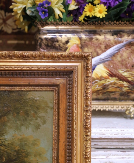 Decorate a living or dining room with this large antique French pastoral painting. Created circa 1780 and inspired by the works of François Boucher (1703–1770), the celebrated court painter to Louis XV, the oil on canvas captures the idyllic charm and gentle sensuality of Rococo art. The composition depicts a lively harvest scene, where a group of peasants gathers beneath a pear tree in full bloom. Three young women in flowing 18th-century attire collect fruit in baskets while a man ascends a ladder to pluck ripe pears from above, and another figure tends the nearby garden with a watering can. Rendered with Boucher’s characteristic lightness of touch and romantic palette, the scene blends refinement with rustic grace. The figures are softly modeled with luminous skin tones and graceful gestures, set within a verdant landscape suffused with golden light. Every detail, from the folds of the women’s dresses to the dappled foliage, reflects the artist’s mastery of elegance and atmosphere. The work beautifully captures the Rococo spirit of leisure, nature, and pastoral poetry that Boucher made famous in his fêtes galantes and mythological idylls. Presented in its original walnut frame, later enriched with a wide carved gilt trim featuring acanthus leaf and bead-and-reel motifs, the painting retains its grandeur and period authenticity. Over four feet in height, it makes a striking focal point in any refined interior. The canvas remains in excellent condition commensurate with age, with gentle craquelure and a rich surface patina enhancing its timeless character. Measures: 35.75″ W x 48.75″ H