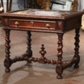 Decorate a den or game room with this elegant antique card table. Crafted in southern France circa 1780, the table stands on thick barley twist legs decorated with diamond shape medallions at the shoulder, and connected at the base with a twisted H form stretcher embellished with a central finial and floral rosettes at the corners. The top built with a oak frame and carved edges, features a inset blue onyx and marble surface decorated with a black and white checker or chess board game in the center. The table is further dressed with a large drawer across the front embellished with the original bronze knobs. The game table is in excellent condition commensurate with age and use, and adorns a rich dark oak patinated finish along with a colorful top. A true one-of-a-kind! Key and lock included. 33″W x 29″D x 29.5″H
