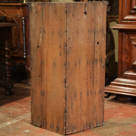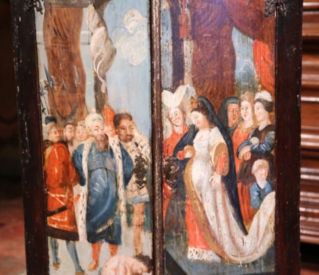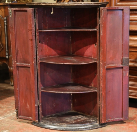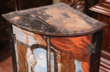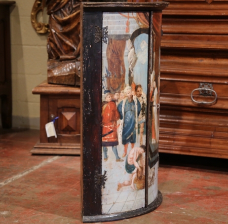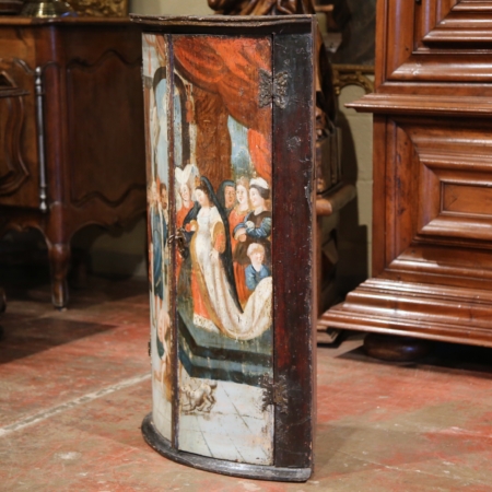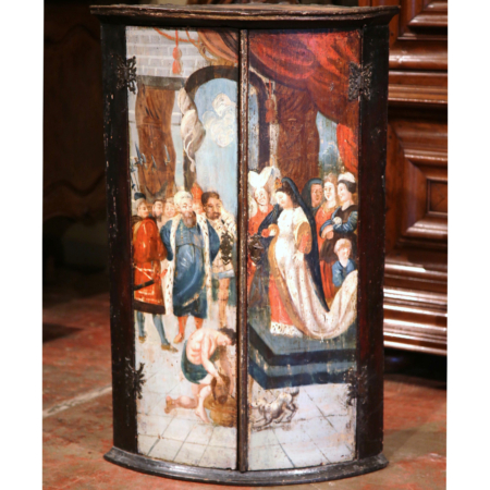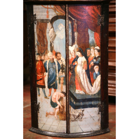 This colorful antique encoignure was created in Italy circa 1780. The triangular corner cabinet, which may also hang on a wall, features two bowed front doors hand-painted with a dramatic biblical scene depicting the presentation of Saint John the Baptist’s head to Salome before King Herod, inspired by Matthew 14. The Renaissance-style composition includes richly dressed figures, architectural drapery, and expressive faces rendered in vibrant tones of red, blue, and gold. Inside, the cabinet opens to reveal four interior shelves for convenient storage. The unique piece retains its original paint and iron hardware, showing a wonderfully aged surface and character consistent with its period. Both sculptural and functional, this devotional armadio d’angolo would make an exceptional focal point in a study, chapel, or collector’s display. Measures: 23.75″ W x 16″ D x 36.5″ H.