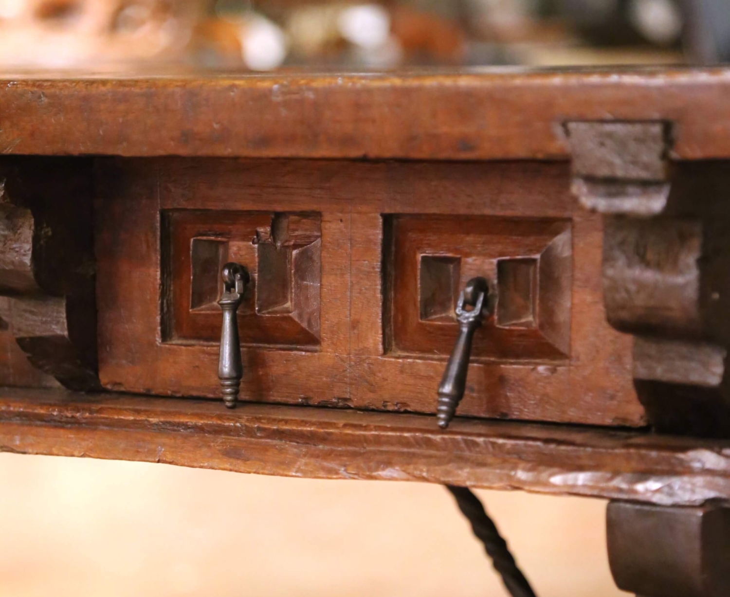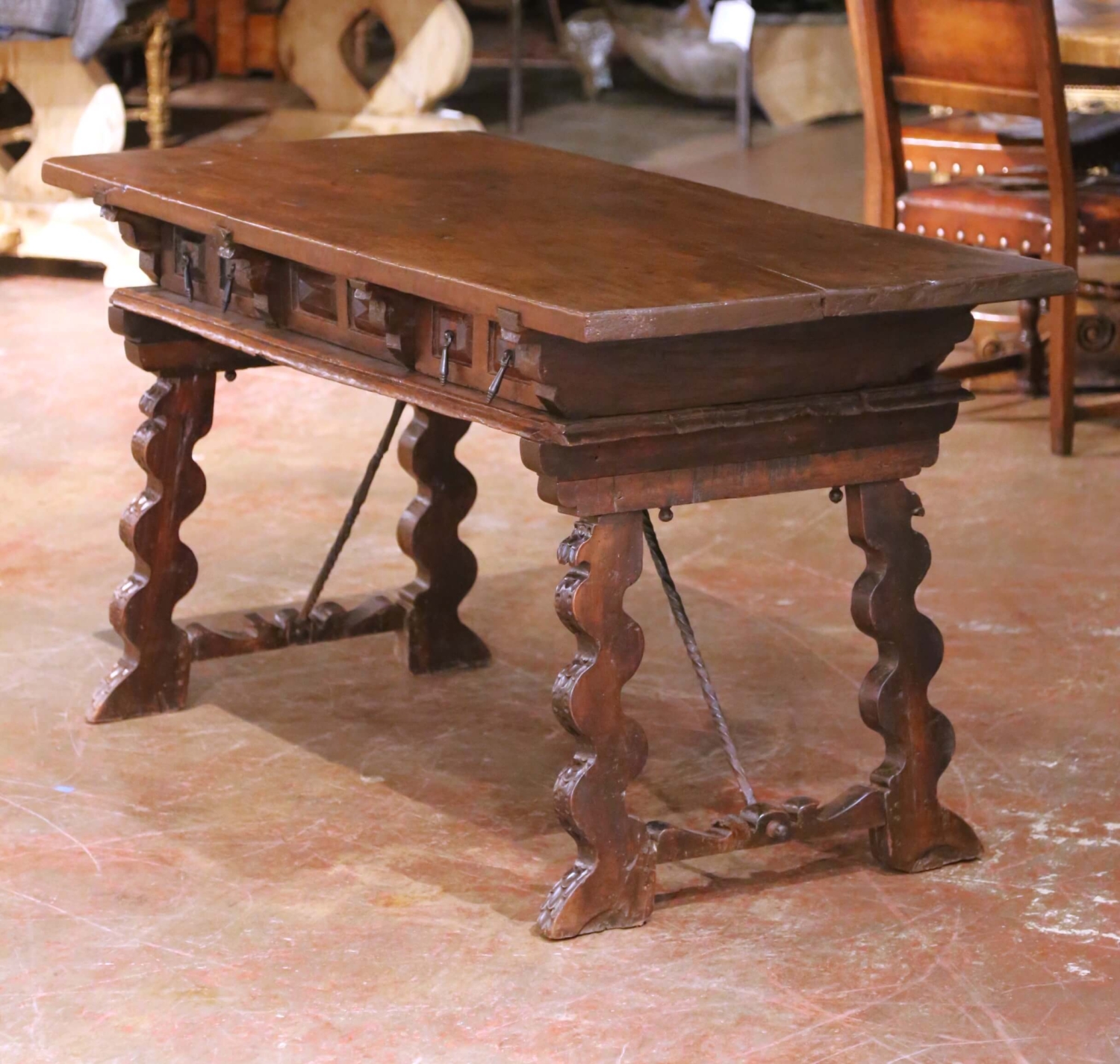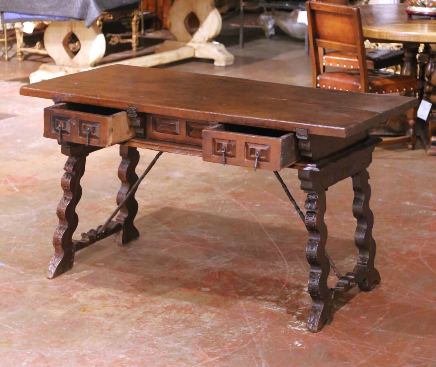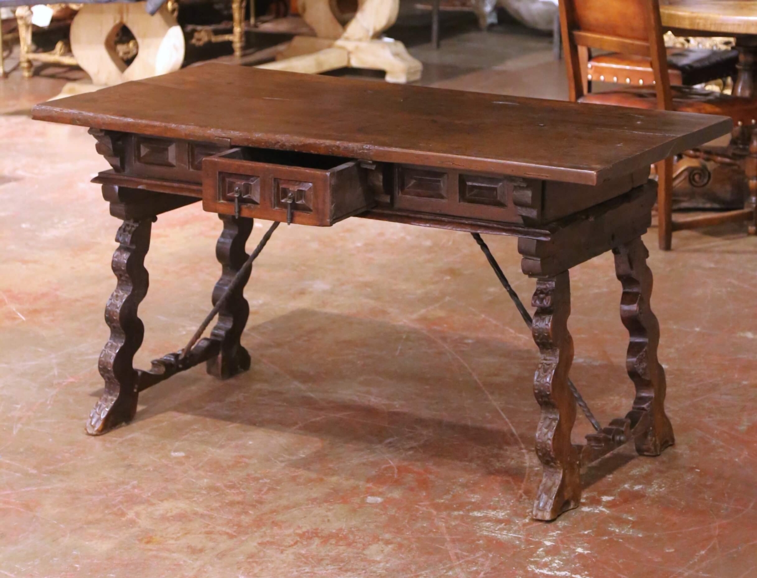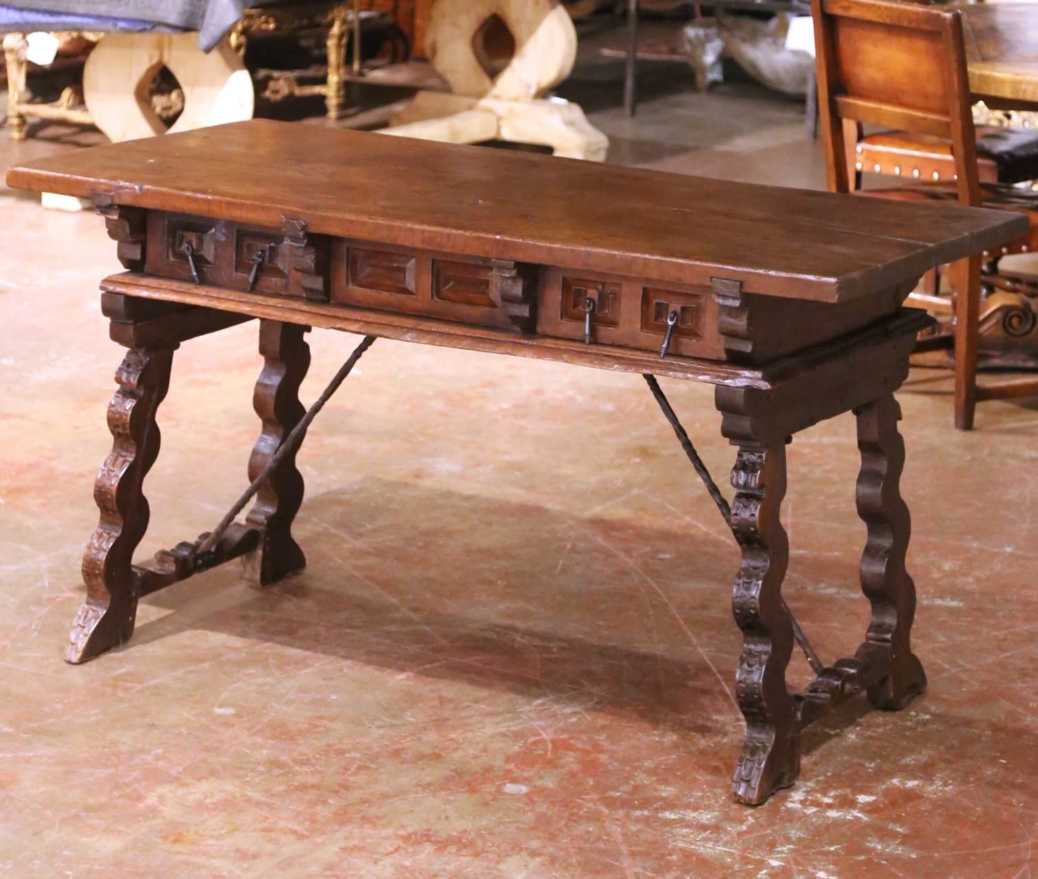 Bring timeless European elegance to your home or office with this exceptional antique partner desk, crafted in Spain circa 1780. A fine example of late Spanish Baroque design, the desk features a thick single-plank top over a beautifully carved frieze fitted with three drawers, two on one side and one on the reverse, making it ideal for two people to share. Each drawer retains its original wrought iron drop pulls and is decorated with deeply molded geometric panels, showcasing superb 18th-century craftsmanship. The desk is raised on sculptural lyre-form legs, joined by a dramatic hand-forged twisted iron stretcher that provides both strength and visual interest. The solid walnut construction boasts a warm, rich patina that has developed over nearly 250 years, lending an inviting glow to its surface. Fully finished on all sides, this piece can float elegantly in the center of a library, study, or executive office, becoming an instant focal point. Rare, functional, and full of character, this Spanish Baroque table will elevate any interior with its old-world charm. Excellent condition commensurate with age and use. Dimensions: 57.5″ W x 28.5″ D x 31.25″ H