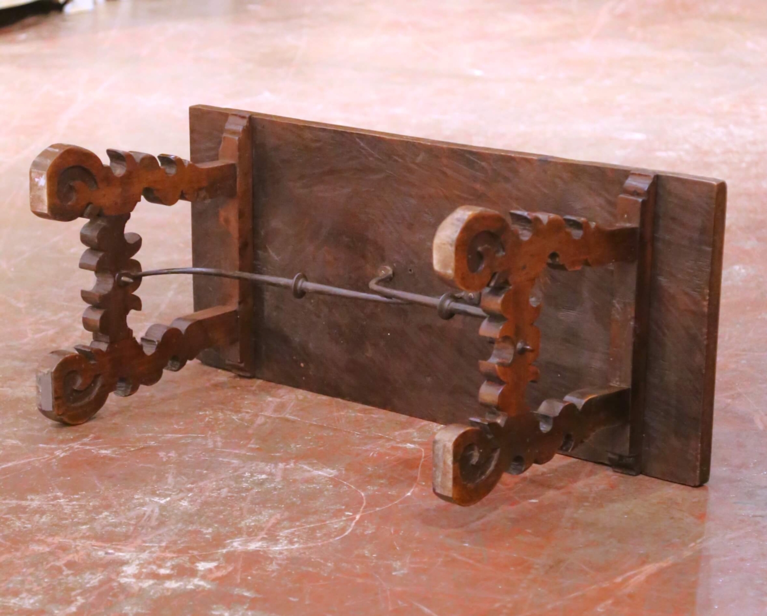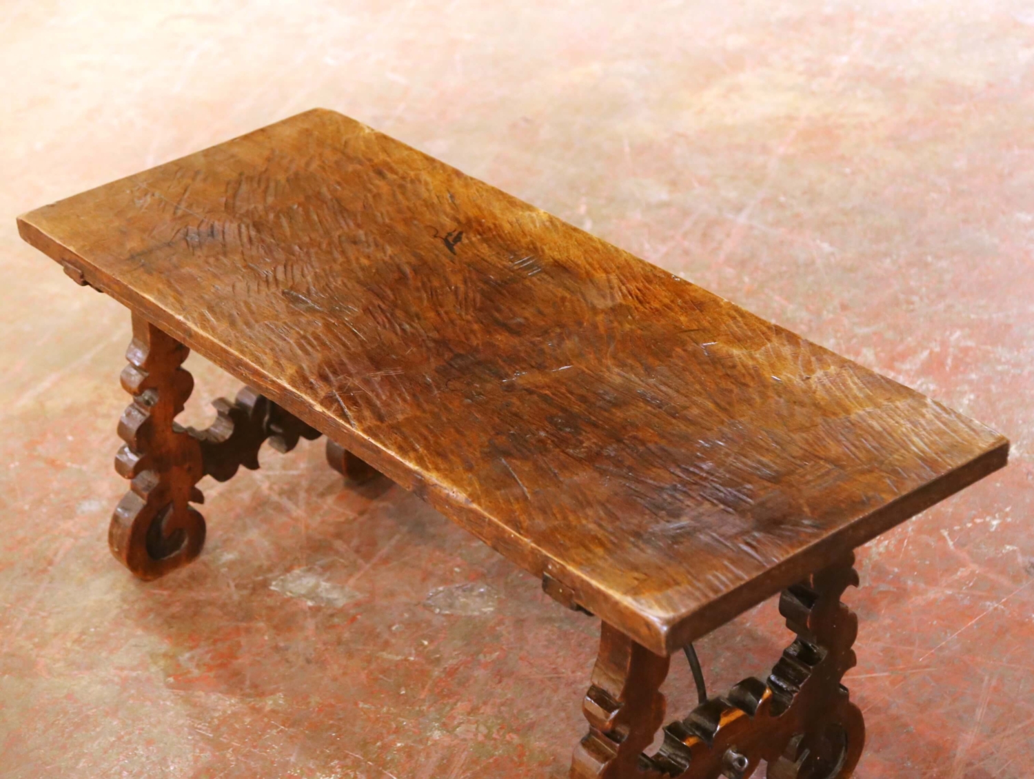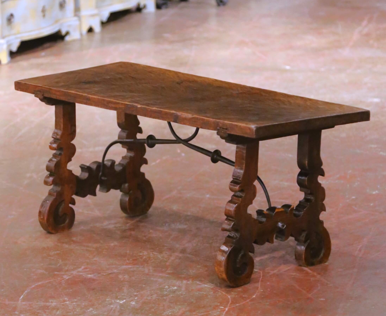 Crafted in Spain circa 1780, this elegant antique trestle coffee table is constructed of solid walnut and exemplifies the robust craftsmanship and restrained ornamentation characteristic of 18th-century Spanish furniture. The rectangular top is formed from a single thick plank of walnut, hand-hewn with an adze, with visible tool marks that preserve the expressive surface texture and attest to its early artisanal construction. The table stands on two richly carved scrolled trestle legs, sculptural in form and firmly grounded in traditional Spanish design. These supports are joined by a hand-forged iron stretcher, providing both structural integrity and a subtle decorative contrast to the warmth of the walnut. The iron retains a dark, naturally aged surface consistent with period forging techniques. This antique coffee table is in excellent condition commensurate with age and use, displaying a warm and richly developed walnut patina with honest surface wear that enhances its authenticity and character. Substantial yet refined in scale, it is well suited for a living room, den, or library, where it brings a timeless country Spanish presence and architectural depth to the interior. Dimensions: 40.25″ W x 17.5″ D x 17″ H