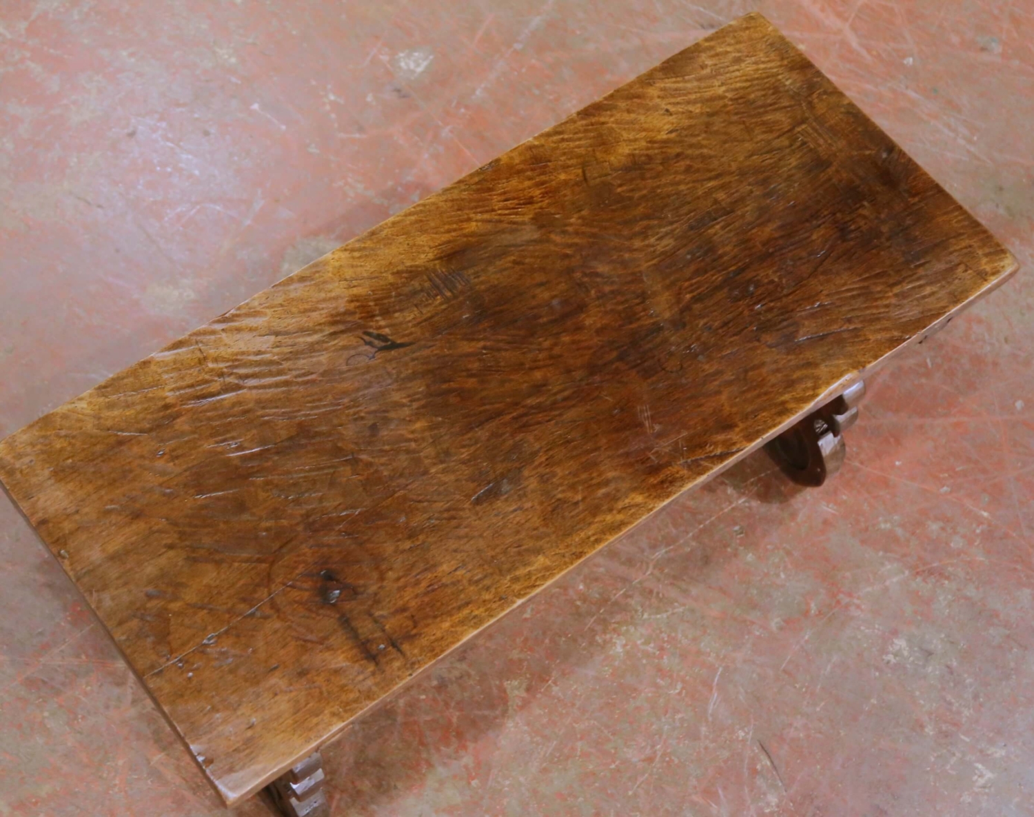 18th Century Spanish Carved Walnut Single-Plank Coffee Table with Iron Stretcher
