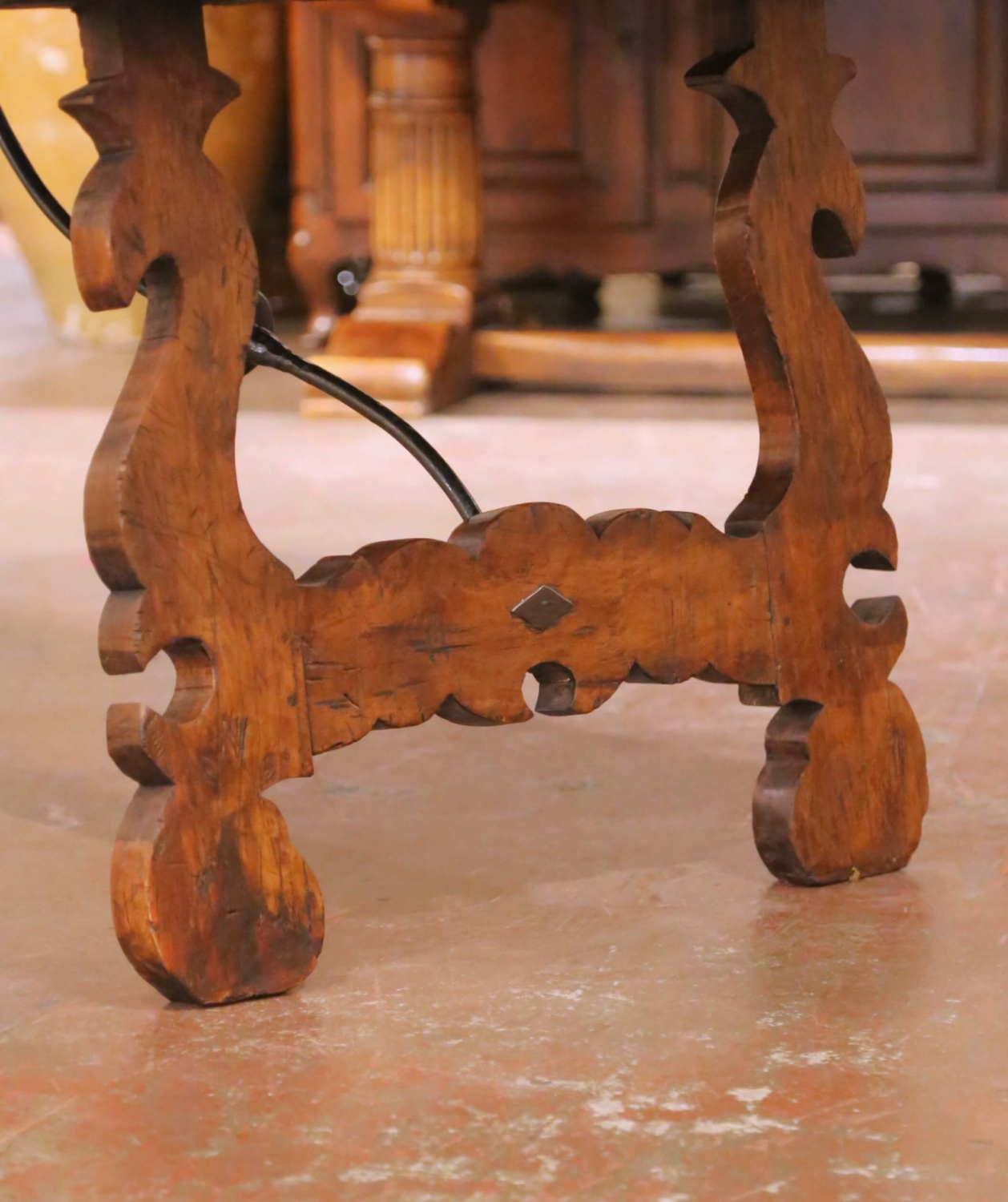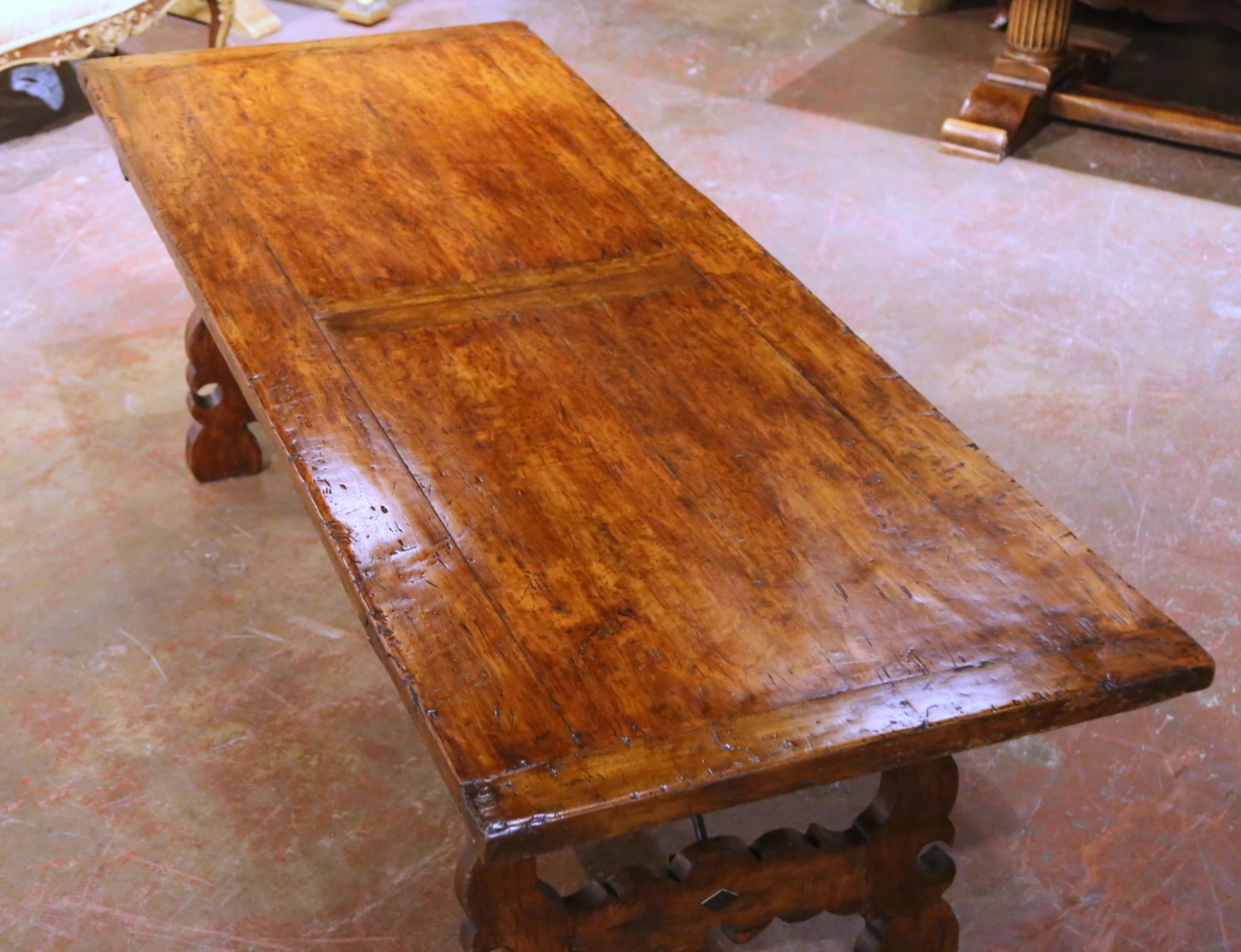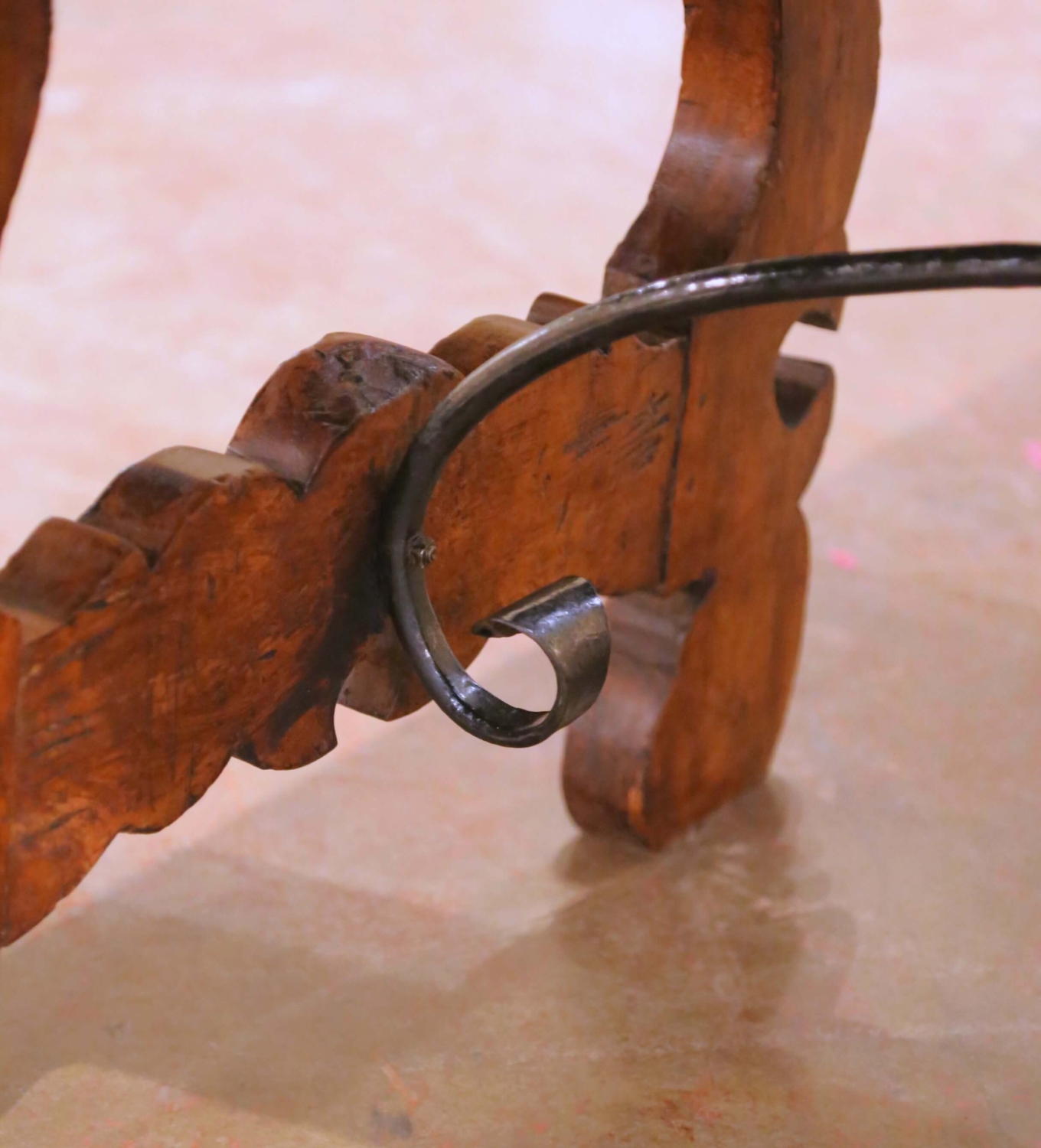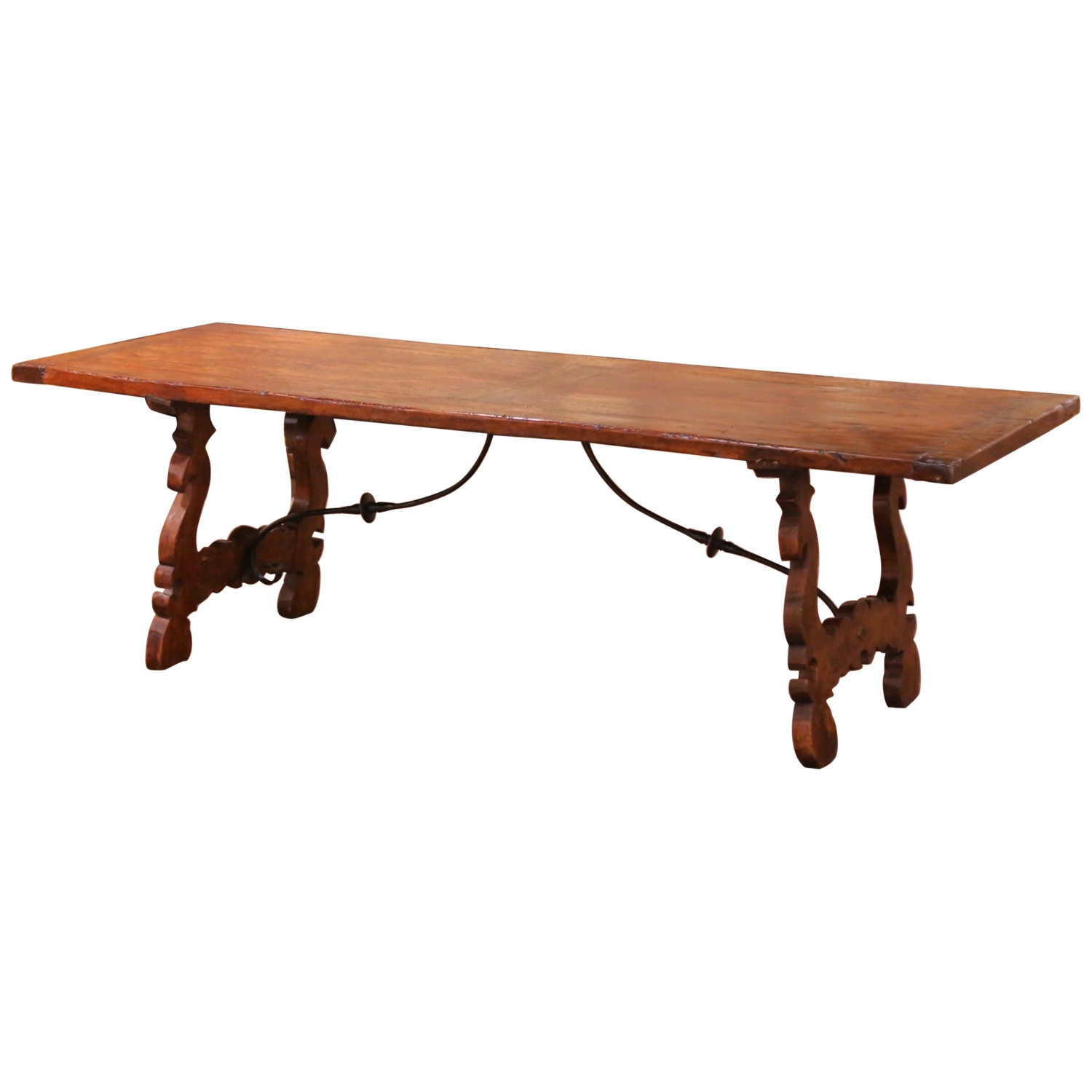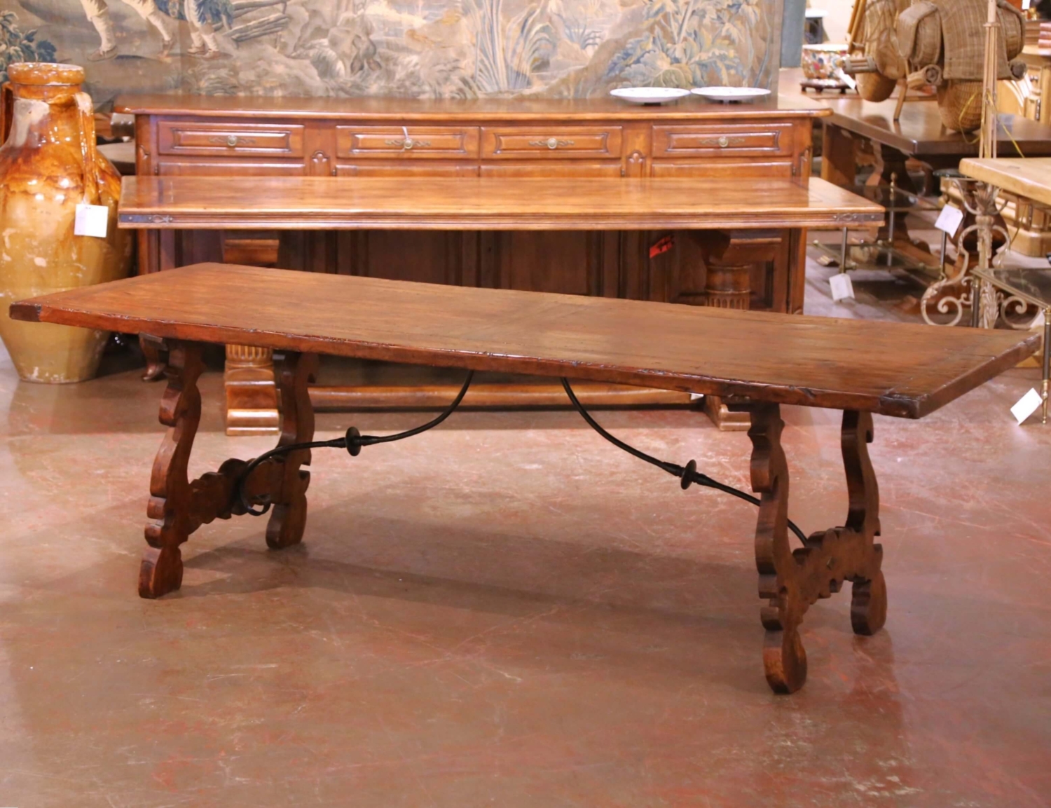The table rests on boldly sculpted trestle supports with pronounced scroll-cut legs, joined by a shaped walnut stretcher and reinforced with an original hand-forged iron tension rod, a hallmark of Spanish construction that adds both visual interest and structural integrity. The sculptural base gives the piece a strong, grounded silhouette while allowing ample legroom, making it as functional today as it was over two centuries ago. In excellent condition commensurate with age and use, this antique Spanish table is remarkably solid and well balanced, ideal for use as a grand dining table, library table, or dramatic kitchen island in both traditional and contemporary interiors.