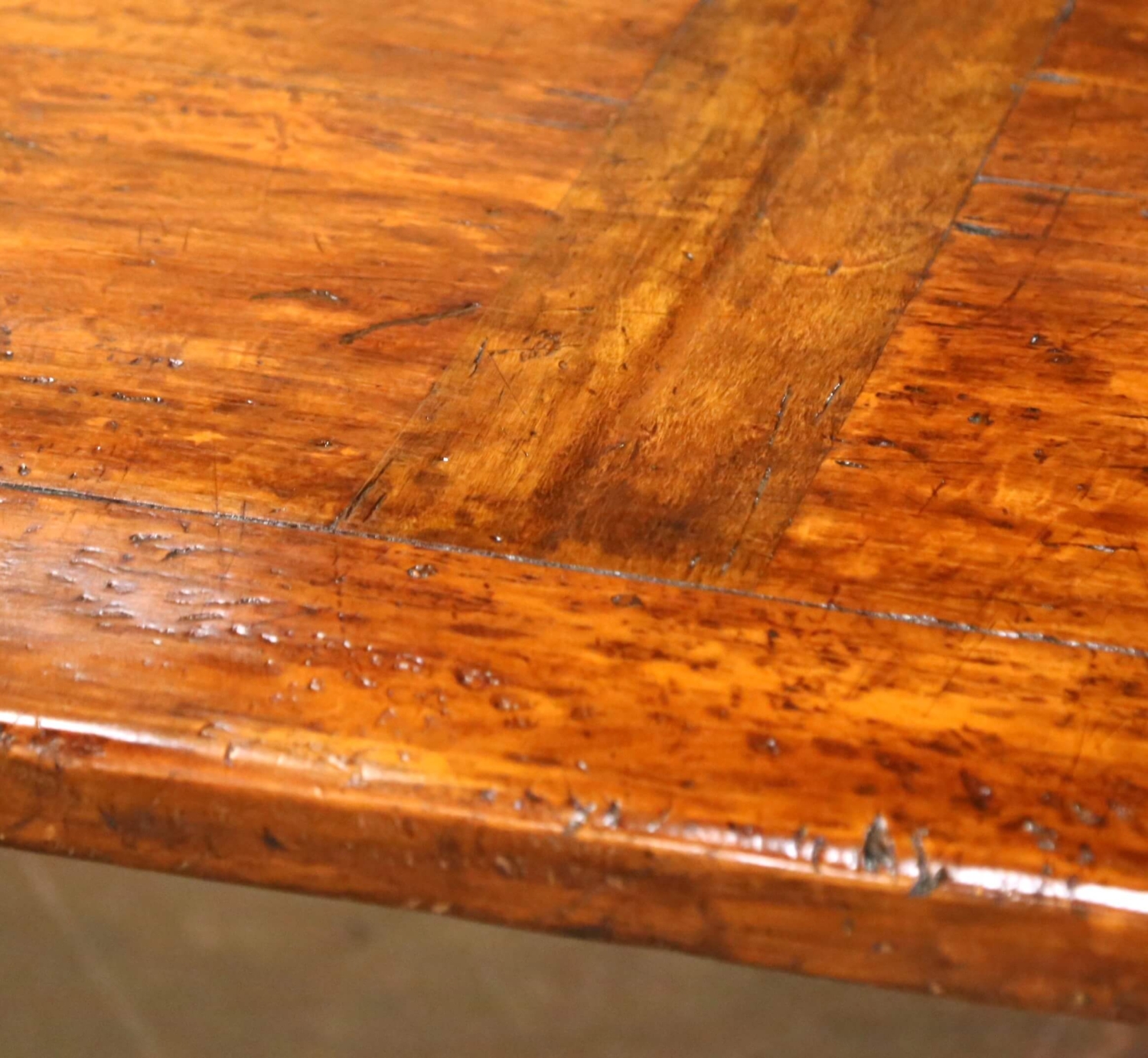 This exceptional antique 18th century Spanish refectory table, crafted in walnut circa 1780, exemplifies the robust elegance and architectural presence characteristic of Spanish Baroque and rural monastic furniture. Measuring a generous 8 feet in length, the table was originally designed for communal dining in a refectory or large farmhouse setting and would comfortably seat 8 to 10 guests. The long rectangular top is constructed from thick, hand-planed walnut planks, showcasing expressive grain, visible tool marks, age cracks, and centuries of honest wear that speak to its authentic use and history. The surface retains a deep, warm walnut patina with rich tonal variation and beautifully softened edges, offering a tactile record of time and craftsmanship.