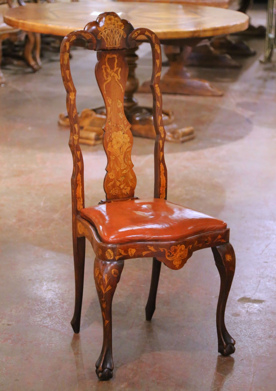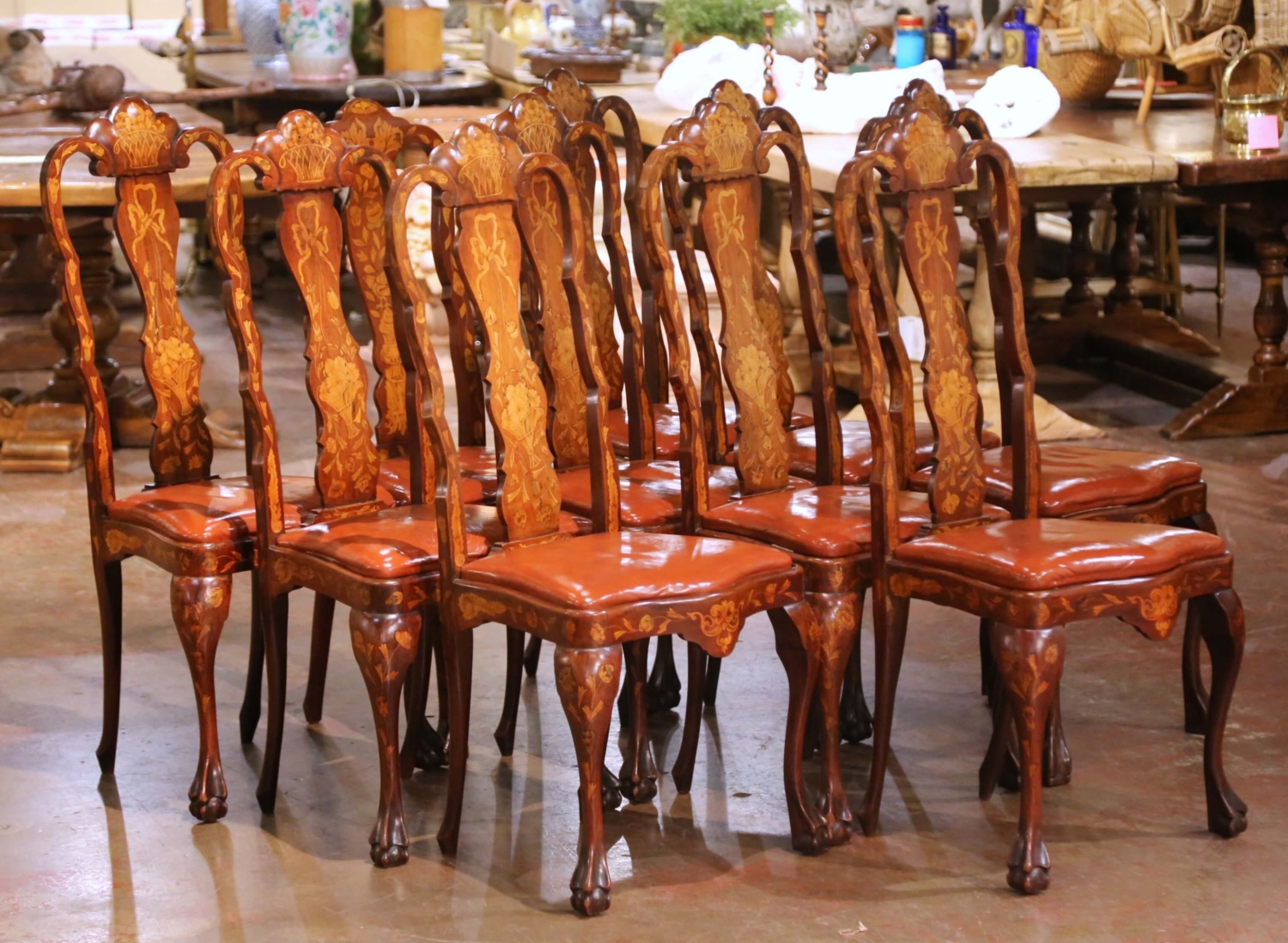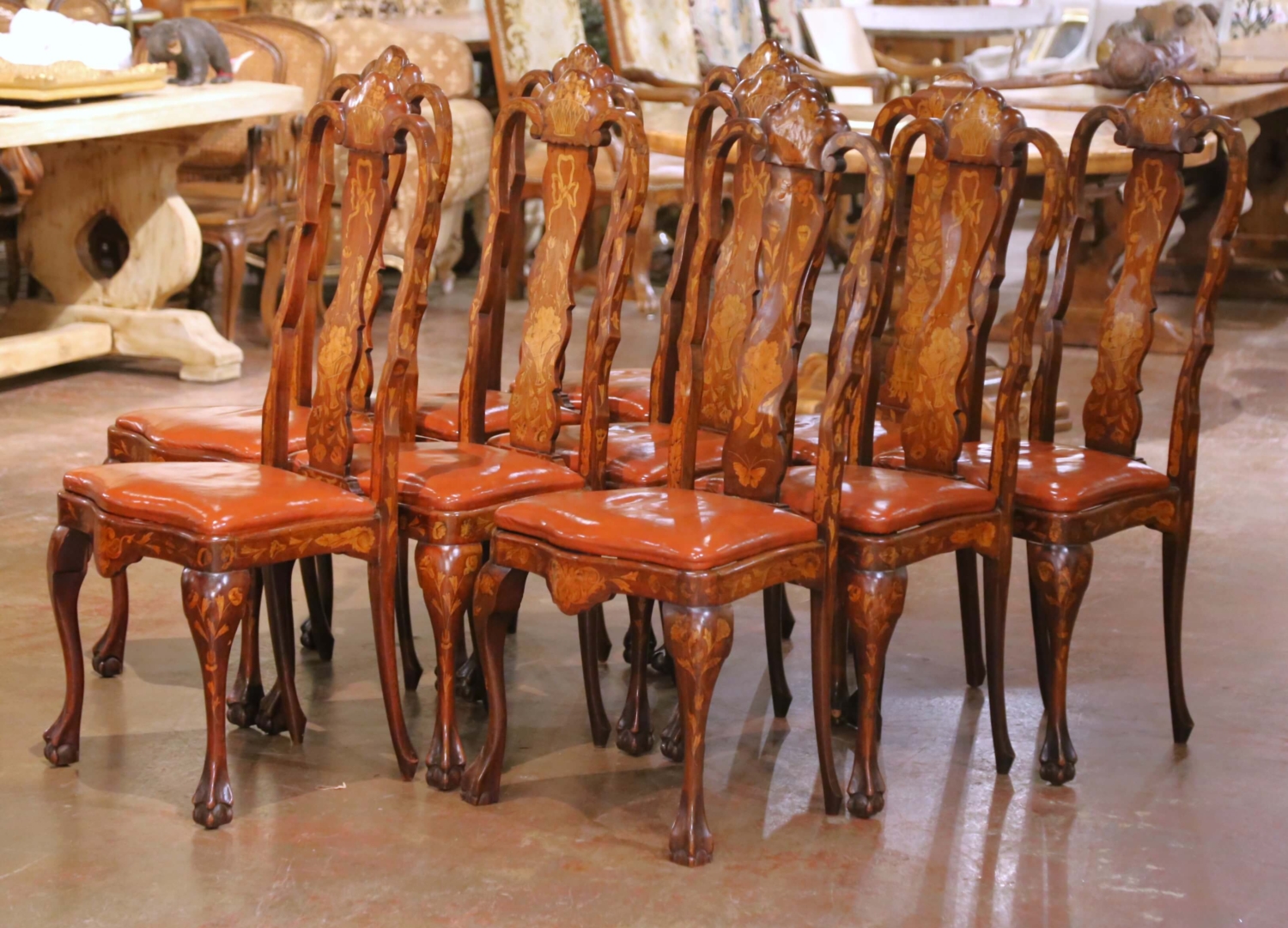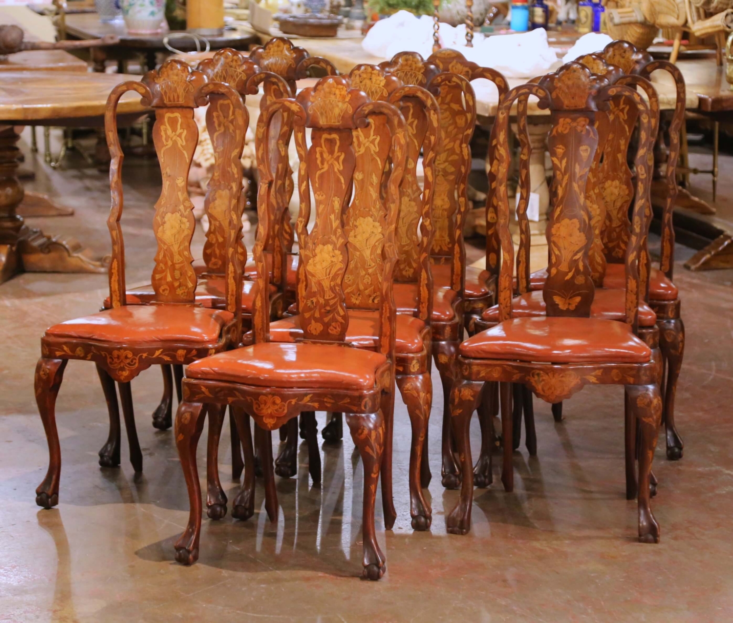 19th C. Dutch Baroque Walnut Inlaid Dining Chairs with Leather Seats, Set of 10