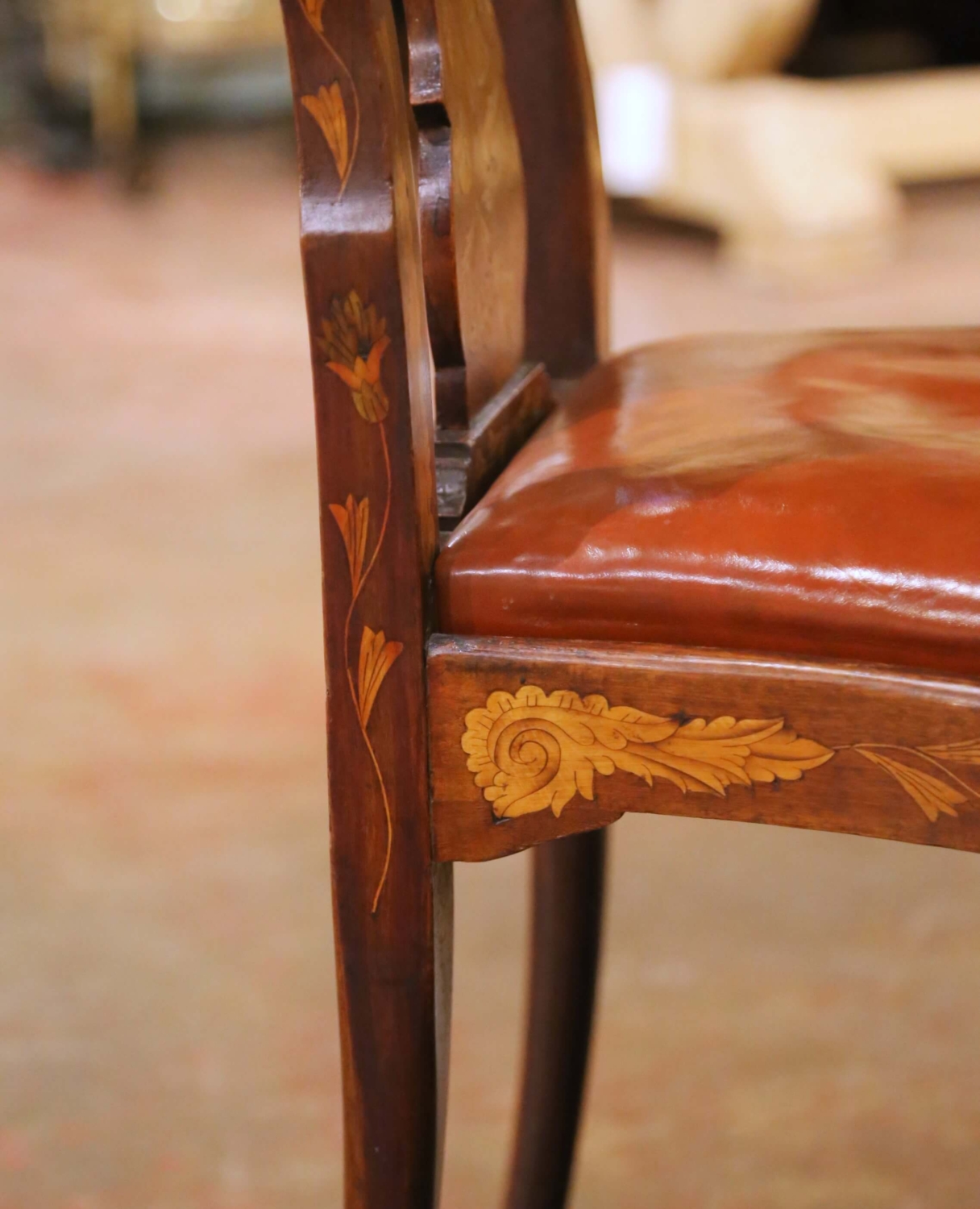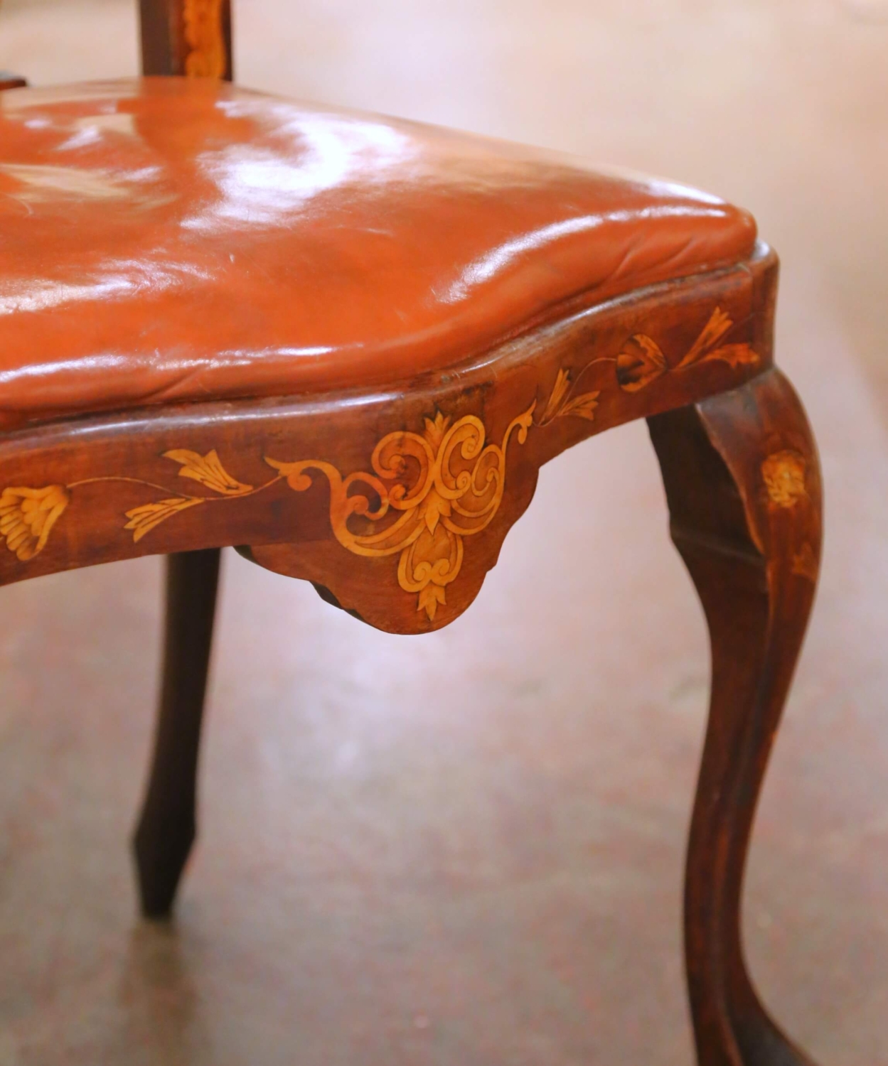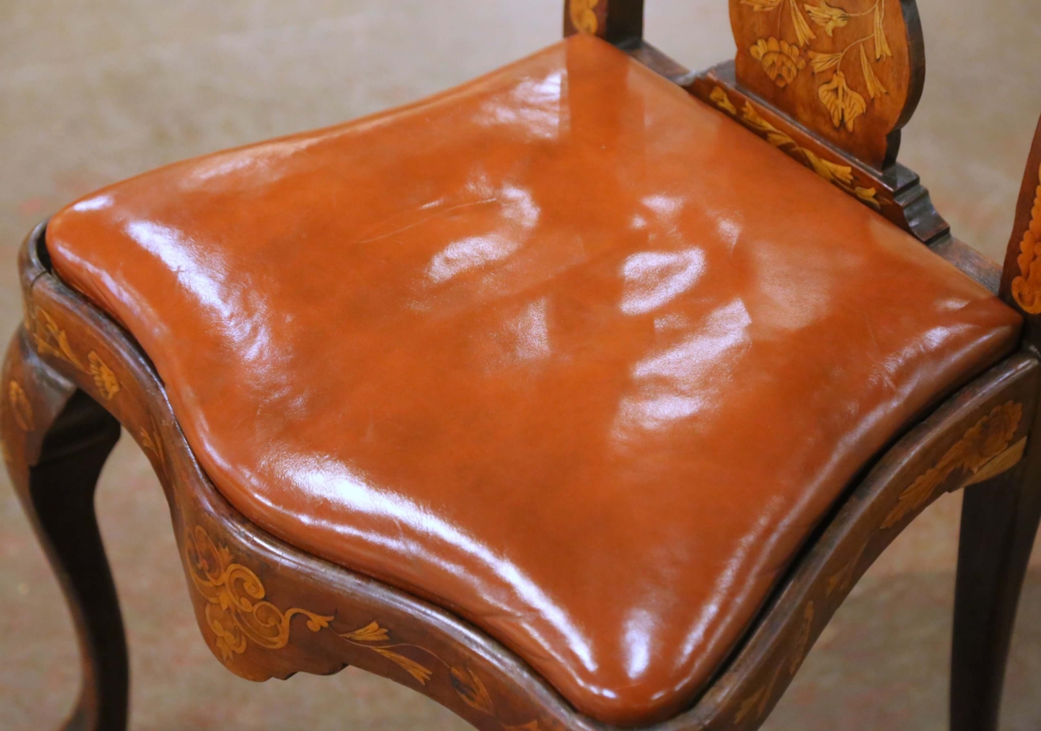 This impressive set of ten antique dining chairs was crafted in the Netherlands circa 1890 and exemplifies the exuberant decorative language of the Dutch Baroque Revival. Executed in solid walnut, each chair is richly embellished with fine marquetry inlay featuring floral baskets, scrolling foliage, ribbon-tied motifs, and stylized botanical designs extending across the backs, splats, legs, and aprons. The depth and consistency of the inlay work reflect skilled cabinetmaking and a strong continental tradition of ornamentation. The chairs present elegant pierced and scrolled backs with flowing uprights, paired with cabriole front legs and gracefully curved rear legs, giving the set a refined yet animated silhouette. Nine chairs share the same decorative scheme, while one chair displays a slightly different inlay motif, a detail commonly encountered in authentic antique sets and consistent with period workshop production or later completion. The seats are upholstered in warm cognac-toned leather, beautifully aged with a rich patina, natural creasing, and surface wear commensurate with age and use. The leather harmonizes perfectly with the warm wood tones and enhances the overall character and authenticity of the set. Structurally sound and visually cohesive, these antique chairs are well suited for a formal dining room, grand breakfast room, or statement table in a refined European interior. Excellent condition commensurate with age and use. Each chair measures: 20.5″W x 18.5″D x 45″H seat: 19.5″ high