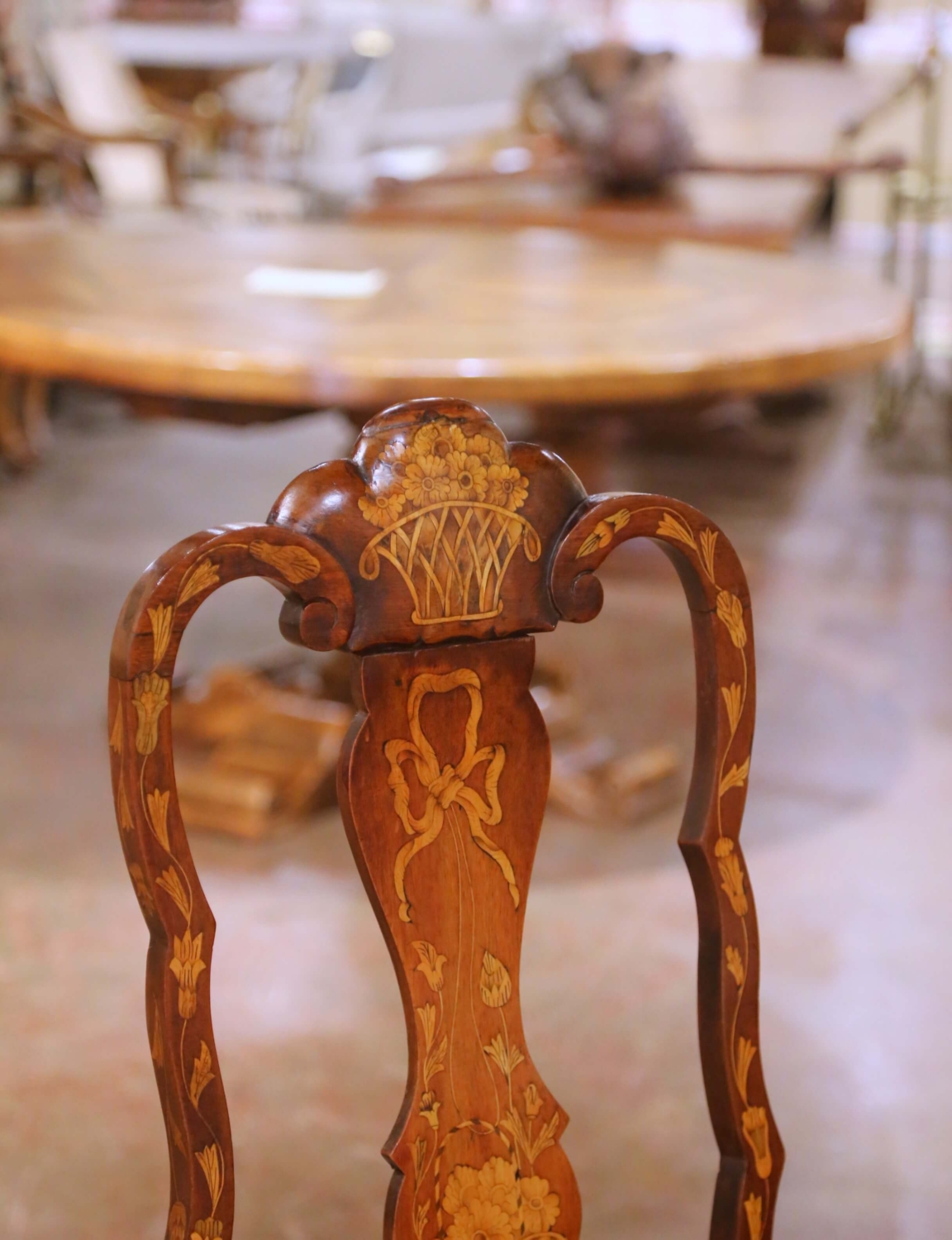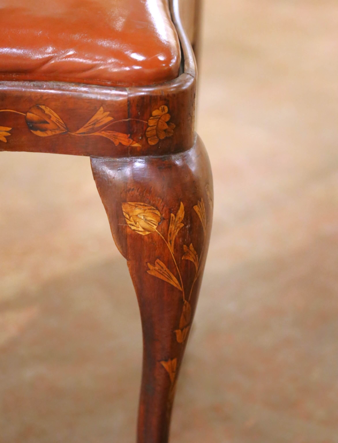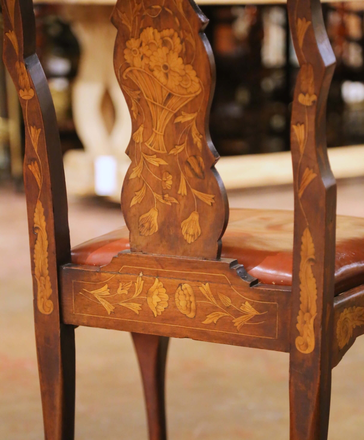 This impressive set of ten antique dining chairs was crafted in the Netherlands circa 1890 and exemplifies the exuberant decorative language of the Dutch Baroque Revival. Executed in solid walnut, each chair is richly embellished with fine marquetry inlay featuring floral baskets, scrolling foliage, ribbon-tied motifs, and stylized botanical designs extending across the backs, splats, legs, and aprons. The depth and consistency of the inlay work reflect skilled cabinetmaking and a strong continental tradition of ornamentation. The chairs present elegant pierced and scrolled backs with flowing uprights, paired with cabriole front legs and gracefully curved rear legs, giving the set a refined yet animated silhouette. Nine chairs share the same decorative scheme, while one chair displays a slightly different inlay motif, a detail commonly encountered in authentic antique sets and consistent with period workshop production or later completion. The seats are upholstered in warm cognac-toned leather, beautifully aged with a rich patina, natural creasing, and surface wear commensurate with age and use. The leather harmonizes perfectly with the warm wood tones and enhances the overall character and authenticity of the set. Structurally sound and visually cohesive, these antique chairs are well suited for a formal dining room, grand breakfast room, or statement table in a refined European interior. Excellent condition commensurate with age and use. Each chair measures: 20.5″W x 18.5″D x 45″H seat: 19.5″ high