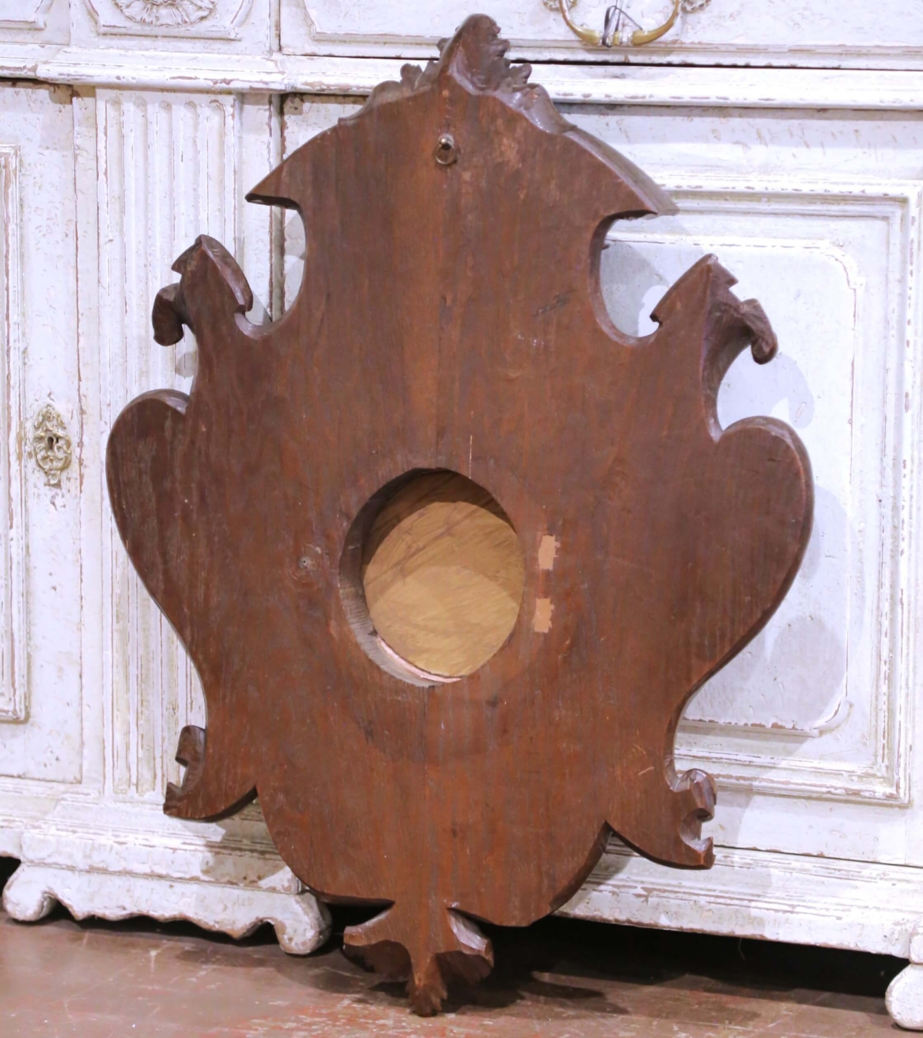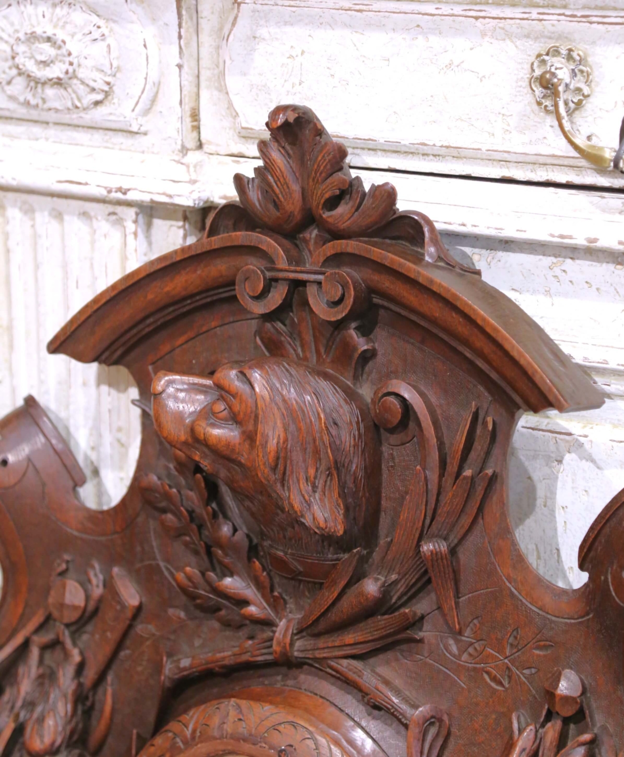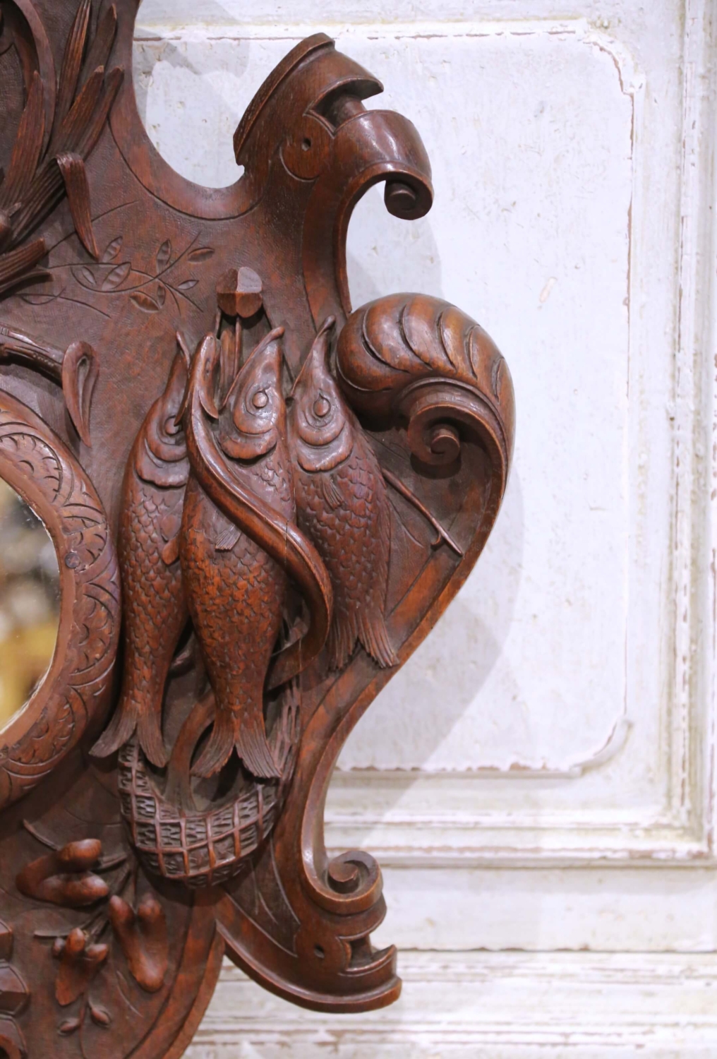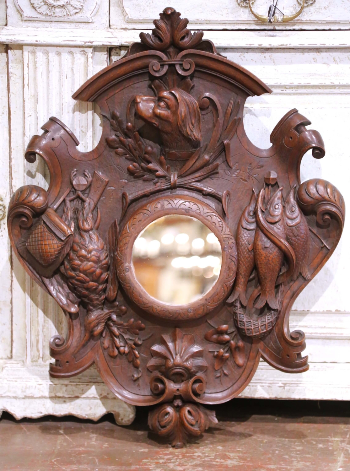 Bring character and storytelling to a study, lodge-style living room, or entryway with this impressive antique Black Forest wall piece, carved in France circa 1880 and later converted from a clock case into a round-framed mirror. Executed in richly patinated walnut, the plaque showcases the deep relief carving and naturalistic detailing typical of high-quality 19th-century Black Forest work. At the crest, a finely rendered hunting dog emerges from a wreath of oak leaves and branches, while the sides feature classic game motifs: a trio of fish suspended in a woven basket on one side and a hanging fowl with hunting pouch and powder horn on the other. Scrolling acanthus leaves, foliage sprays, and a bold shell motif anchor the composition, all carved with remarkable texture and dimensionality. The central circular opening now houses a mirror, retaining the original carved surround with incised leaf patterns. The walnut displays a warm, even patina that enhances the crispness of every hand-tooled detail. Excellent condition commensurate with age and use, this striking wall piece makes an evocative decorative statement in any nature-inspired or rustic interior. Measures: 26.75″ W x 34.5″ H x 4″ D.
