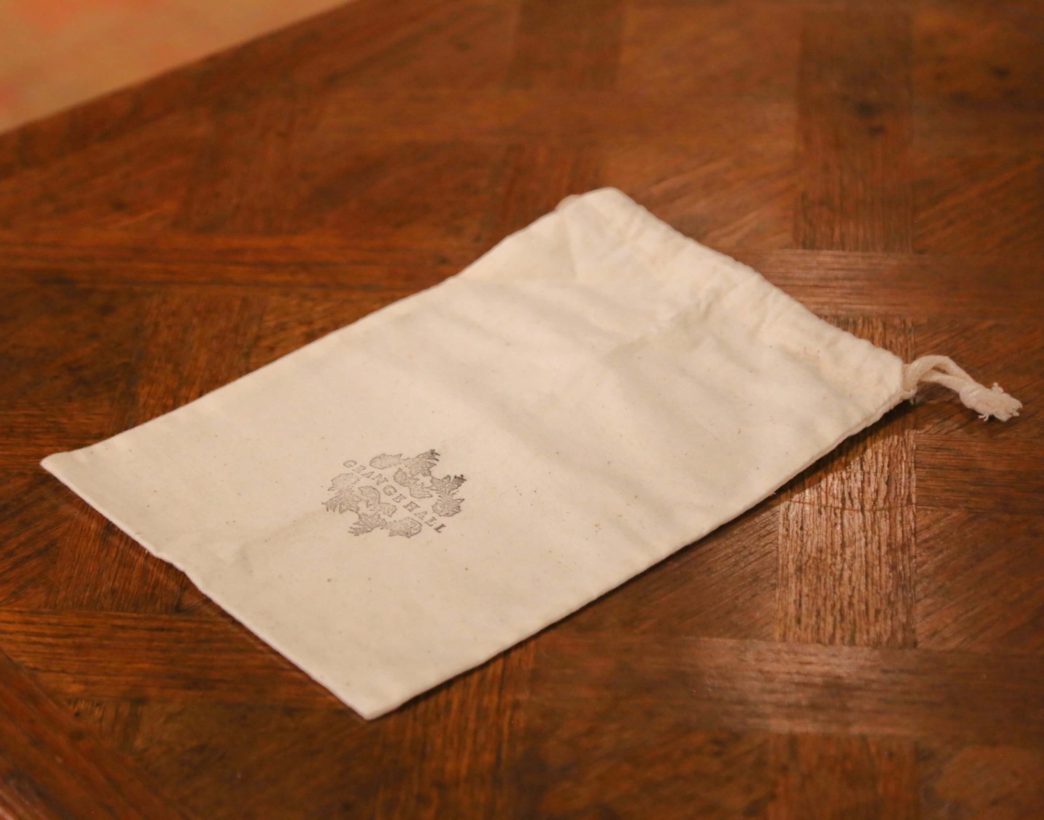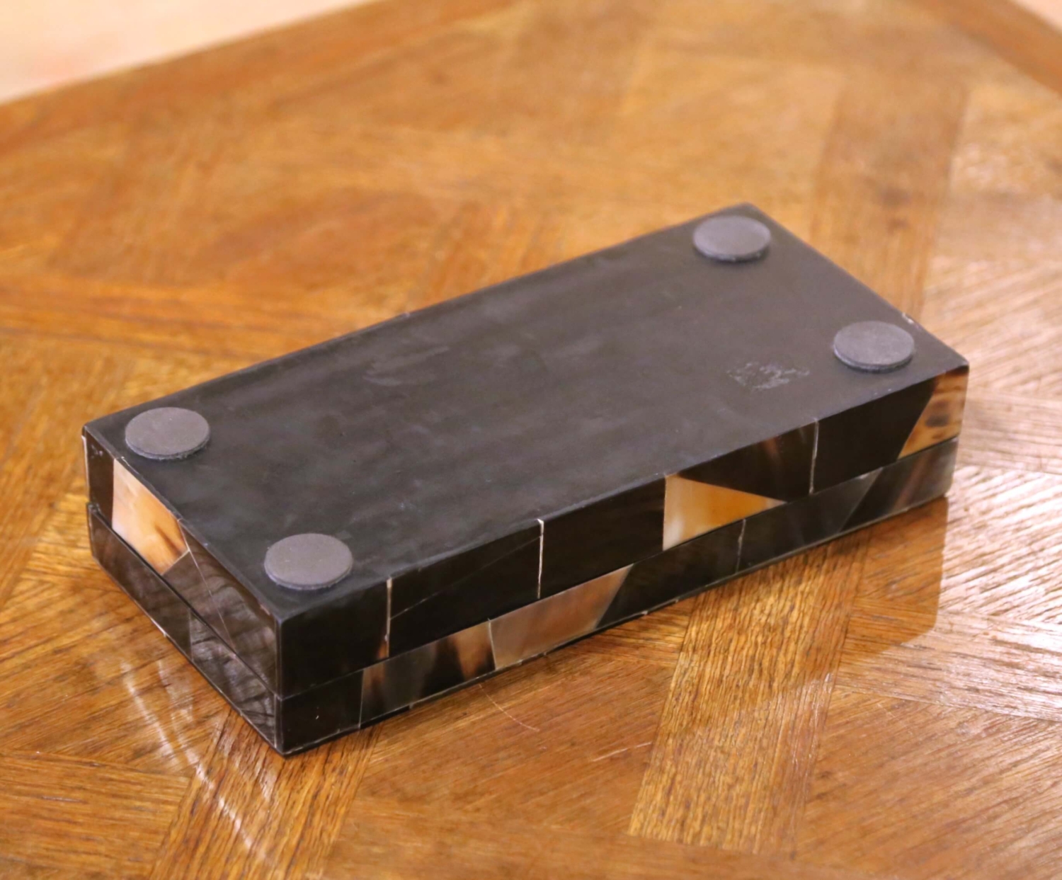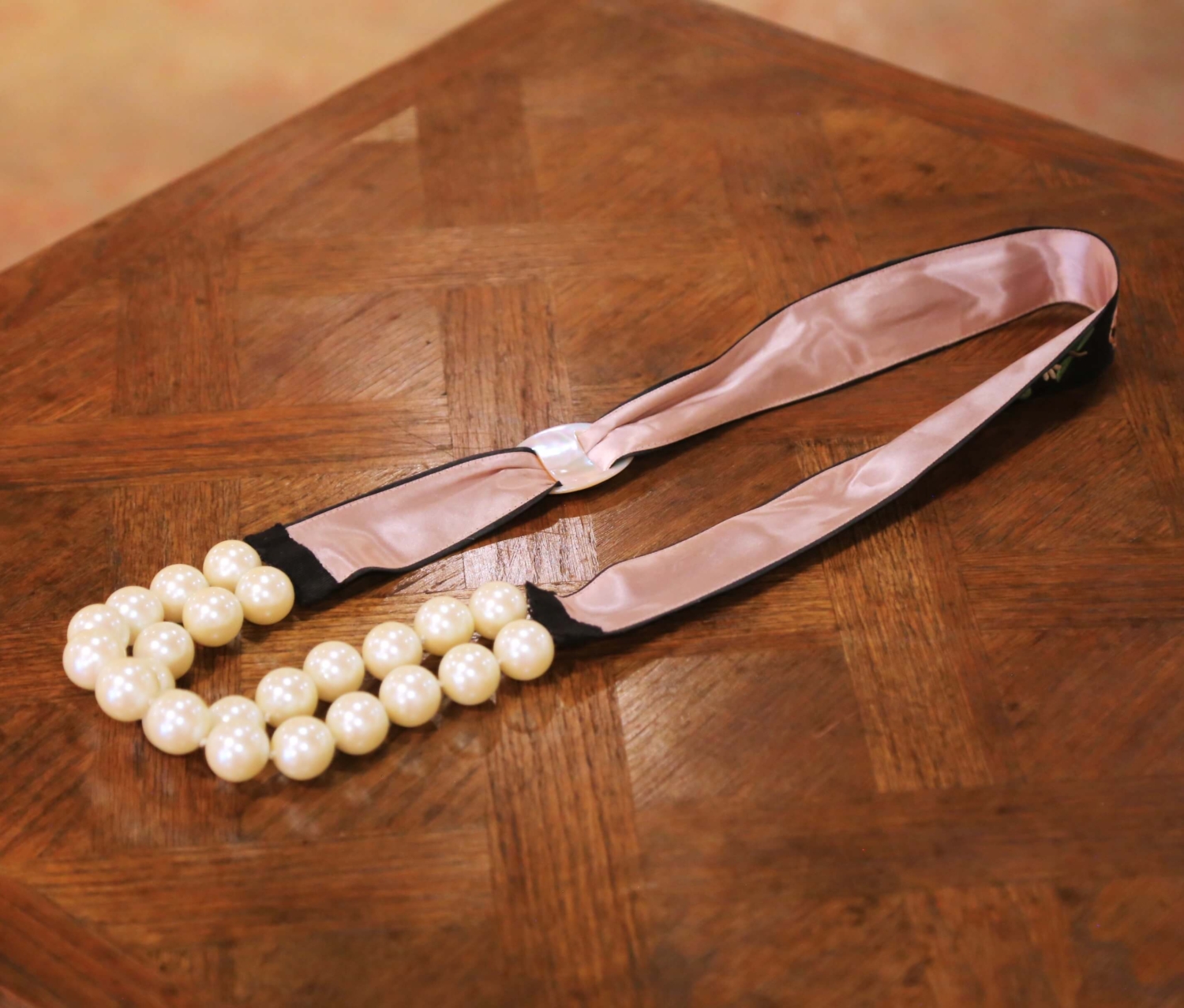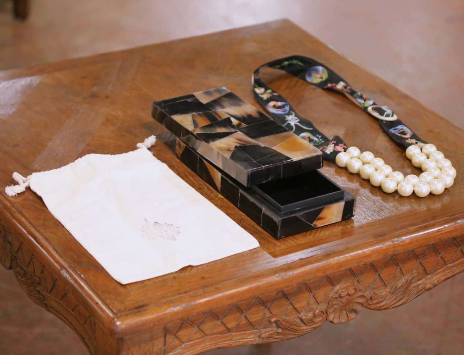 Dress a vanity, dressing table, or étagère with this elegant antique French accessory set, featuring a 19th-century horn mosaic box paired with an embroidered ribbon pearl necklace. The rectangular box is crafted in France circa 1880 from hand-cut horn panels arranged in a geometric pattern, showcasing natural variations in caramel, ivory, and deep espresso tones. Smoothly polished throughout, the box opens to a matte black interior suitable for storing jewelry, keepsakes, or desk items, and rests on protective pads to preserve delicate surfaces. The necklace, likely created later but inspired by 19th-century French fashion ribbons, features large lustrous faux pearls attached to a soft black textile band richly embroidered with floral and avian motifs. A mother-of-pearl style ring allows the ribbon to adjust or tie, giving the piece a graceful and decorative presence whether worn or displayed. Both items are in excellent condition commensurate with age and use and come with their original Grange Hall drawstring pouch, making this a charming addition to a bedroom, dressing room, or boutique display. Box measures: 10.25″ W x 5″ D x 2.25″ H. Necklace: 18″ long