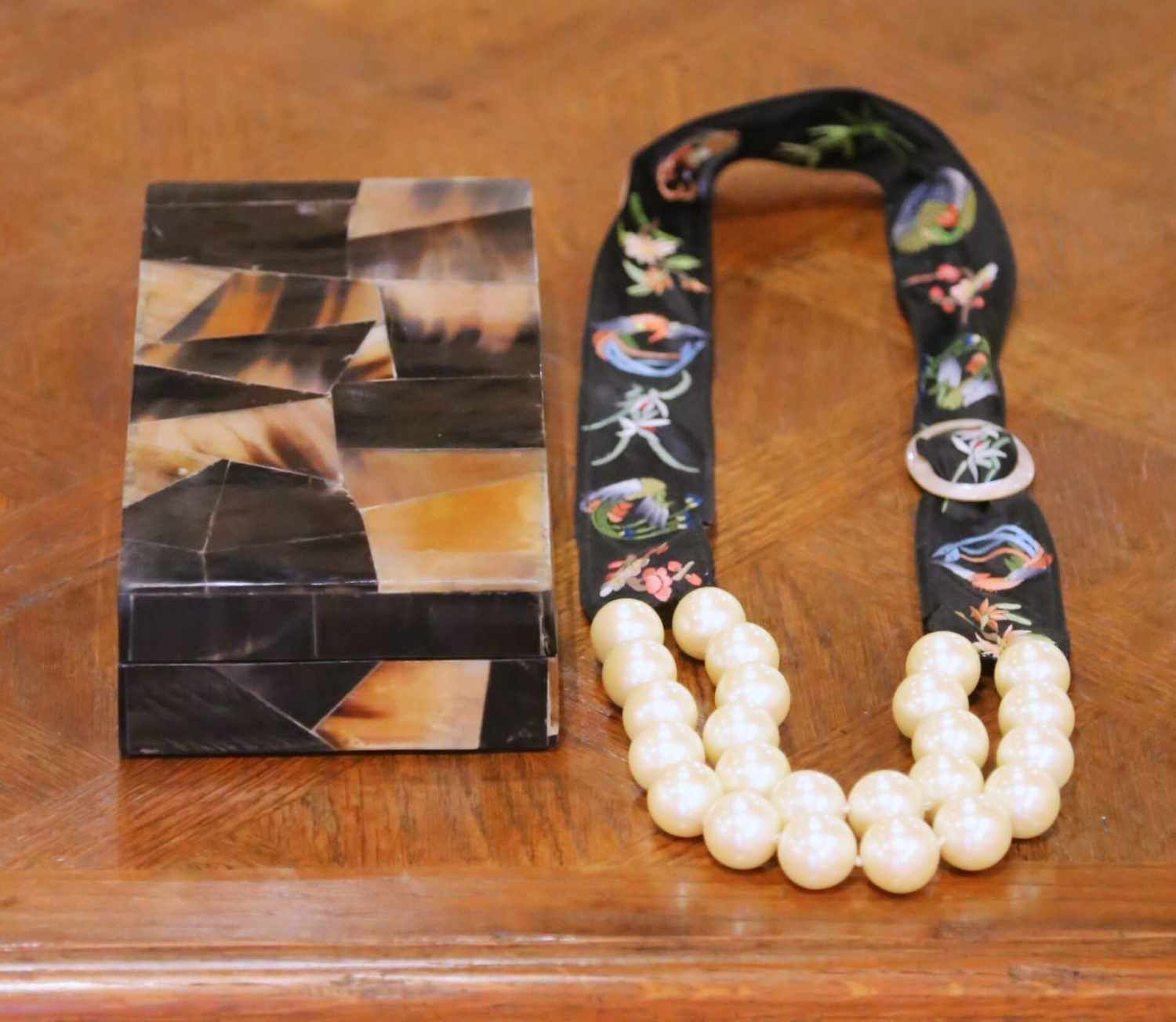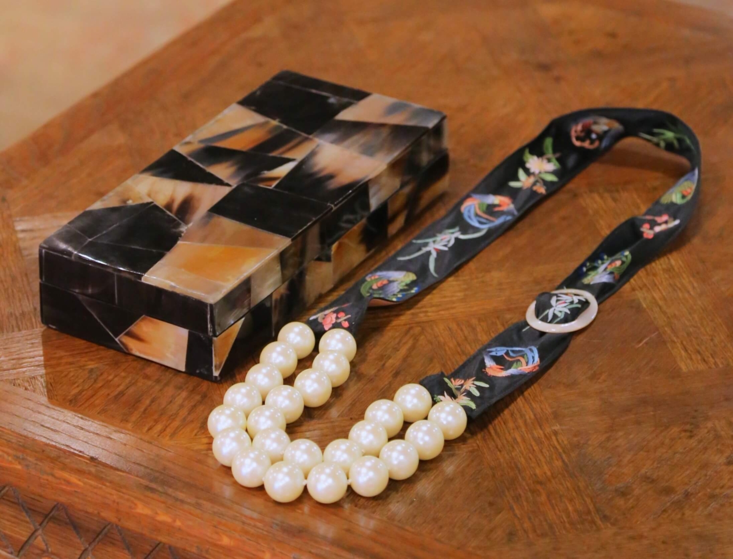 19th C. French Horn Mosaic Decorative Box with Embroidered Ribbon Pearl Necklace