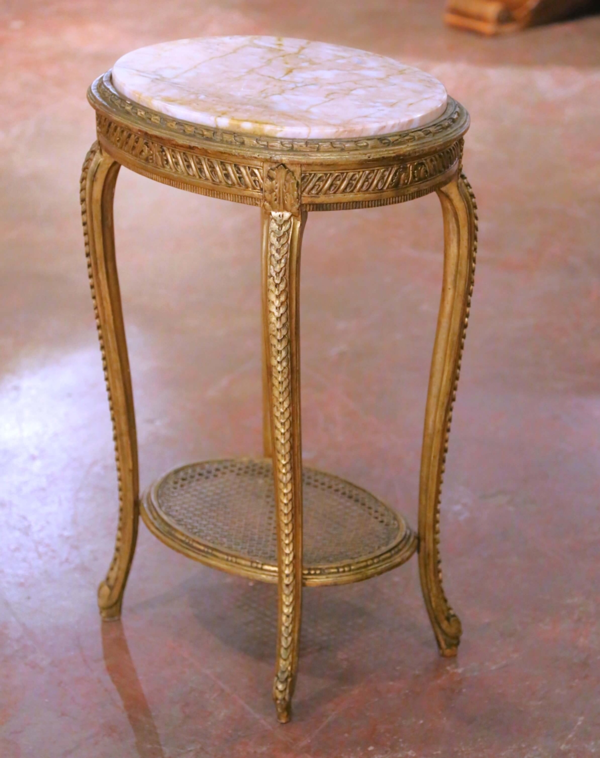 This elegant antique French guéridon side table was crafted in the Louis XV style, France, circa 1870. The refined round table features a richly veined marble top in soft blush and honey tones, finished with a gently molded edge and set within a finely carved giltwood surround. The apron is decorated with continuous ribbon-and-reed carving, punctuated by foliate reserves aligned with each leg, reflecting the graceful decorative vocabulary of the Louis XV period. The table is raised on four slender cabriole legs carved with trailing leaf motifs and retaining a warm, softly aged gilt-painted finish. The legs are joined by a lower oval shelf fitted with its original hand-woven cane insert, framed in giltwood, providing both visual lightness and practical display space. The airy proportions and delicate detailing make this antique table ideal as a side table, lamp table, or accent piece in a living room, bedroom, or refined powder room. The antique table is in excellent condition commensurate with age and use, with a beautifully preserved gilt surface showing gentle wear and patina. The marble top displays natural veining consistent with age, enhancing its authentic character and decorative appeal. Dimensions: 20″W x 15″D x 29.5″H.