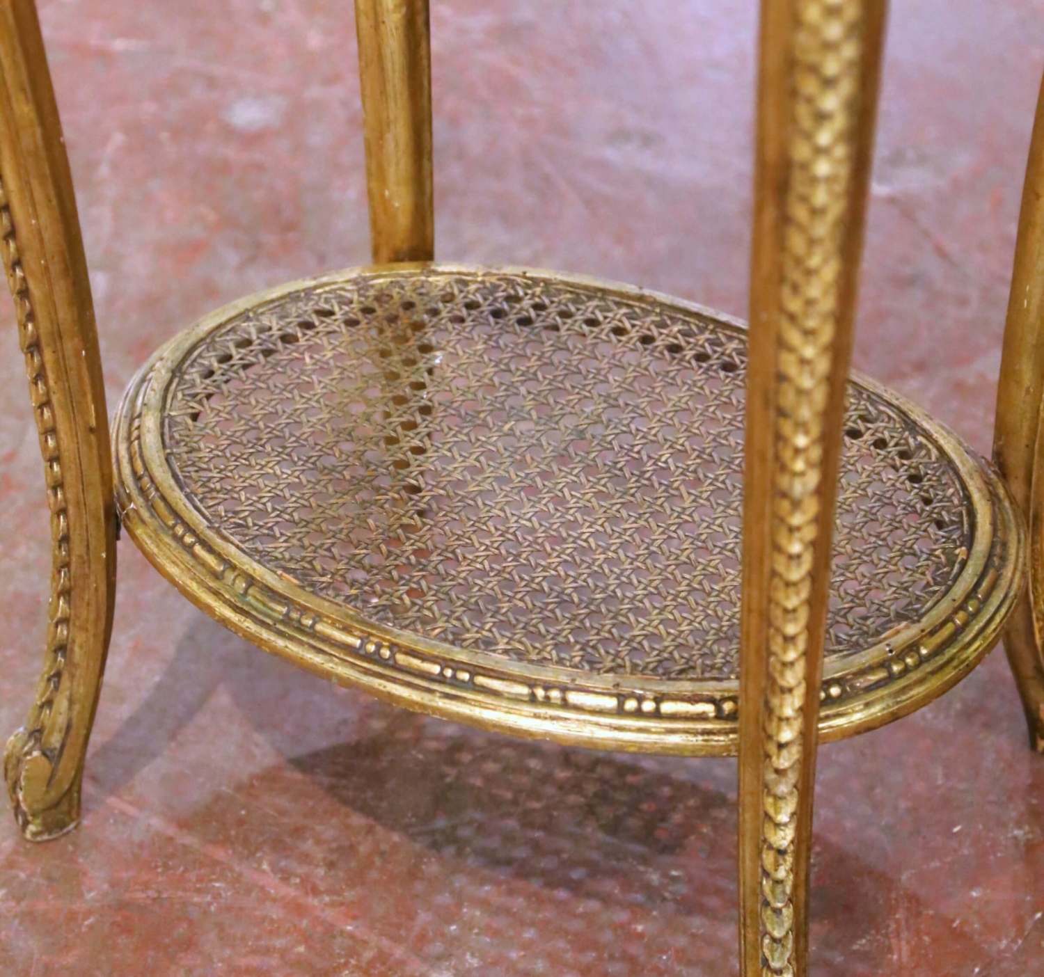 19th C. French Louis XV Gilt Guéridon Side Table with Marble Top and Cane Shelf