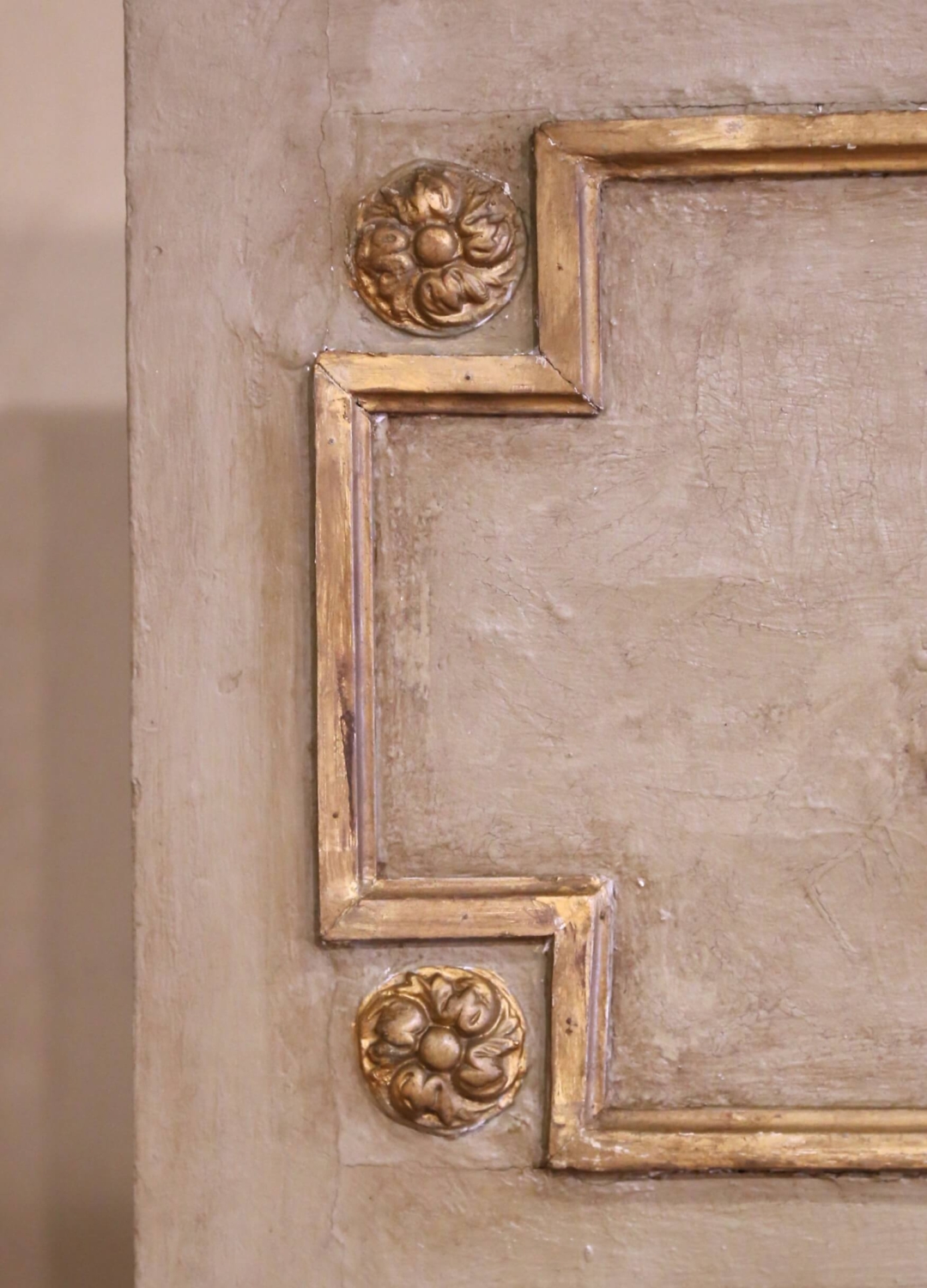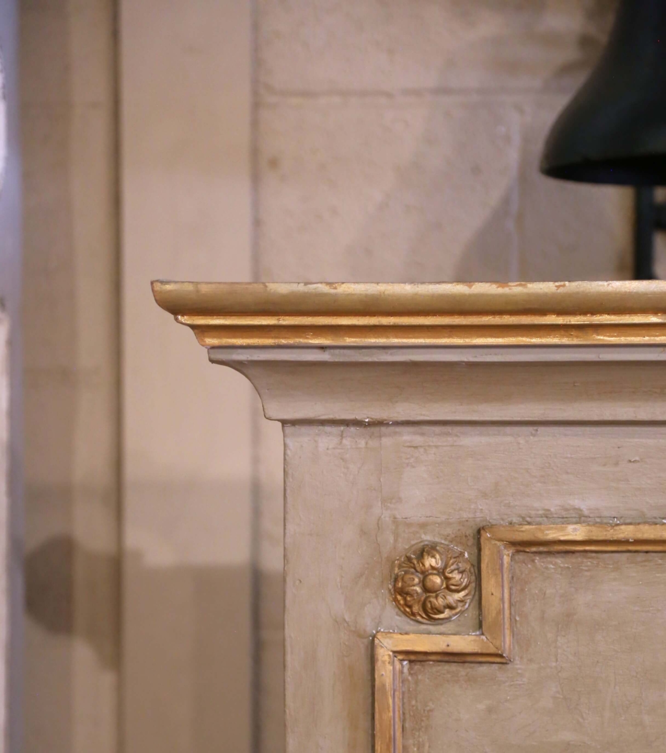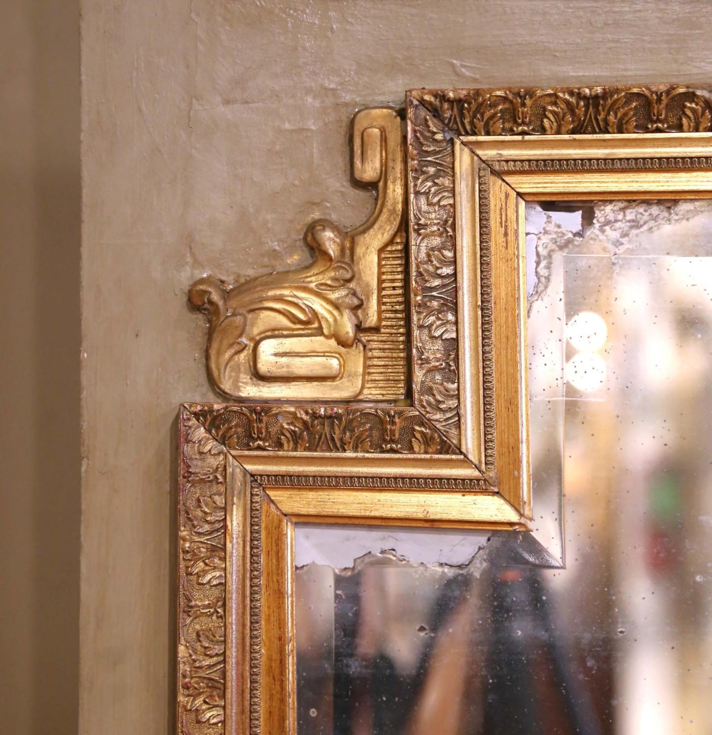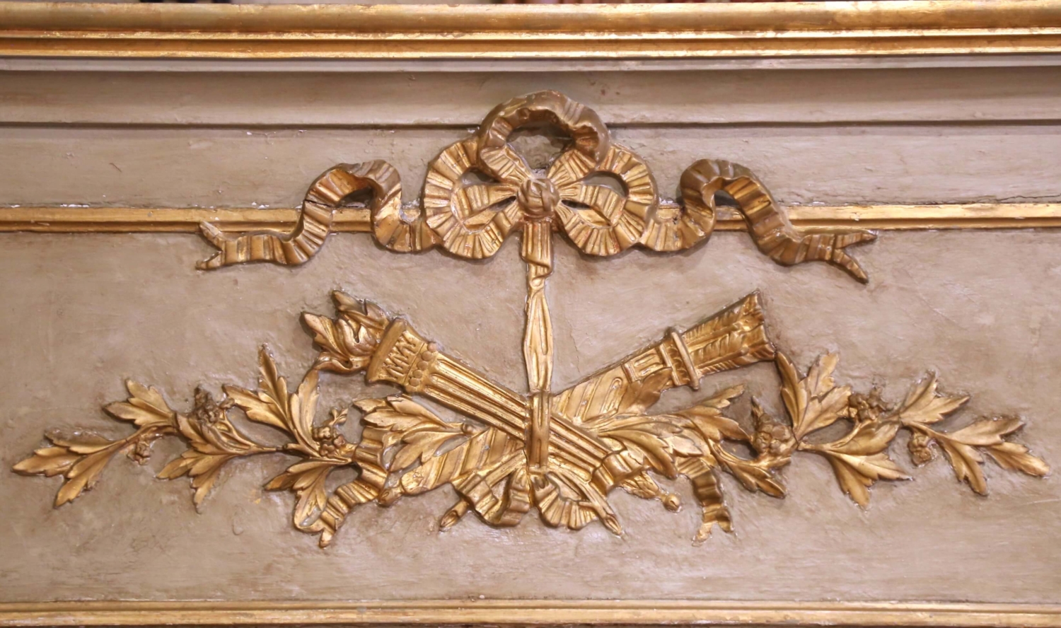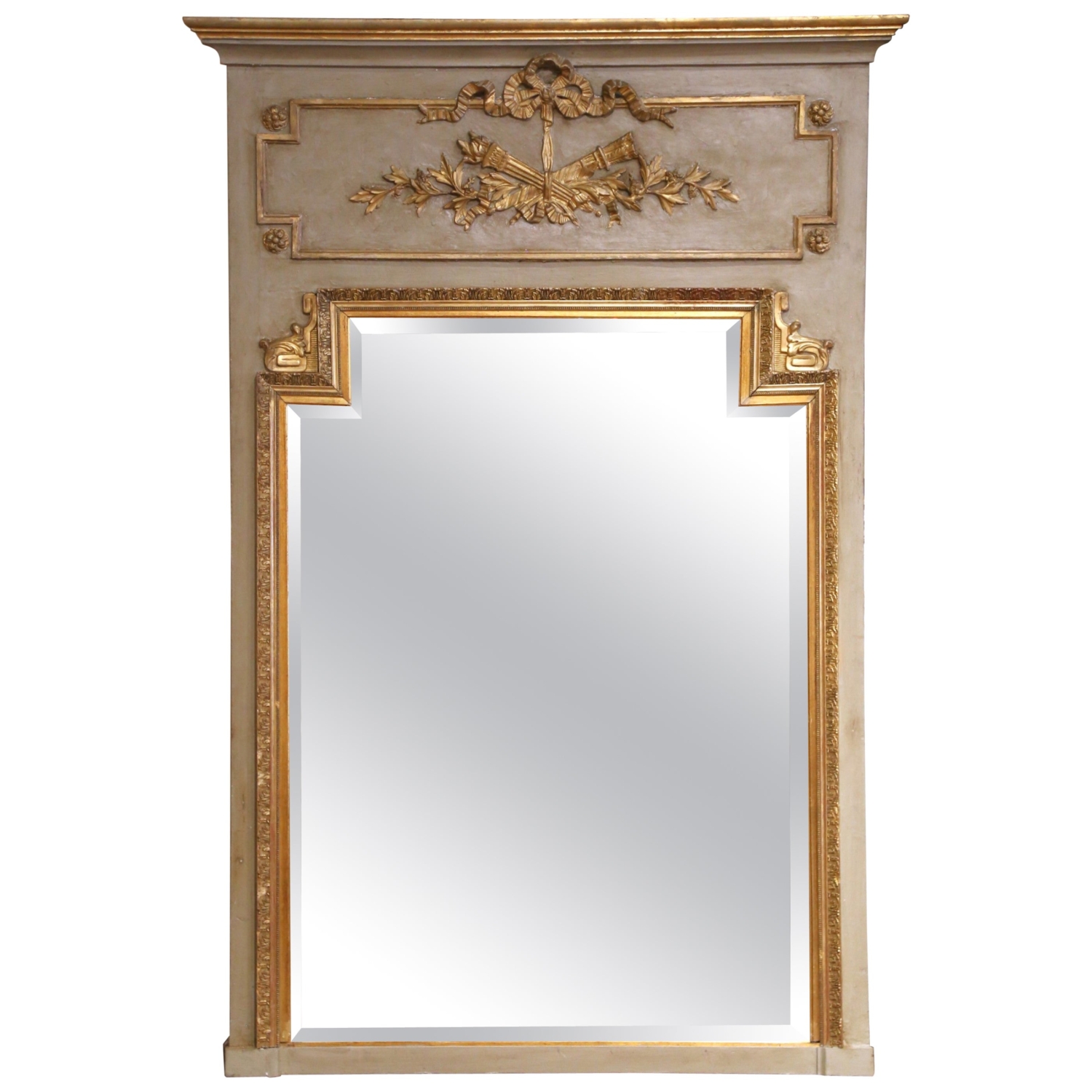 Crafted in France circa 1870, this elegant antique trumeau mirror exemplifies the refined ornamentation of the Louis XVI style. The painted and parcel-gilt wood frame is crowned with a classical bas-relief composition featuring crossed torches and oak branches bound by a ribbon, symbols of enlightenment and strength. Rosette medallions anchor each corner of the upper panel, while finely carved scrollwork and acanthus flourishes frame the original glass below. The muted gray-green painted surface is gently distressed, providing soft contrast to the warm gilt accents. The original mercury glass mirror with beveled glass shows subtle silvering and light aging, enhancing its authentic antique character. Measuring over 6 feet tall (73.25 inches high by 50 inches wide), this imposing 19th-century French mirror makes a commanding statement above a mantel, console, or sideboard. Excellent condition commensurate with age and use, with rich patina and timeless neoclassical appeal.