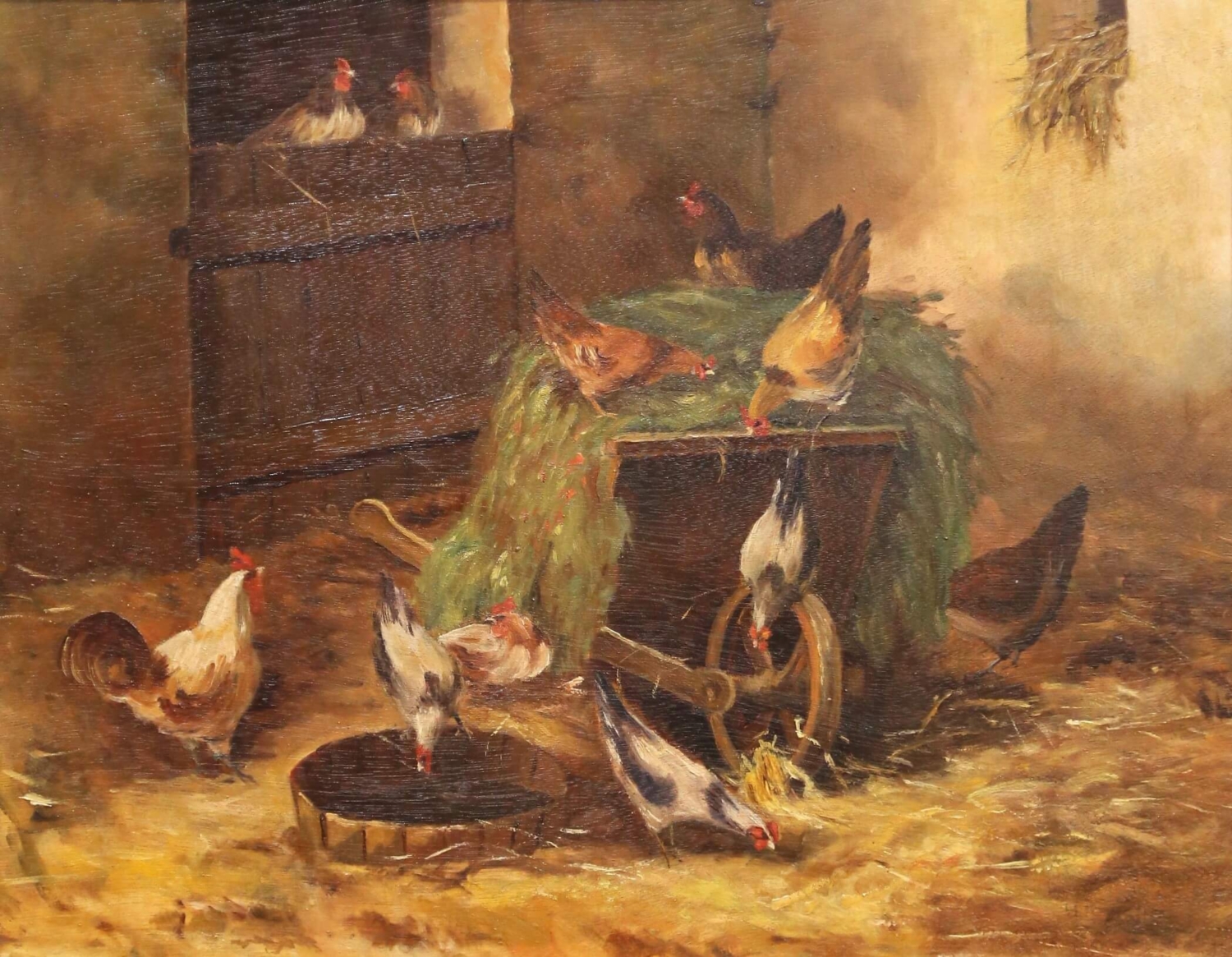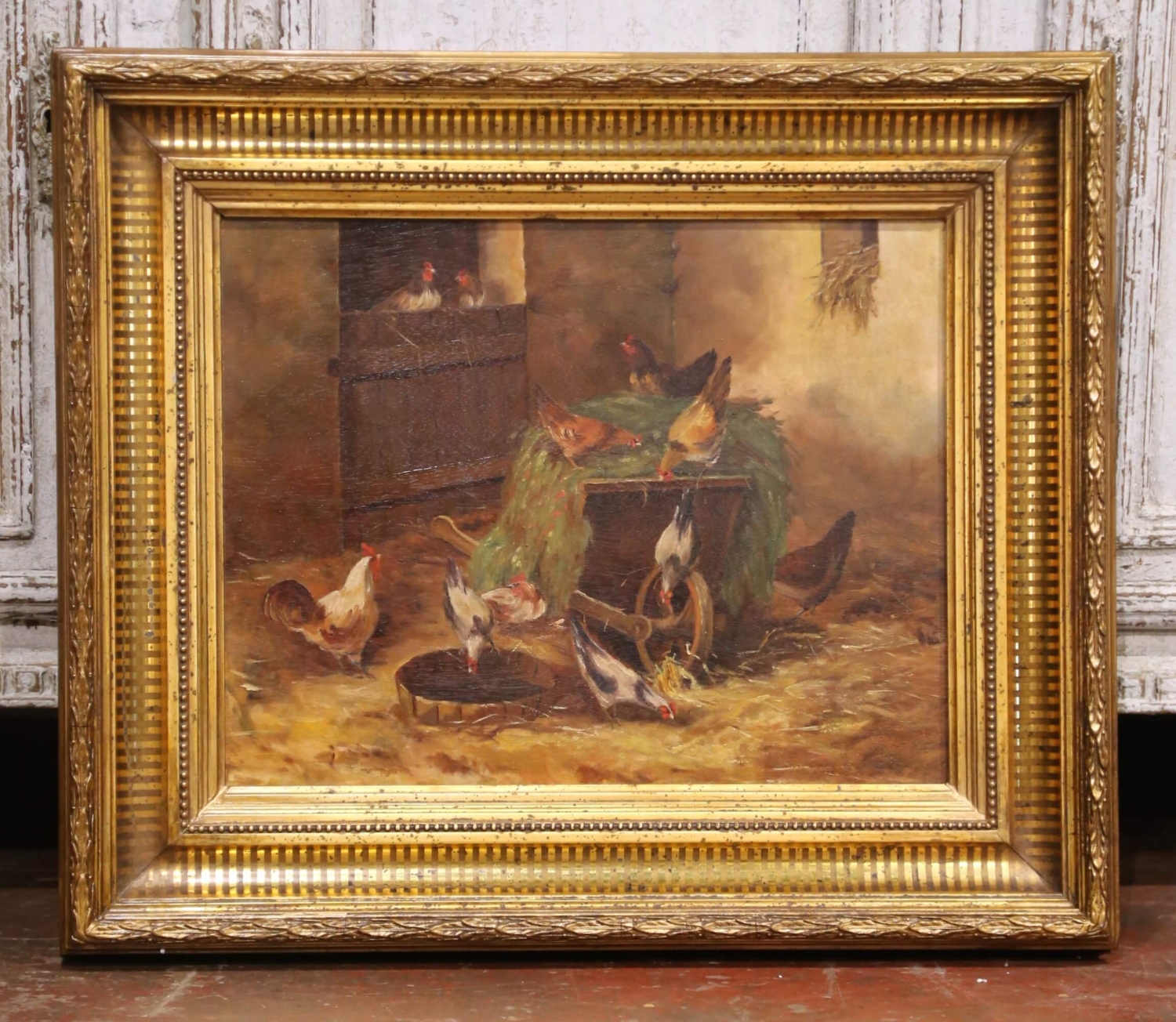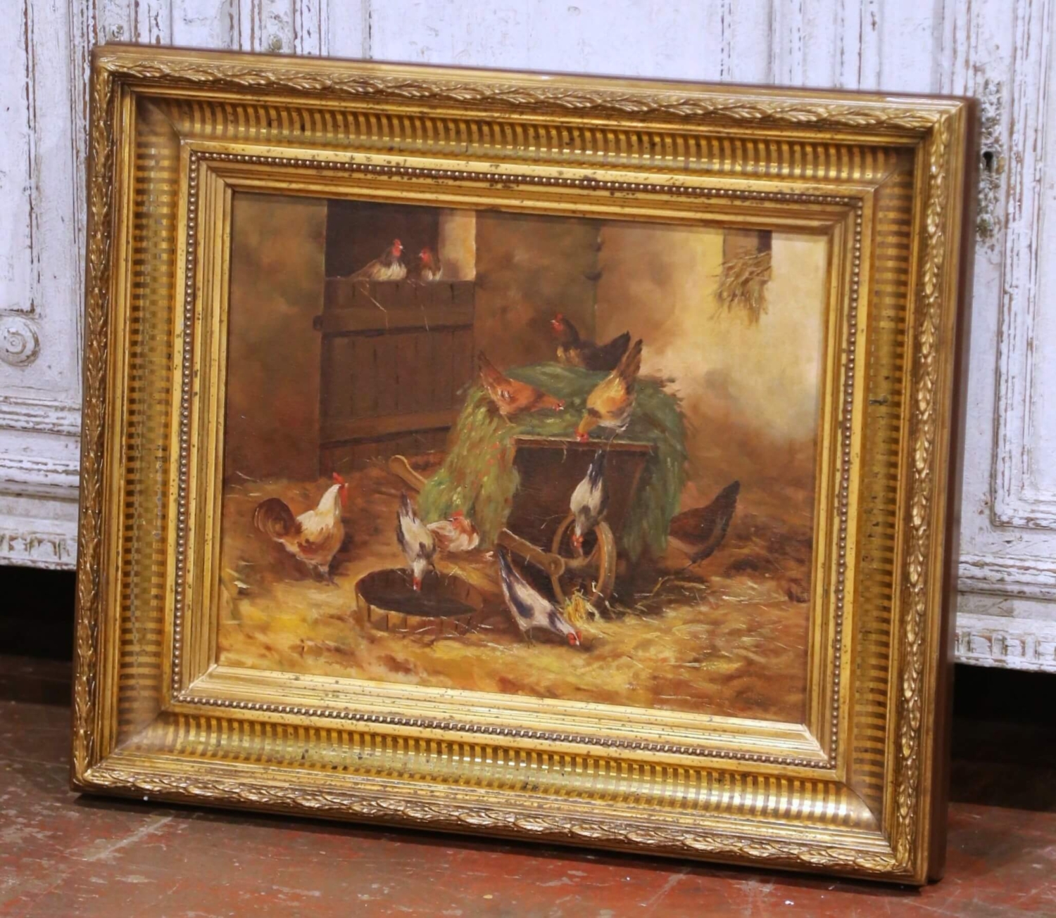 Bring warm, rustic character to an interior with this antique French oil on canvas depicting a lively barnyard scene, painted circa 1880. The composition centers on a group of chickens gathered around a wooden feeding trough beside a coop, animated with expressive brushwork and rendered in a rich, earthy palette. A proud rooster and scattered hens create a sense of movement and natural rhythm, capturing the charm of rural life with softness and authenticity. Executed in the manner of Edmond van Coppenolle, the painting reflects a similar attention to farmyard subject matter and atmospheric light. Signed “H. Forestier” in the lower right corner, the work is presented in its substantial giltwood frame with a deep molded profile. The frame is decorated with alternating fluted and beaded bands and retains a beautifully aged gold patina, enhancing the warmth and depth of the composition while adding strong decorative presence. This 19th century painting remains in excellent condition commensurate with age and use, with minor surface wear consistent with its history. A charming and timeless piece, ideal for a kitchen, breakfast room, or country-inspired interior. Dimensions: 25.5”W x 21.5”H