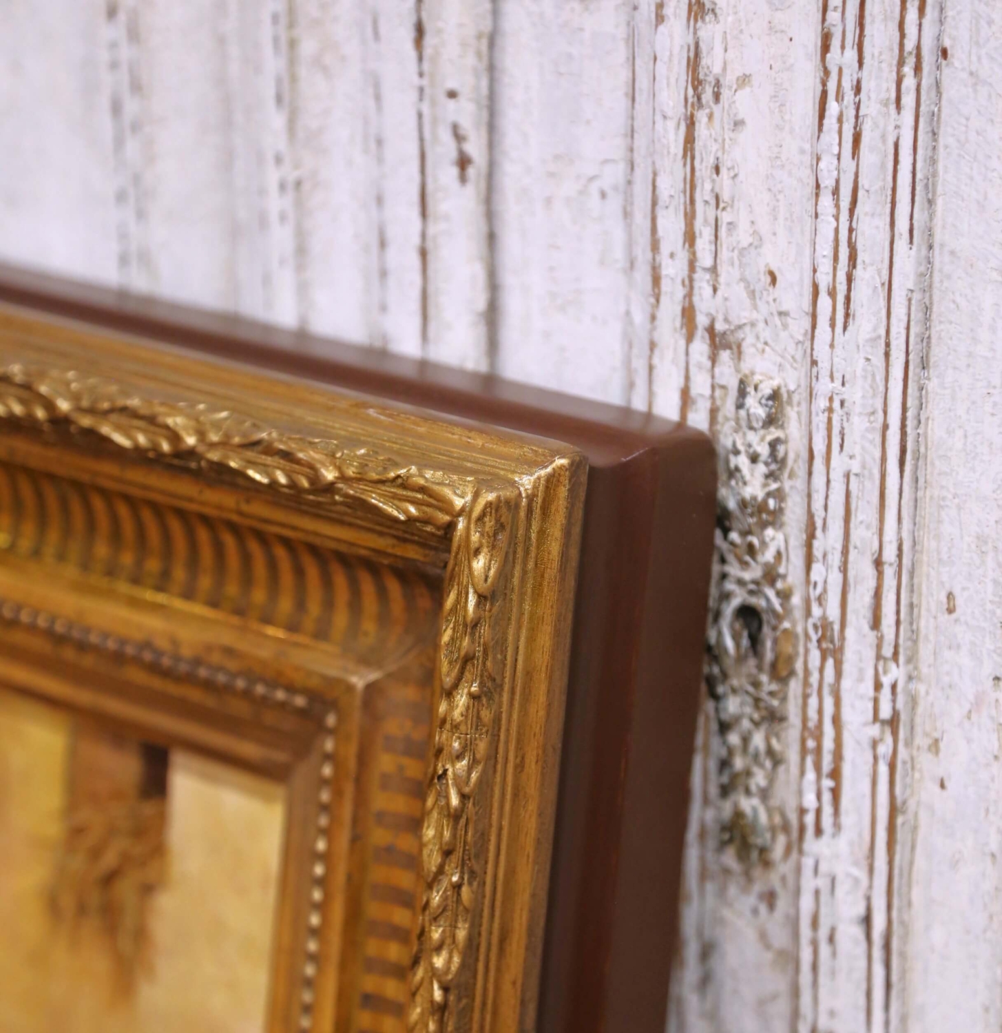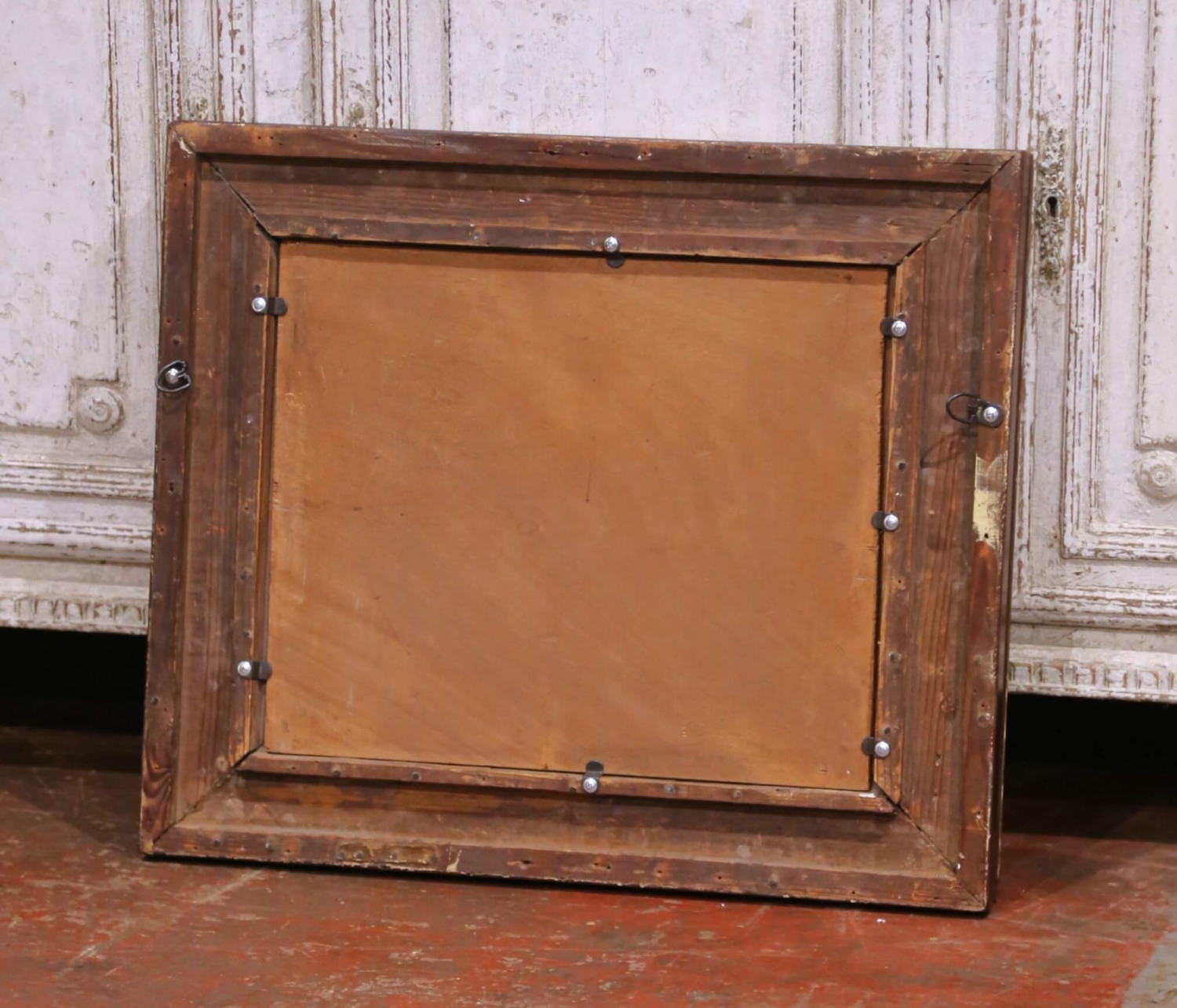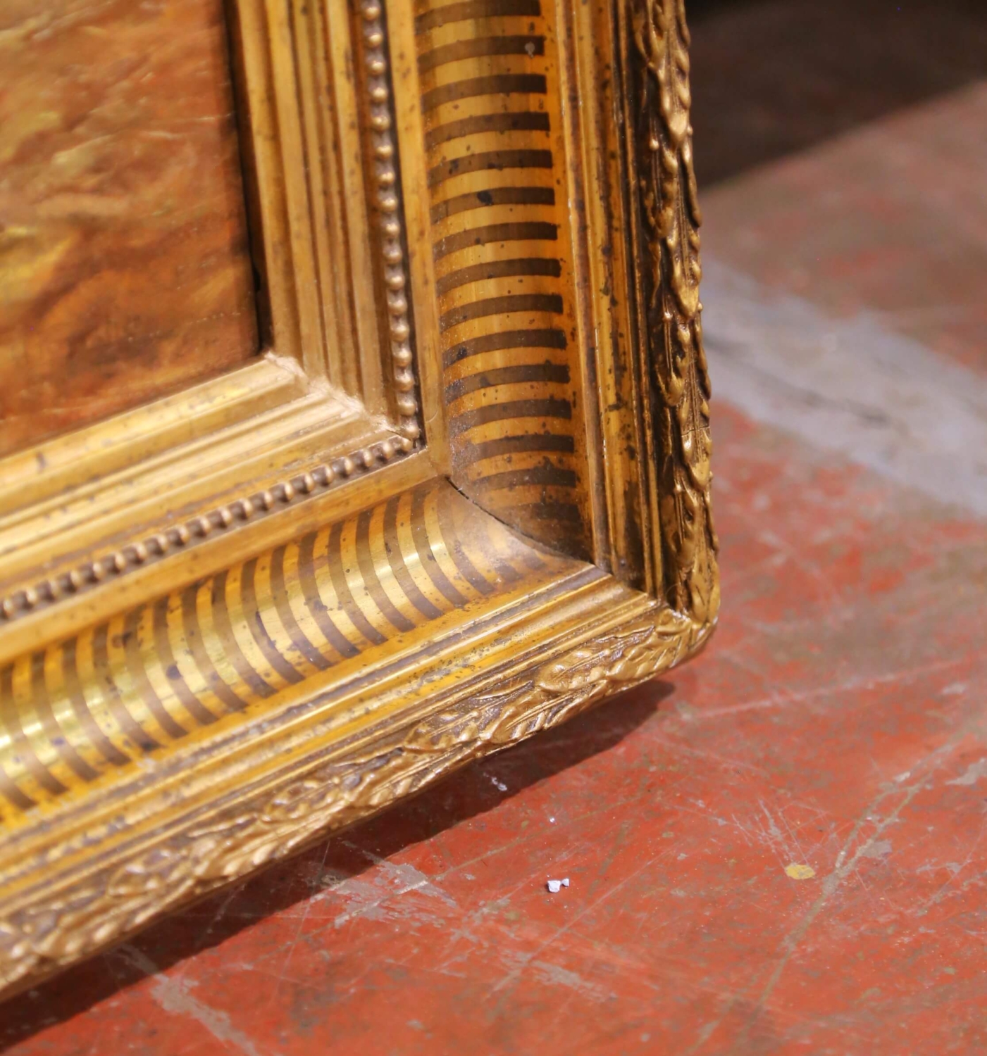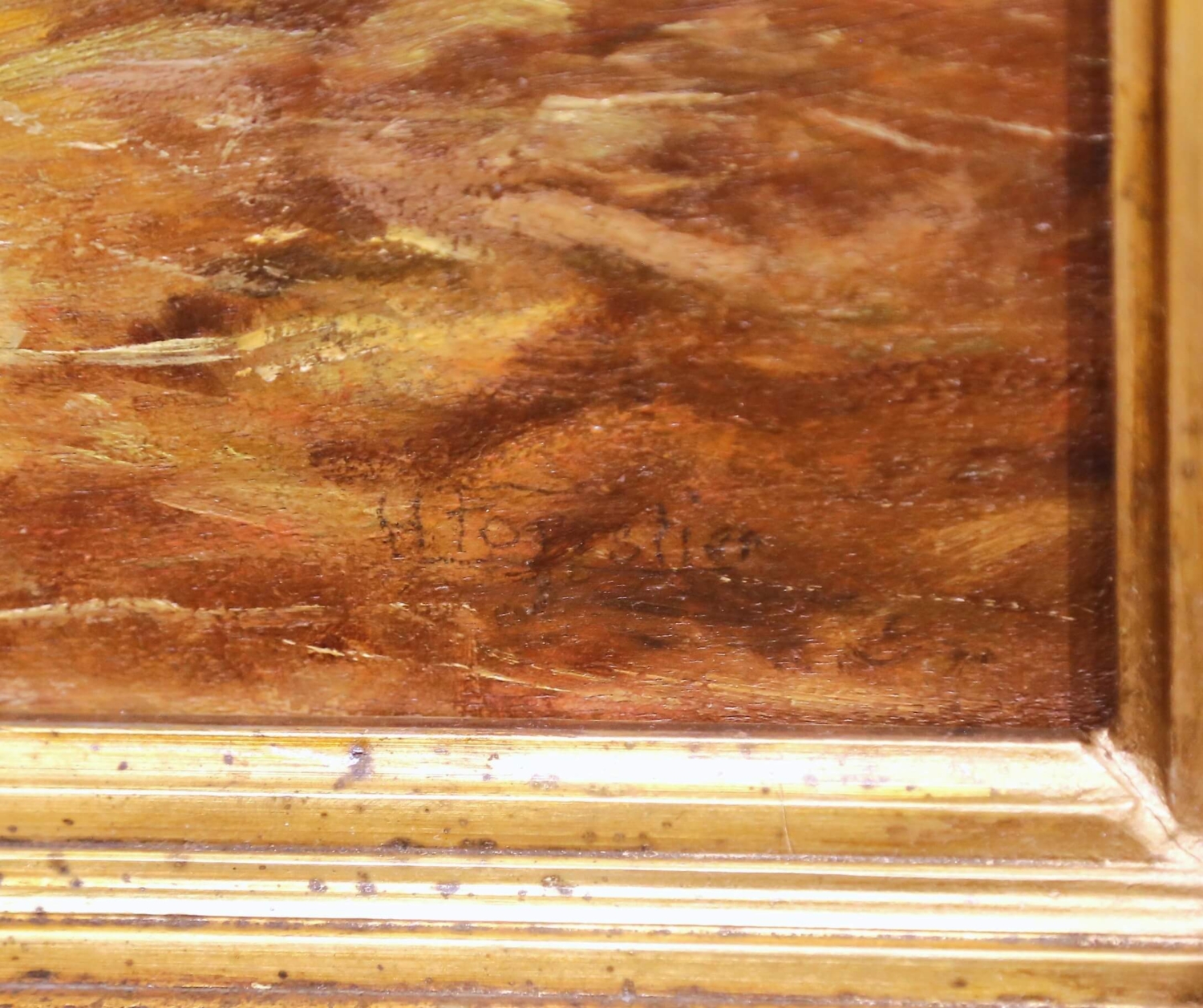 Bring warm, rustic character to an interior with this antique French oil on canvas depicting a lively barnyard scene, painted circa 1880. The composition centers on a group of chickens gathered around a wooden feeding trough beside a coop, animated with expressive brushwork and rendered in a rich, earthy palette. A proud rooster and scattered hens create a sense of movement and natural rhythm, capturing the charm of rural life with softness and authenticity. Executed in the manner of Edmond van Coppenolle, the painting reflects a similar attention to farmyard subject matter and atmospheric light. Signed “H. Forestier” in the lower right corner, the work is presented in its substantial giltwood frame with a deep molded profile. The frame is decorated with alternating fluted and beaded bands and retains a beautifully aged gold patina, enhancing the warmth and depth of the composition while adding strong decorative presence. This 19th century painting remains in excellent condition commensurate with age and use, with minor surface wear consistent with its history. A charming and timeless piece, ideal for a kitchen, breakfast room, or country-inspired interior. Dimensions: 25.5”W x 21.5”H