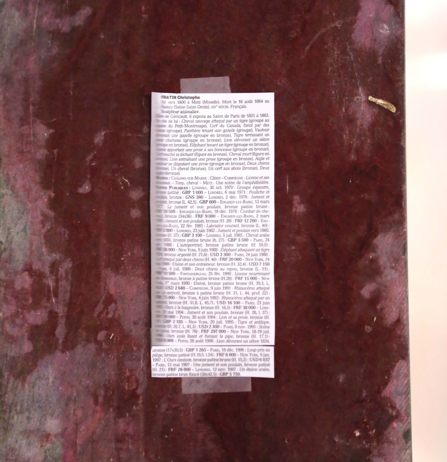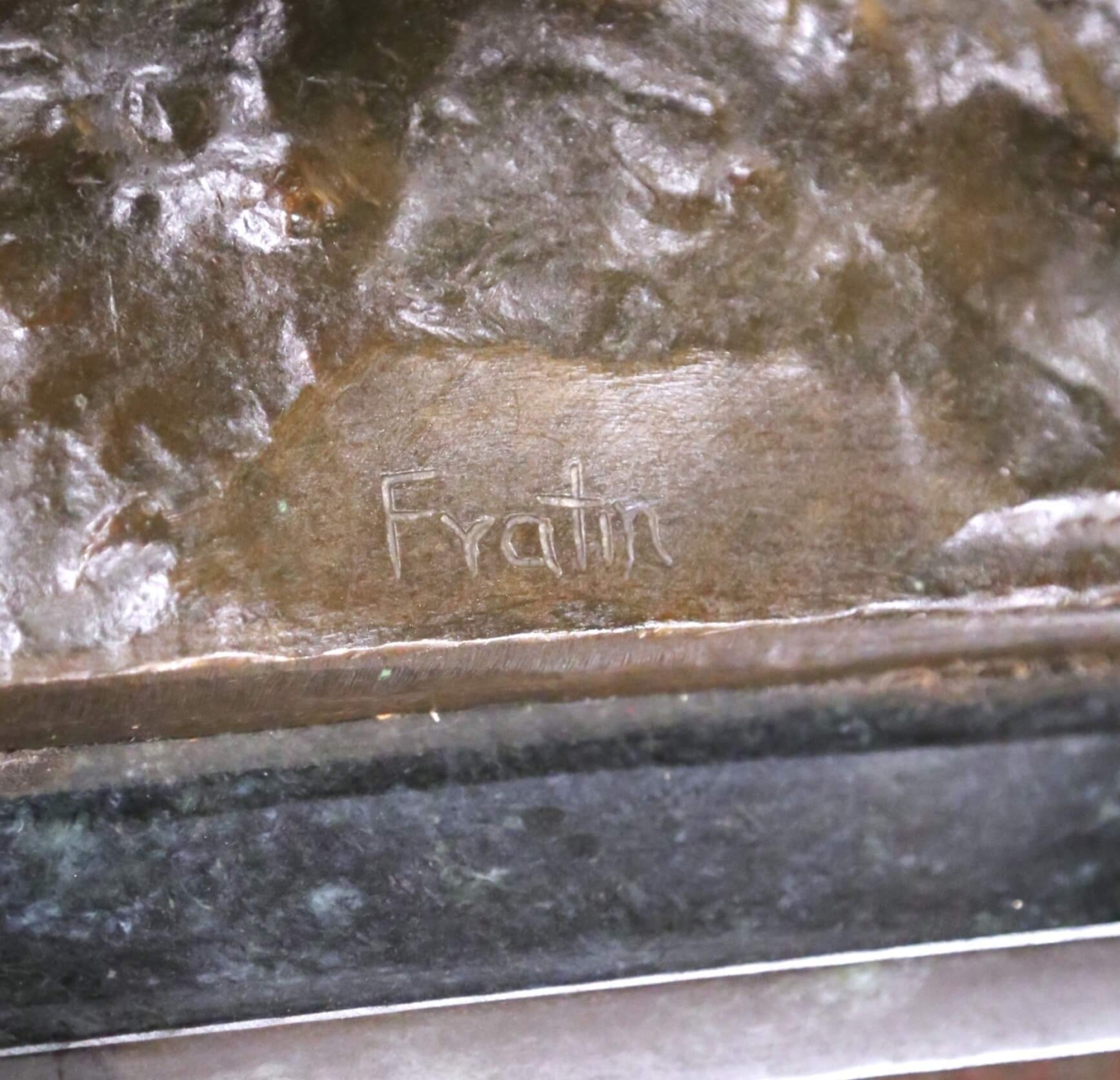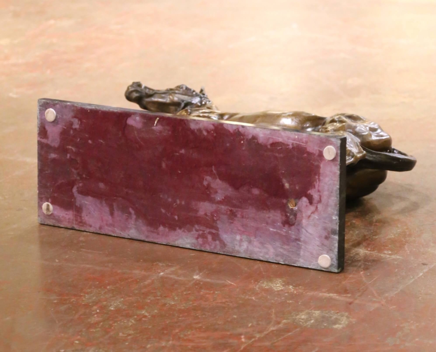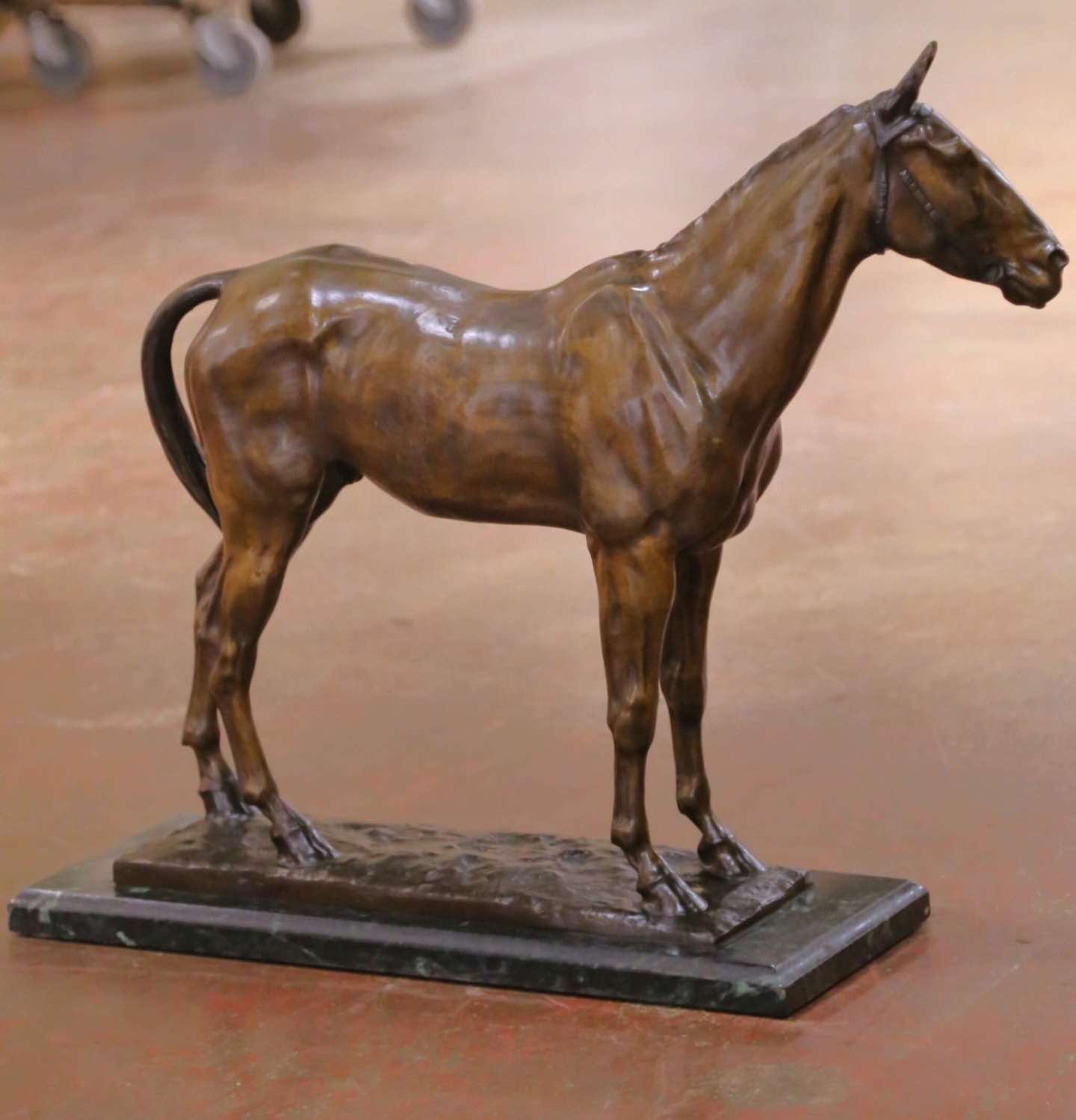 This elegant antique bronze sculpture depicts a finely modeled horse standing at rest and is signed Christophe Fratin, one of the most celebrated French animalier sculptors of the 19th century. Executed with exceptional anatomical precision and quiet naturalism, the figure captures the strength, balance, and alert posture that define Fratin’s masterful equine studies. The horse stands on a rectangular bronze plinth mounted to a dark marble base, lending the composition architectural presence and visual weight. The heavy 86 pound bronze is finished with a rich, warm brown patina, subtly nuanced to accentuate musculature and refined surface modeling. The sculpture is in excellent condition commensurate with age and use, with light rubbing to the patina, minor surface impressions, and small flecks of verdigris consistent with age and handling. Christophe Fratin (1801–1864) was a pivotal figure in the French Romantic and Animalier movements. A student of Théodore Géricault, Fratin exhibited regularly at the Paris Salon beginning in 1831 and gained international recognition for his expressive depictions of animals, particularly horses, stags, and hunting subjects. His work played a central role in elevating animal sculpture to a respected academic genre in 19th-century France. Fratin is listed in the Bénézit Dictionary of Artists, confirming his lasting importance within the canon of French sculpture. This refined antique bronze would make a distinguished addition to a library, study, or equestrian-themed interior, and pairs beautifully with both classical and transitional décor. Dimensions: 25 W × 31 D × 9 H