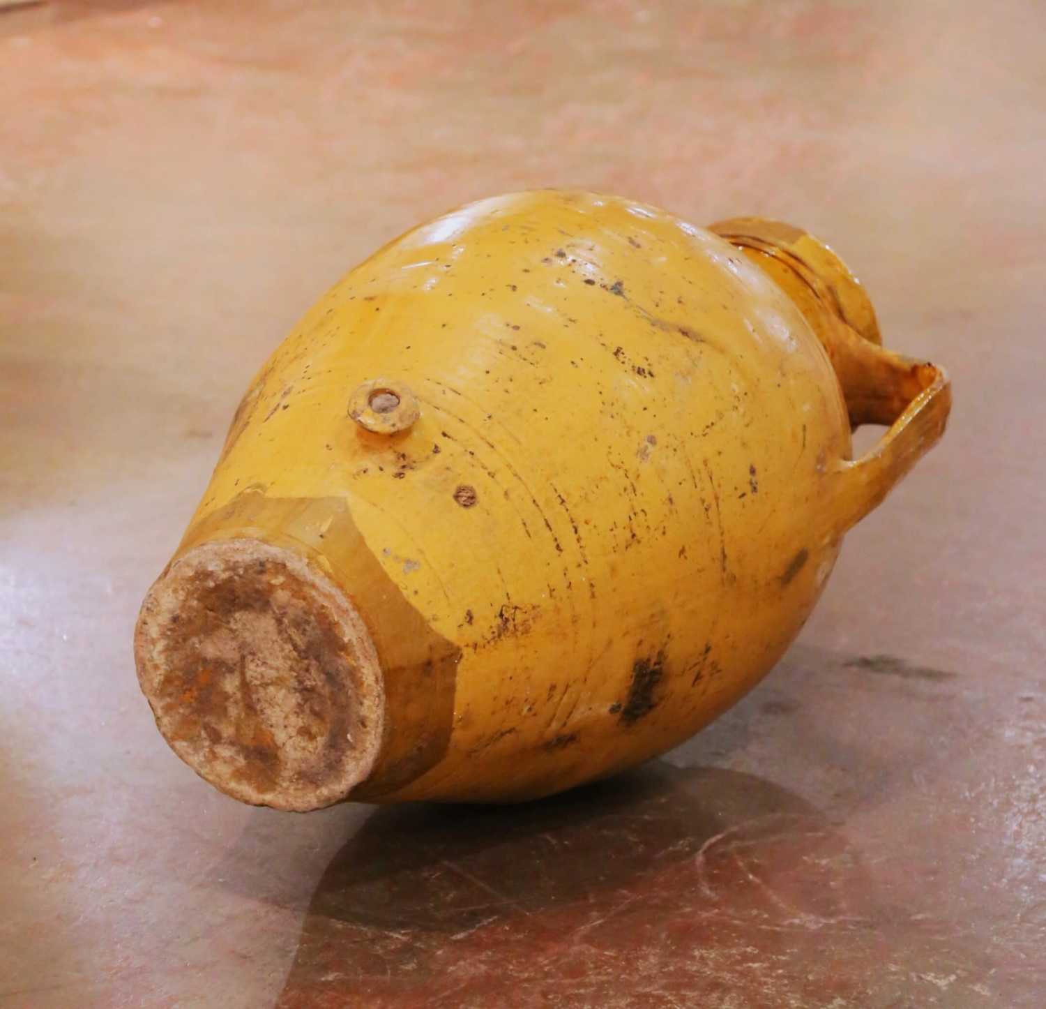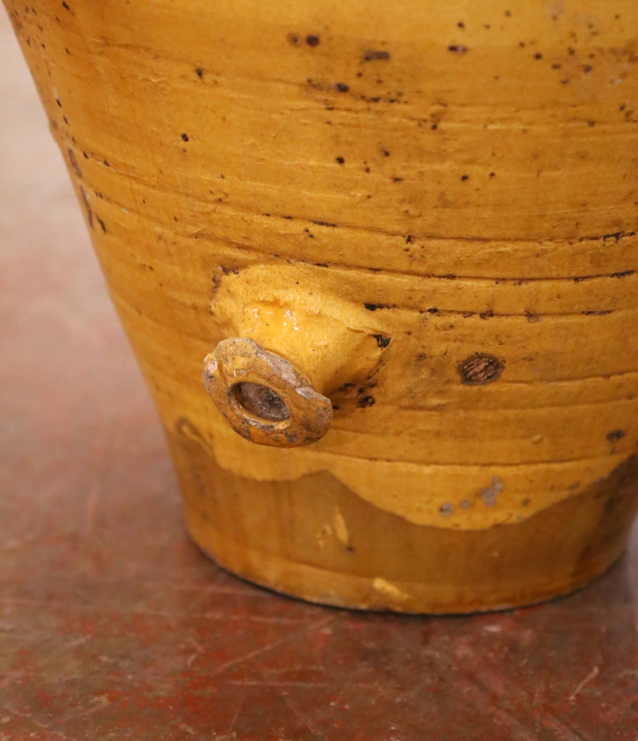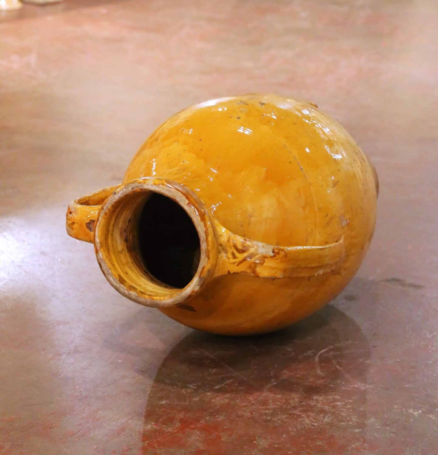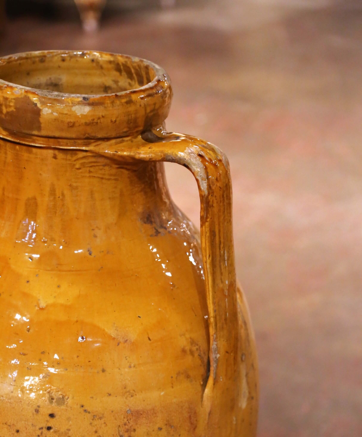 This impressive antique French glazed terracotta olive oil jar was crafted in Provence, Southern France, circa 1870. Traditionally used for the storage and dispensing of oil, the vessel embodies the classic ovoid form associated with 19th century Provençal jarres à huile, featuring a full rounded body that rises to a short collar neck and tapers to a narrow foot. Two sturdy vertical strap handles are applied high at the shoulder for balanced lifting, and the jar retains its original molded ceramic spout near the base, designed for controlled decanting into smaller vessels. The surface is dressed in a richly variegated honey and deep ochre glaze, generously applied across the upper body and thinning organically toward the lower section, allowing the warm terracotta ground to emerge. Visible throwing rings, natural glaze runs, kiln speckling, and mineral deposits attest to its hand-thrown construction and authentic utilitarian past. Honest chips, glaze losses, and surface wear throughout reinforce its genuine antique character and rustic Provençal appeal. Impressive in both scale and silhouette, this antique French oil jar offers strong sculptural presence. It makes a striking decorative statement in an entry, kitchen, wine cellar, or garden room, and may also be professionally wired as a distinctive lamp base if desired. The piece is in excellent antique condition commensurate with age and use. Dimensions: 19” diameter x 36”H