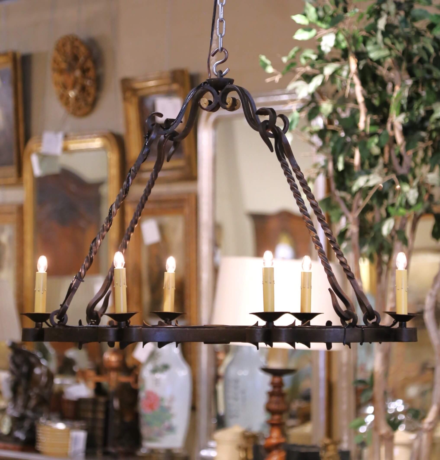 Bring timeless French craftsmanship into your home with this elegant hand-forged chandelier. Crafted in France circa 1880, the six-light fixture features an elongated oval frame adorned with intricate scrollwork and decorative curls. Each light sits atop a circular bobeche with candle-style sleeves, providing both ambient and sculptural illumination. The twisted iron supports rise gracefully to a scrolled crown accented with subtle gilt highlights, adding a touch of warmth and refinement to the dark patinated finish. This finely detailed iron chandelier exemplifies 19th-century French blacksmith artistry, both functional and decorative, perfect above a dining table, entryway, or grand living space. Recently wired for modern use and in excellent condition commensurate with age and use. Measures: 48″ W x 18″ D x 33″ H.