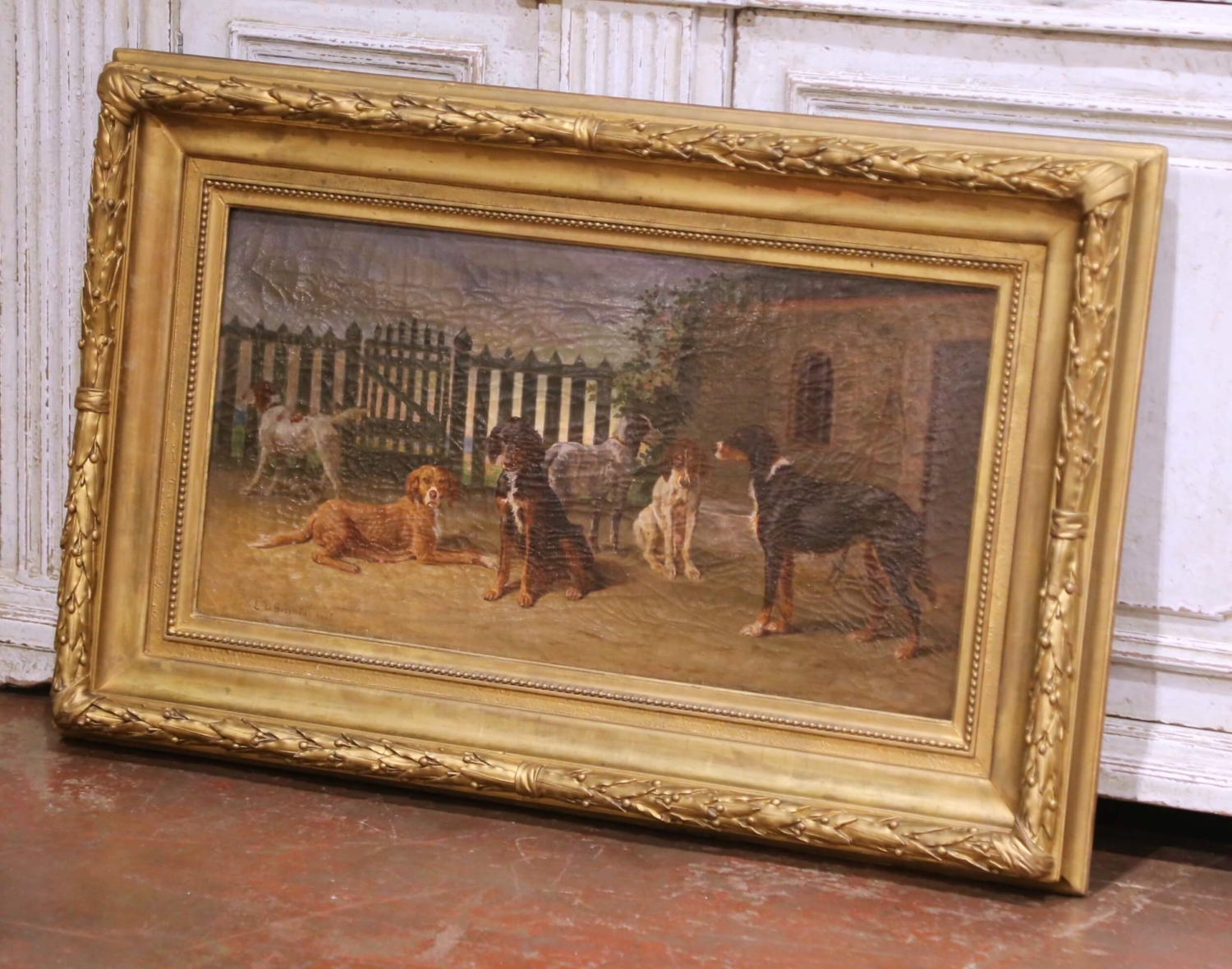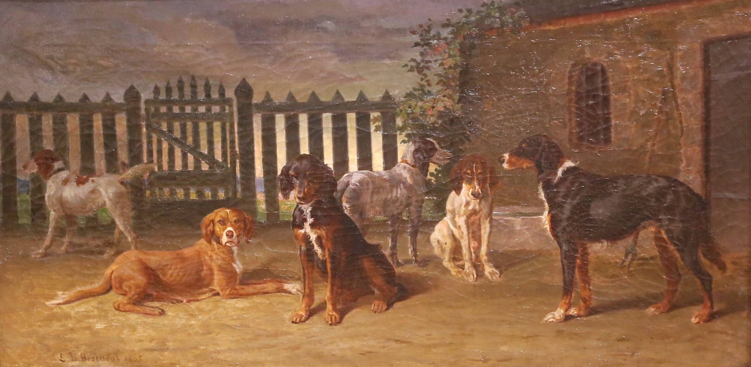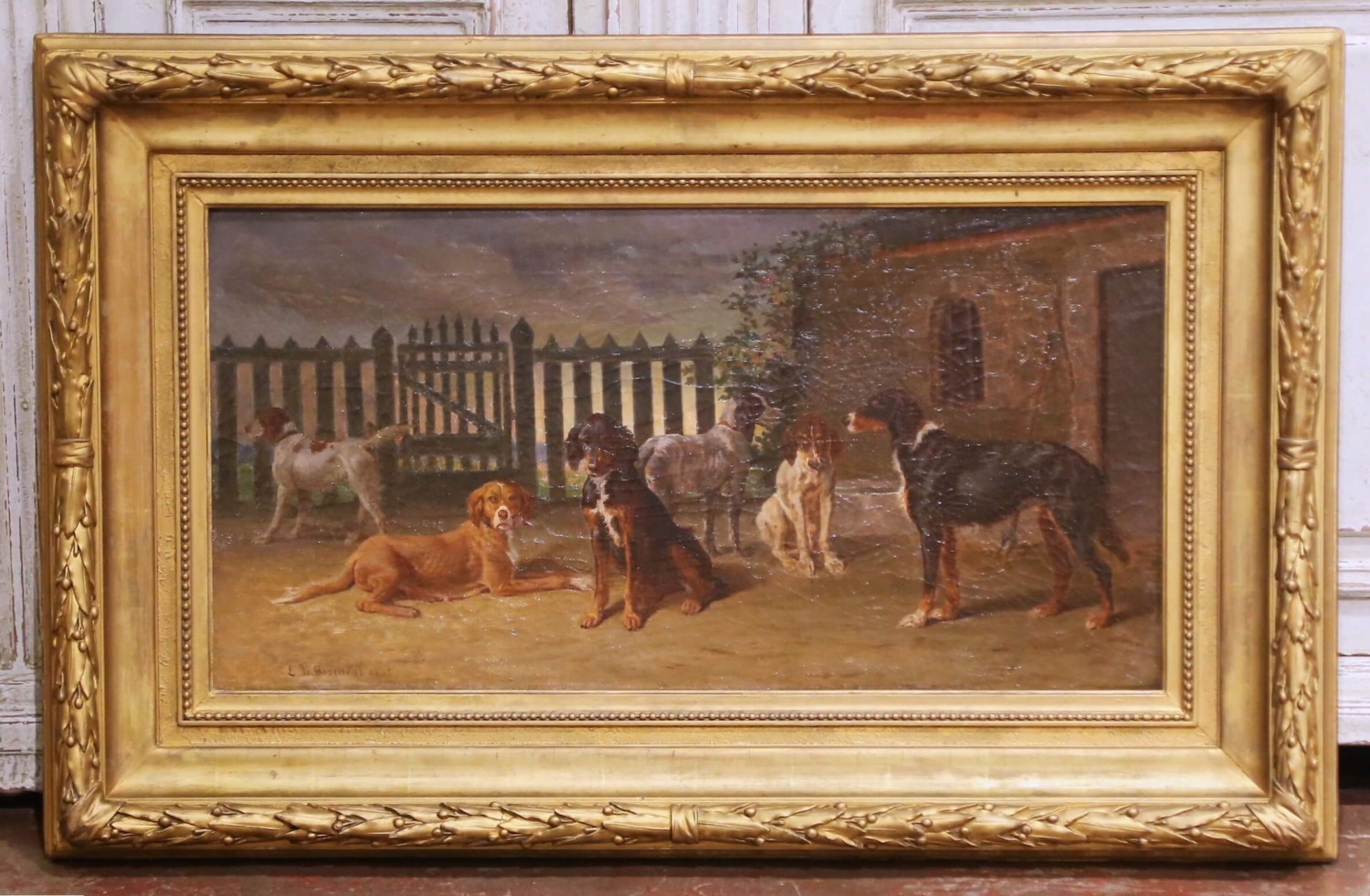 This exceptional antique 19th century oil on canvas is signed and dated “L. de Besenval 1865” at the lower left and is titled Six chiens dans une cour de chenil. The composition depicts six hunting and working dogs gathered within a kennel courtyard, rendered with striking anatomical precision and individualized character. Arranged in a balanced horizontal grouping before a gated fence and rustic stone outbuilding, the dogs create a strong sense of depth through controlled light and shadow. Each animal is treated almost as a portrait, from the reclining chestnut dog engaging the viewer in the foreground to the attentive standing hounds and the powerful central figure modeled with careful attention to musculature and coat texture. The subdued earthy palette and softly atmospheric sky align with the 19th century European sporting tradition, reflecting both French and British influences of the period. Born in Soleure in 1812 and later established in Paris, where he died in 1889, the artist exhibited during the mid-19th century and developed a respected reputation for carefully observed animal and sporting subjects. His work reflects the disciplined naturalism associated with the Paris Salon, combining academic precision with refined sensitivity to light and composition. His paintings continue to appear at French auction houses, including Artcurial. Executed in oil on its original canvas, this antique painting retains its authentic surface with age-appropriate craquelure consistent with its 1865 date, reinforcing its historical integrity and character. It is presented in a substantial carved giltwood frame with foliate and beaded decoration that complements the warmth of the scene and enhances its decorative presence. A handsome and refined antique sporting subject offering both historical authenticity and strong visual impact, ideal for a study, library, hunting lodge, or traditional interior. Dimensions: 43.5”W x 27.5”H