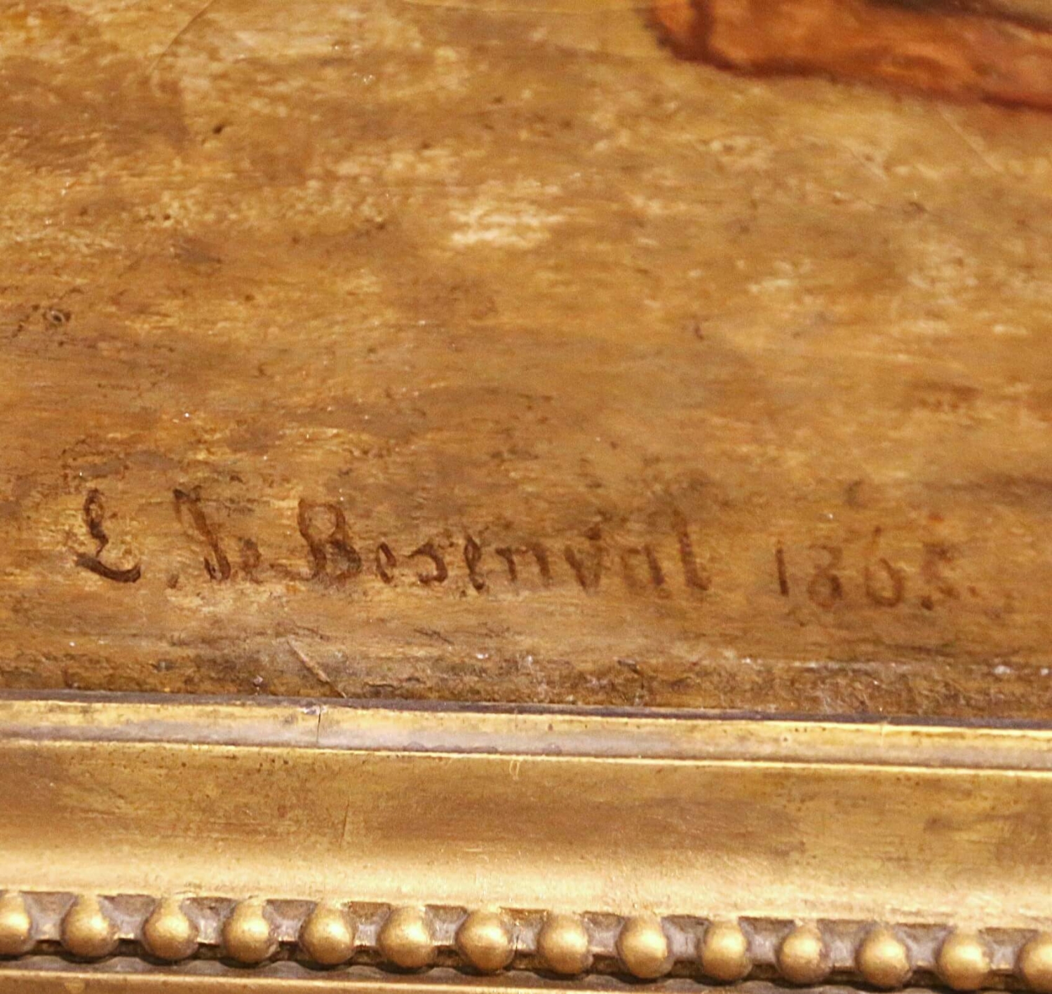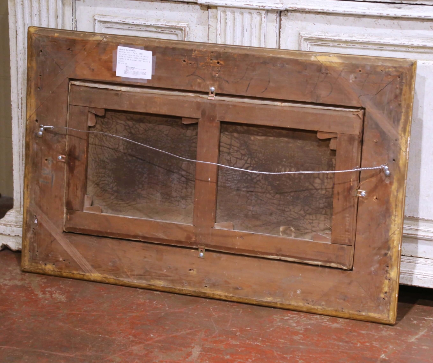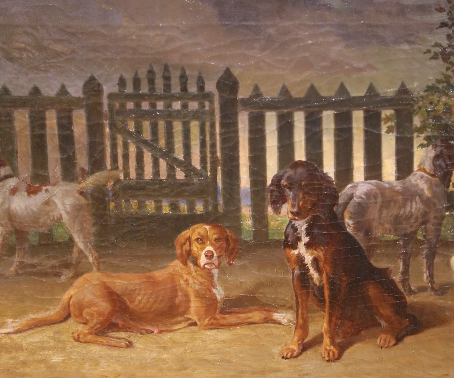This exceptional antique 19th century oil on canvas is signed and dated “L. de Besenval 1865” at the lower left and is titled Six chiens dans une cour de chenil. The composition depicts six hunting and working dogs gathered within a kennel courtyard, rendered with striking anatomical precision and individualized character. Arranged in a balanced horizontal grouping before a gated fence and rustic stone outbuilding, the dogs create a strong sense of depth through controlled light and shadow. Each animal is treated almost as a portrait, from the reclining chestnut dog engaging the viewer in the foreground to the attentive standing hounds and the powerful central figure modeled with careful attention to musculature and coat texture. The subdued earthy palette and softly atmospheric sky align with the 19th century European sporting tradition, reflecting both French and British influences of the period. Born in Soleure in 1812 and later established in Paris, where he died in 1889, the artist exhibited during the mid-19th century and developed a respected reputation for carefully observed animal and sporting subjects. His work reflects the disciplined naturalism associated with the Paris Salon, combining academic precision with refined sensitivity to light and composition. His paintings continue to appear at French auction houses, including Artcurial. Executed in oil on its original canvas, this antique painting retains its authentic surface with age-appropriate craquelure consistent with its 1865 date, reinforcing its historical integrity and character. It is presented in a substantial carved giltwood frame with foliate and beaded decoration that complements the warmth of the scene and enhances its decorative presence. A handsome and refined antique sporting subject offering both historical authenticity and strong visual impact, ideal for a study, library, hunting lodge, or traditional interior. Dimensions: 43.5”W x 27.5”H