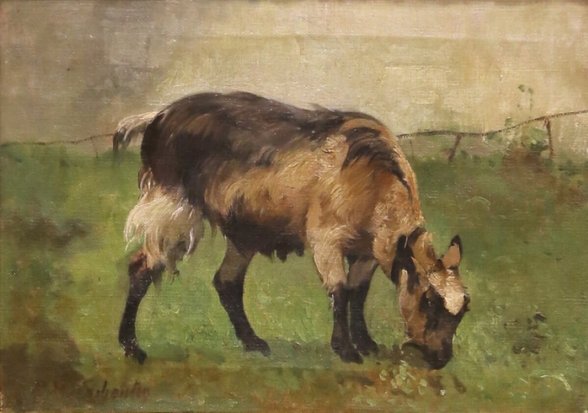 This work is attributed to Paul Henry Schouten (Belgian, 1860–1922), a listed artist in Benezit, known for his finely observed depictions of livestock and pastoral subjects. His paintings reflect the 19th-century European tradition of animal painting, with a focus on realism, anatomy, and the quiet poetry of rural life.