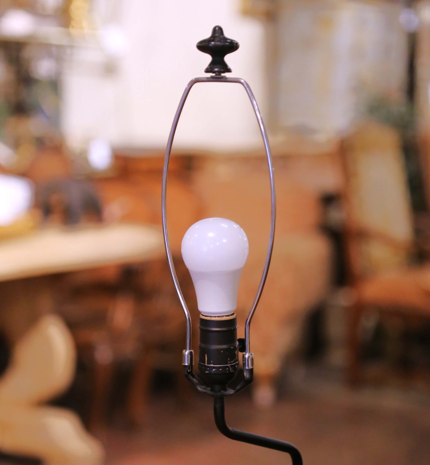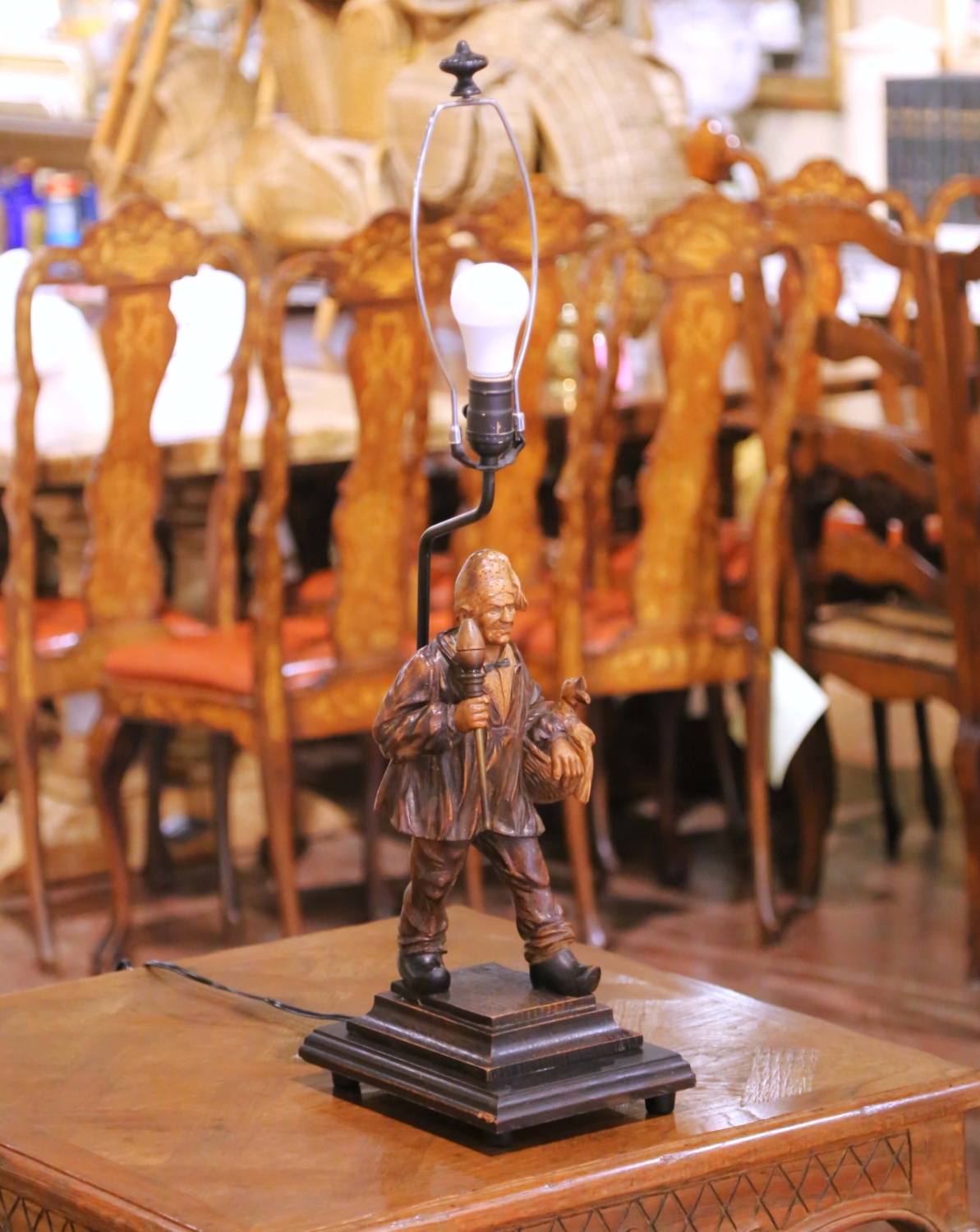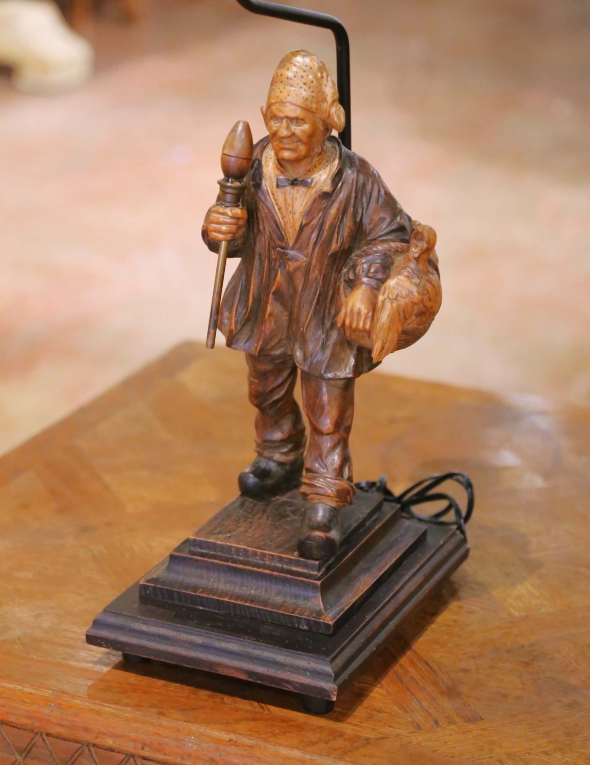 This distinctive antique table lamp is formed from a 19th century hand-carved wooden figure depicting a rustic male character holding a staff and a bird, likely a duck or fowl. The sculpture displays strong folk-art character, with an expressive face, deeply carved garments, and lively naturalistic details that reflect traditional rural carving traditions. The surface retains a richly developed, time-softened patina with warm tonal variation, enhancing the figure’s sculptural depth and authenticity. The carving is signed Jeret at the base, adding notable artistic interest and collectibility. The carved figure is mounted on a stepped rectangular wooden base and has been professionally converted into a lamp for modern use, with updated wiring. Shade not included. Both sculptural and functional, this antique figural lamp works beautifully in a study, library, entry, or living space, offering visual impact and character whether illuminated or unlit. Excellent condition commensurate with age and use. Shade not included. Dimensions: 10″W x 8″D x 32″H