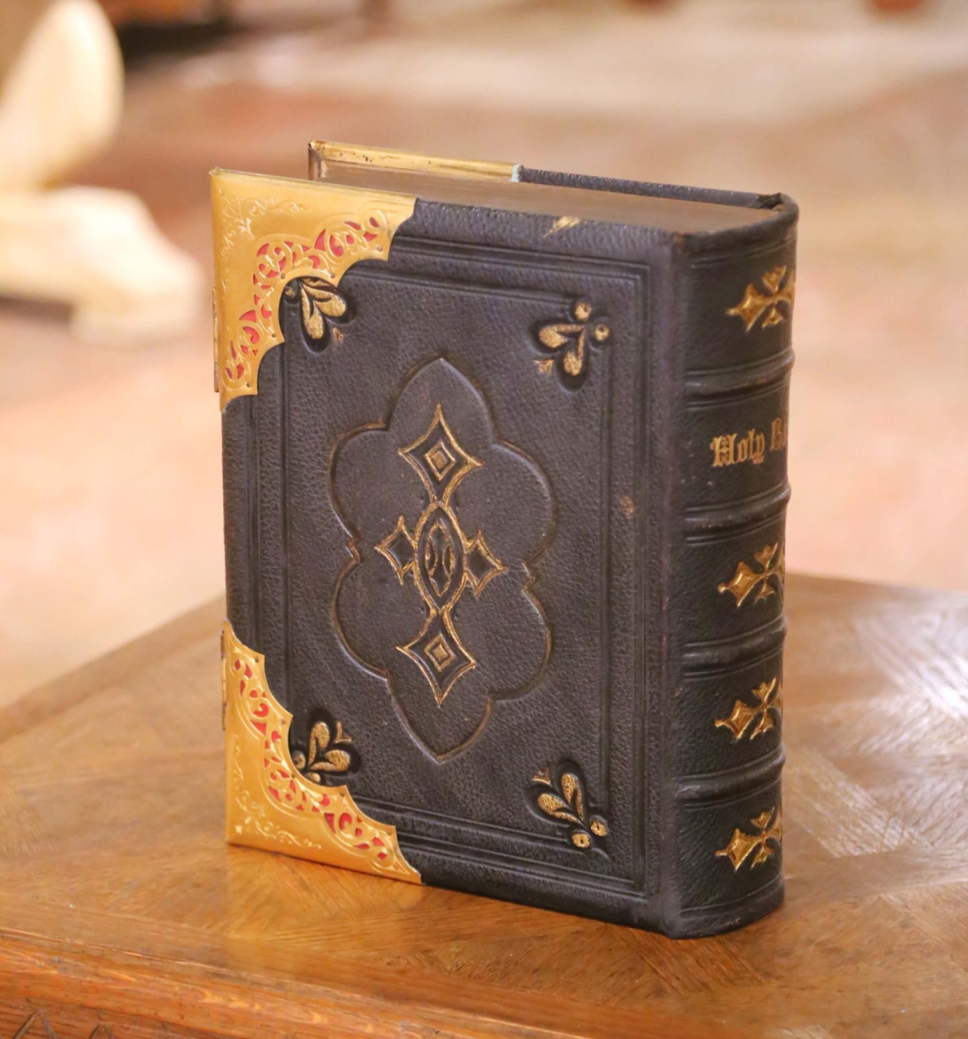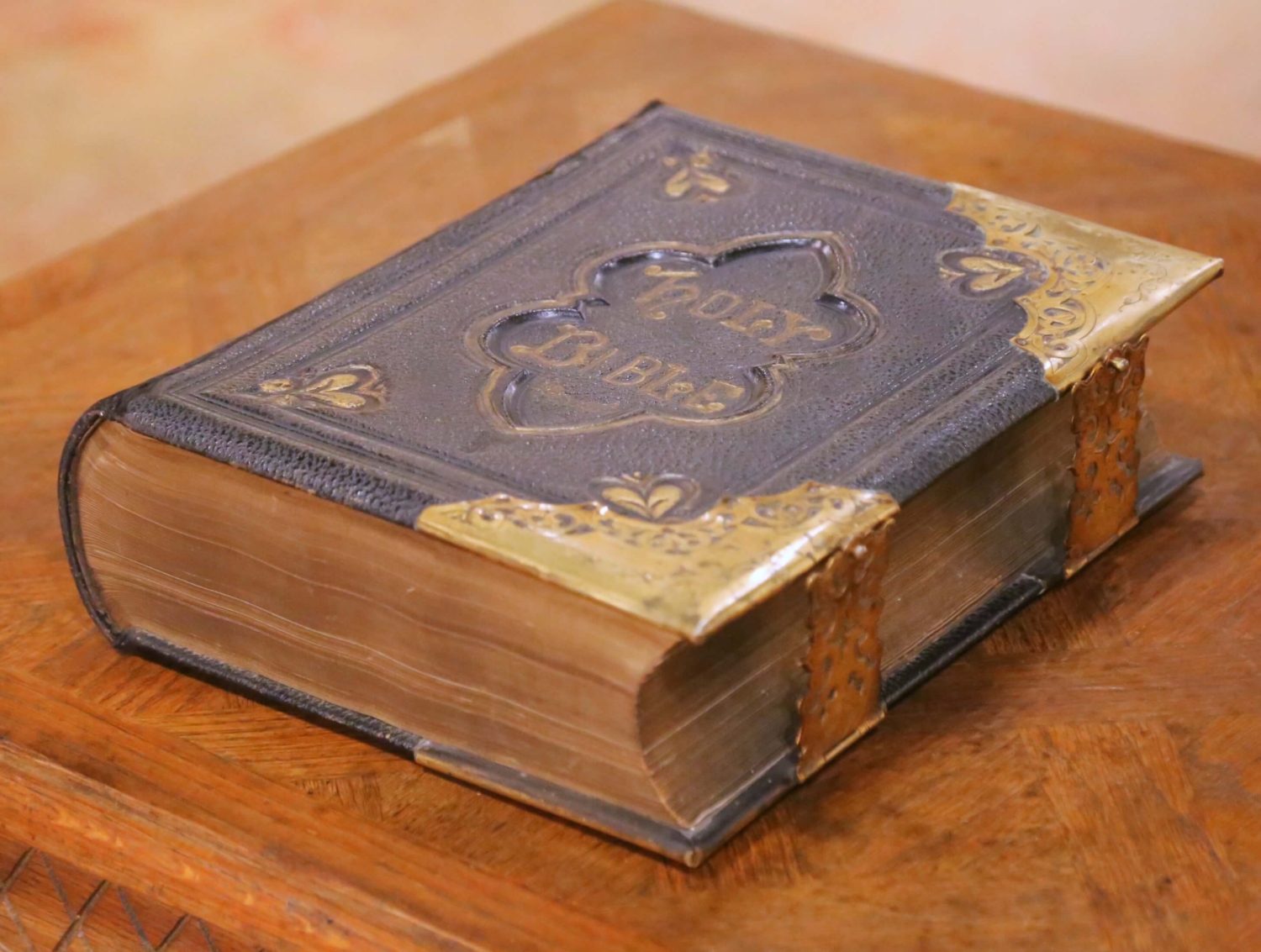 19th Century English Leather Bound Holy Bible with Brass Mounts and Clasps