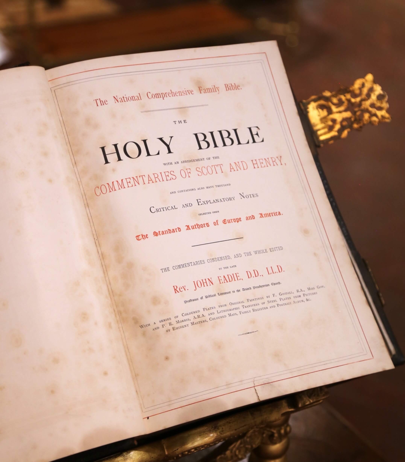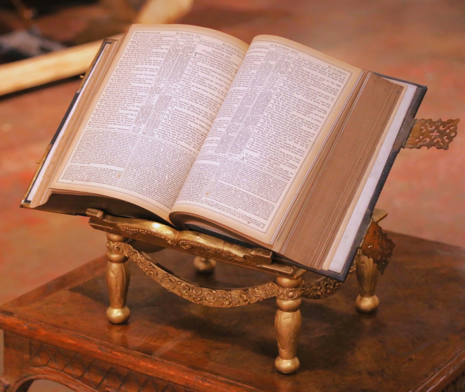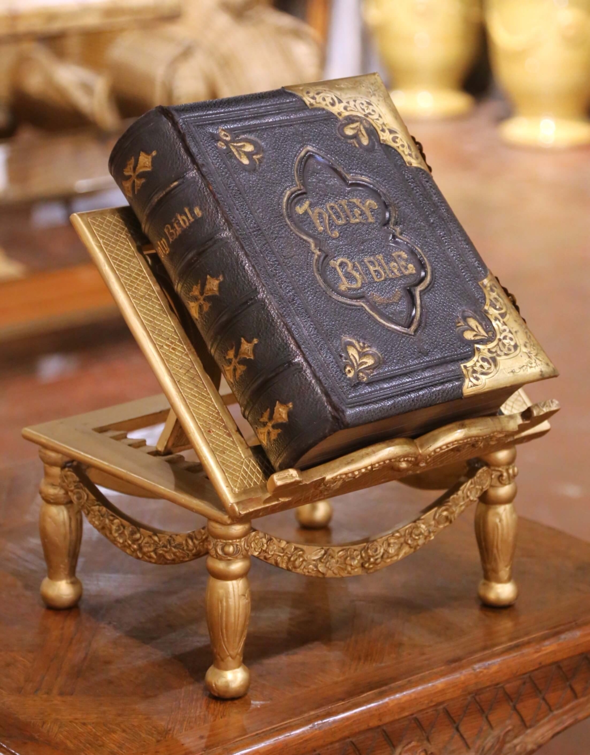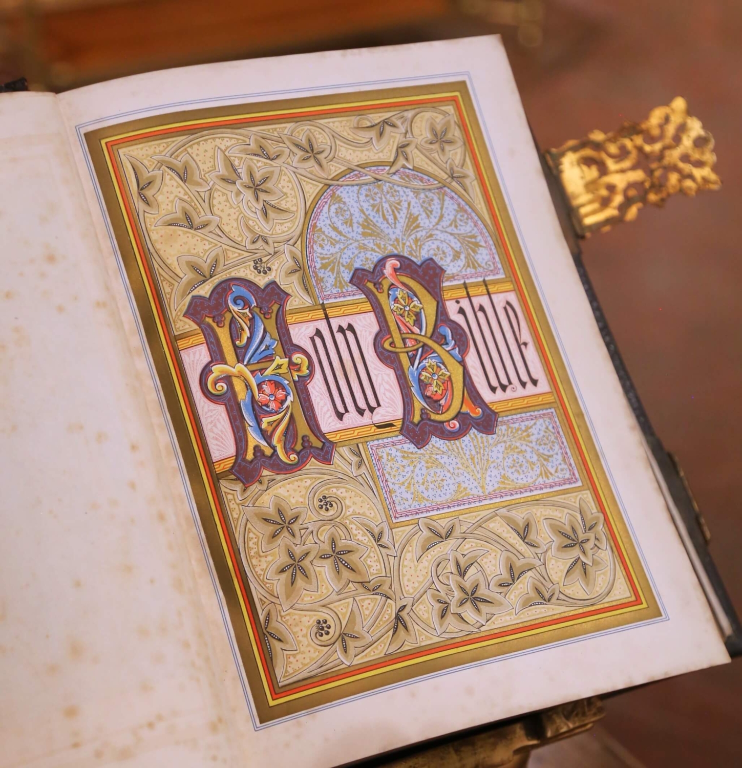 This impressive antique Holy Bible was published in the 19th century and bound in a richly embossed black leather cover adorned with ornate gilt decoration. The front and back boards feature a Gothic quatrefoil cartouche framing the title “Holy Bible,” surrounded by delicate fleur-de-lis motifs and blind-tooled borders. Substantial engraved brass corner mounts protect each edge, while two elaborate pierced brass clasps secure the fore-edge, lending both architectural strength and decorative flourish. The spine is banded and embellished with gilt crosses and lettering, reinforcing its ecclesiastical character. The interior title page identifies the volume as The National Comprehensive Family Bible, including commentaries of Scott and Henry, edited by Rev. John Eadie, D.D., LL.D. The book contains richly printed typographic layouts, genealogical and chronological tables, and beautifully illustrated chromolithograph plates, including a striking “Lord’s Prayer in Fourteen Languages” and an illuminated presentation page with elaborate Victorian ornamentation. The pages exhibit age-appropriate foxing and light toning consistent with 19th century paper, adding authentic antique character without compromising readability. The brass mounts display warm patination and minor surface wear commensurate with age and use. The leather binding retains a deep, timeworn texture with gentle rubbing along the extremities, further enhancing its historic presence. Solid and substantial in scale, this antique Bible makes a dramatic statement when displayed on a lectern, library table, or stacked within a curated collection of ecclesiastical or Victorian decorative objects. Dimensions: 11”W x 4”D x 13”H