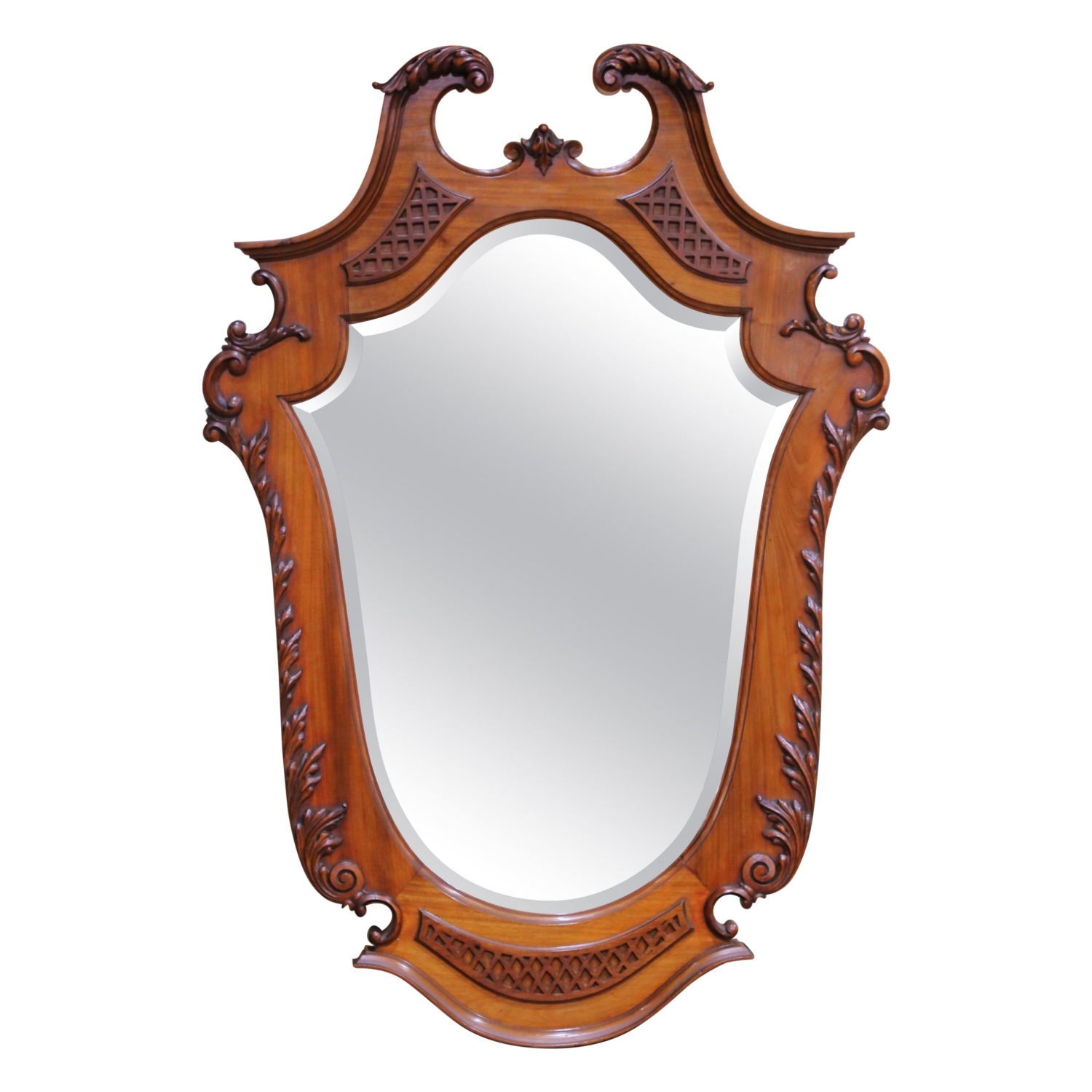 Crafted in England circa 1870, this elegant antique Rococo Revival wall mirror is carved from richly toned walnut and shaped in a graceful shield form. The frame is crowned by a distinctive split swan-neck pediment with opposing scrolls centered by a small foliate cartouche. Pierced lattice panels decorate both the upper and lower sections, adding architectural detail and visual depth to the design. The flowing silhouette is enhanced by finely carved scrolling acanthus ornament along the shoulders and base, while the molded edges highlight the warm walnut grain and beautifully aged patina. The shaped mirror plate features a beveled edge and retains its original glass plate. Elegant in proportion and sculptural in presence, this 19th century mirror would make a striking statement in an entryway, powder room, or displayed above a console, or commode. Excellent antique condition commensurate with age and use. Dimensions: 35.5″W x 50.75″H Weight: 33 lbs