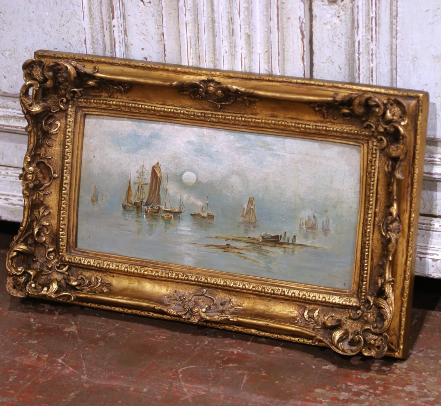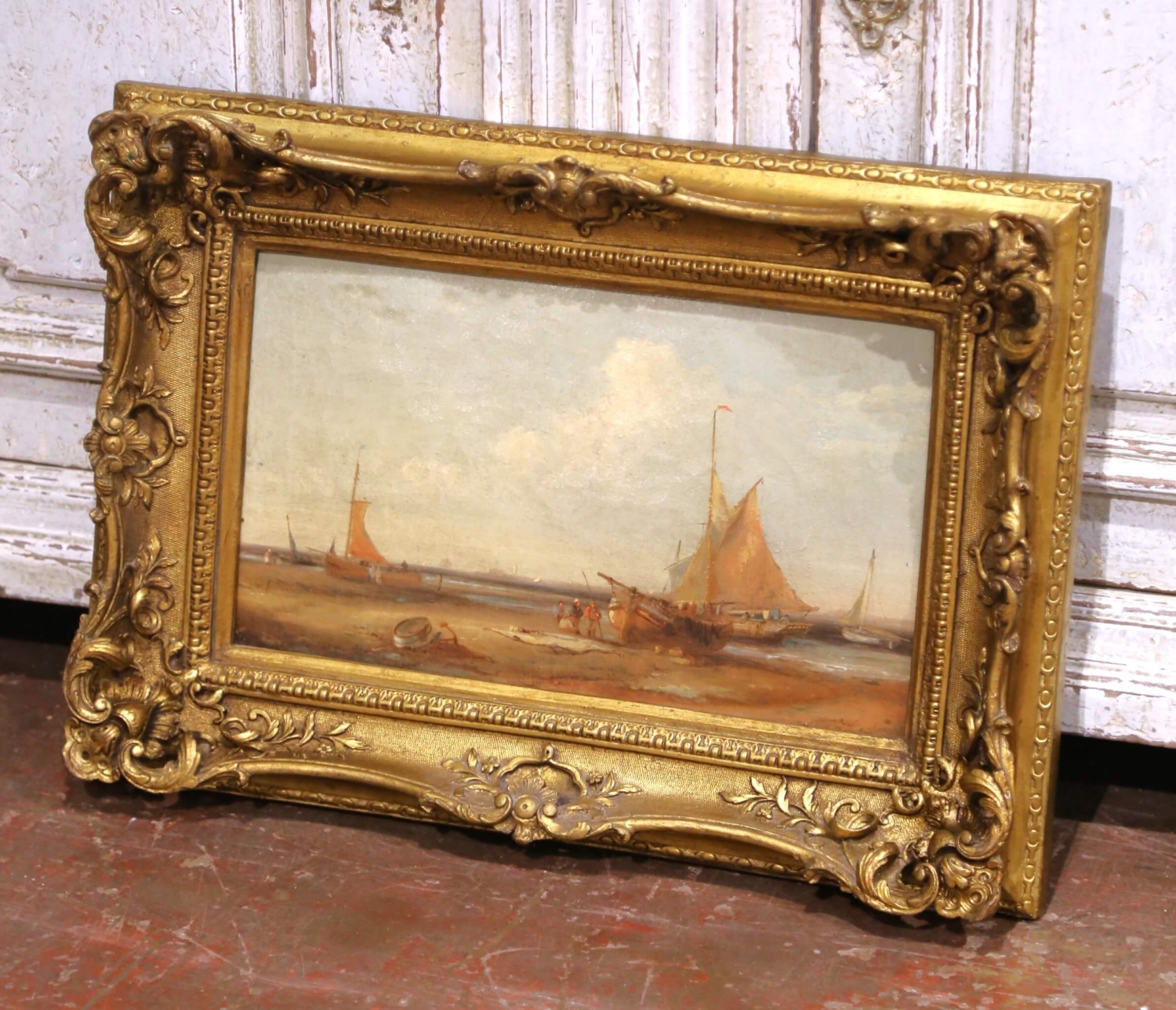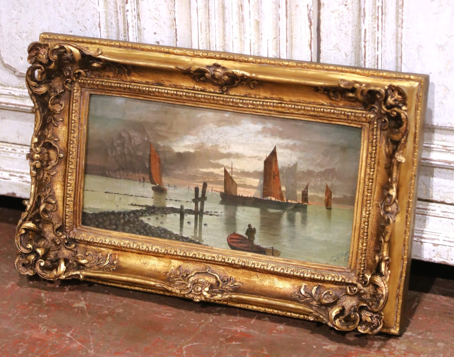 Bring atmosphere and coastal charm to any study, library, or living space with this antique set of three English School maritime paintings, circa 1880, each beautifully rendered in oil on canvas and presented in richly carved giltwood frames. United by subject matter yet distinct in mood and palette, the trio offers a harmonious exploration of seafaring life across different times of day and weather conditions. Each work may also be sold separately if preferred. The first painting, attributed to the circle of George Gregory (1849–1938), depicts fishermen gathered beside beached sailboats at low tide. Soft, warm light washes across the sands as figures tend to nets and gear, while vessels with ochre-toned sails rest quietly in the shallow coastal waters. The composition captures the serene rhythm of daily labor on the English shoreline. The second painting presents an evocative misty seascape, stamped verso by a Stoke Newington supplier associated with artist L. Rudolph. Here, tall-masted ships and smaller sailing craft drift almost motionless across a glasslike harbor. The hazy sun hangs low over a pale blue horizon, dissolving into vaporous light. An overturned rowboat and a few weathered pilings in the foreground give the scene a poetic sense of stillness and maritime solitude. The third work, signed G.W. Ward and dated 1887, depicts a dramatic harbor at sunset. Warm gold breaks through thick clouds as sailboats with reddish-brown sails glide across shimmering water. A solitary figure tends to a small rowboat in the foreground, while wooden pilings lead the eye toward the glowing horizon. The strong contrasts and atmospheric sky make this the most theatrical of the set. Together, the three paintings form a cohesive suite that traces the shifting moods of the sea, from bright morning labor to misty calm to fiery evening light. Each canvas shows overall craquelure and expected patina, and all remain in excellent condition commensurate with age and use. Measurements: • Gregory circle painting: 21″W x 14.75”H • G.W. Ward painting: 21.5″W x 13.25”H • Misty seascape: 21.5″W x 13.25”H