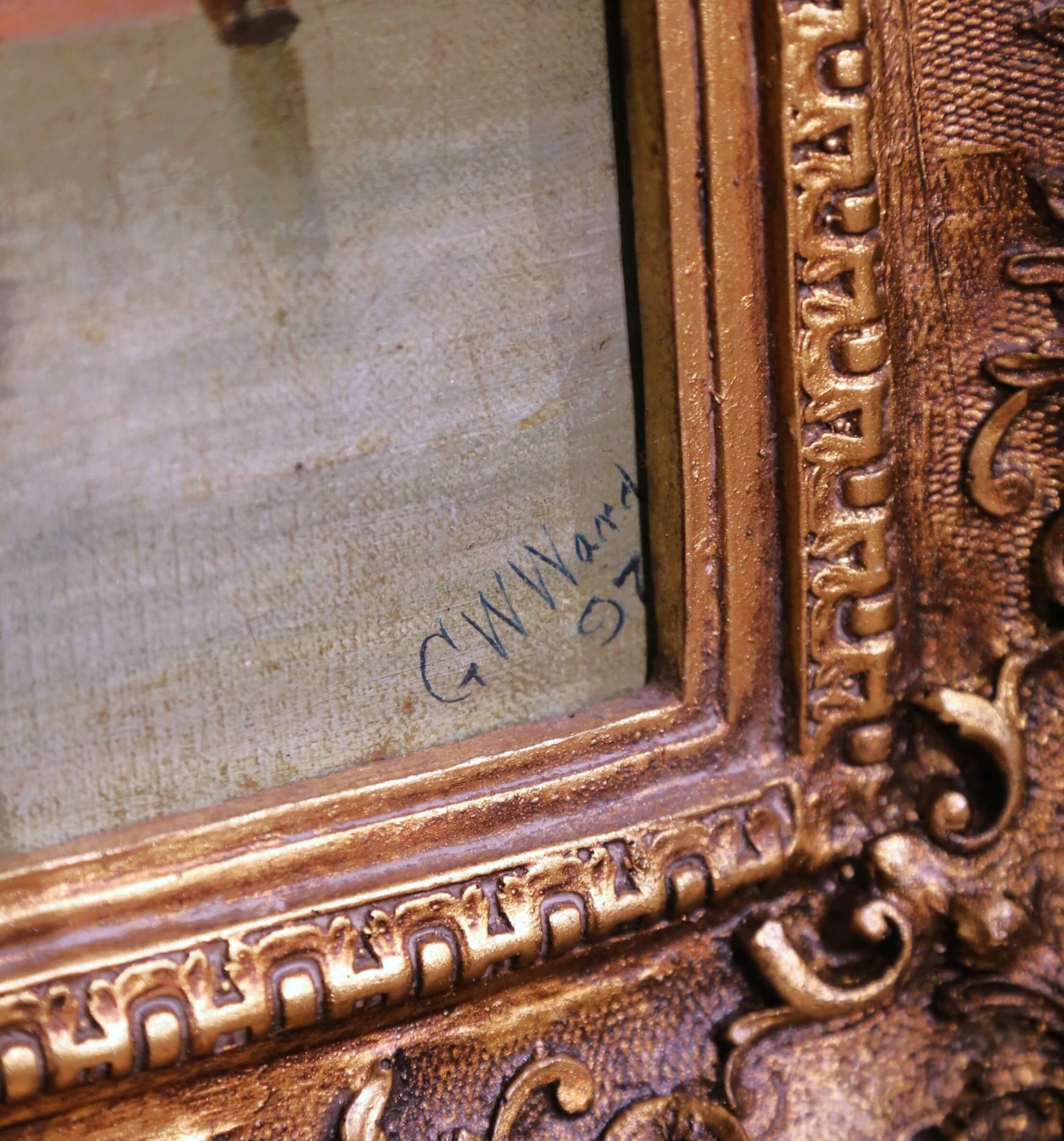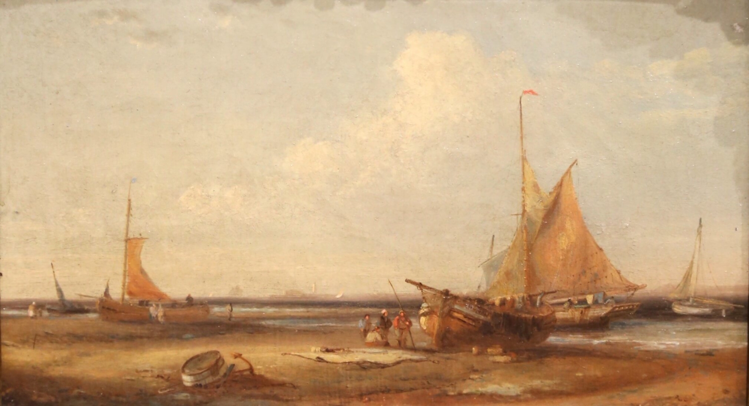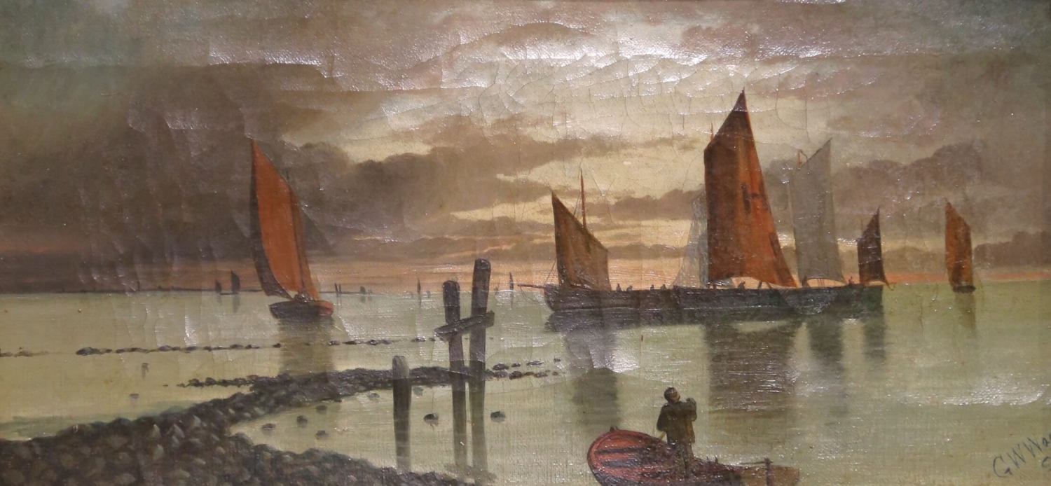 Bring atmosphere and coastal charm to any study, library, or living space with this antique set of three English School maritime paintings, circa 1880, each beautifully rendered in oil on canvas and presented in richly carved giltwood frames. United by subject matter yet distinct in mood and palette, the trio offers a harmonious exploration of seafaring life across different times of day and weather conditions. Each work may also be sold separately if preferred. The first painting, attributed to the circle of George Gregory (1849–1938), depicts fishermen gathered beside beached sailboats at low tide. Soft, warm light washes across the sands as figures tend to nets and gear, while vessels with ochre-toned sails rest quietly in the shallow coastal waters. The composition captures the serene rhythm of daily labor on the English shoreline. The second painting presents an evocative misty seascape, stamped verso by a Stoke Newington supplier associated with artist L. Rudolph. Here, tall-masted ships and smaller sailing craft drift almost motionless across a glasslike harbor. The hazy sun hangs low over a pale blue horizon, dissolving into vaporous light. An overturned rowboat and a few weathered pilings in the foreground give the scene a poetic sense of stillness and maritime solitude. The third work, signed G.W. Ward and dated 1887, depicts a dramatic harbor at sunset. Warm gold breaks through thick clouds as sailboats with reddish-brown sails glide across shimmering water. A solitary figure tends to a small rowboat in the foreground, while wooden pilings lead the eye toward the glowing horizon. The strong contrasts and atmospheric sky make this the most theatrical of the set. Together, the three paintings form a cohesive suite that traces the shifting moods of the sea, from bright morning labor to misty calm to fiery evening light. Each canvas shows overall craquelure and expected patina, and all remain in excellent condition commensurate with age and use. Measurements: • Gregory circle painting: 21″W x 14.75”H • G.W. Ward painting: 21.5″W x 13.25”H • Misty seascape: 21.5″W x 13.25”H