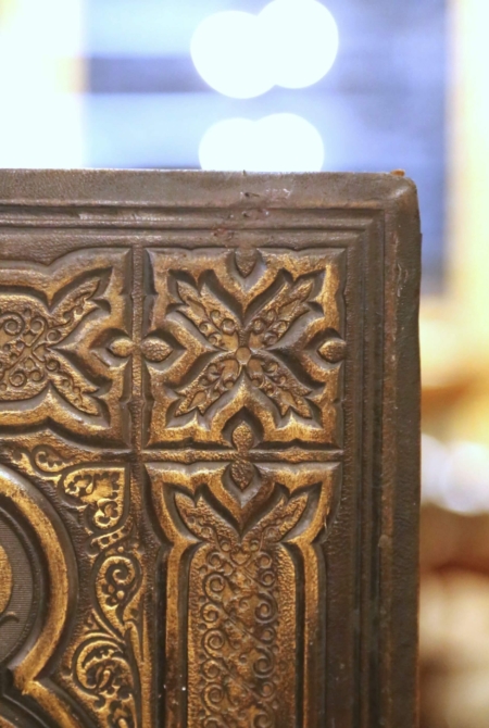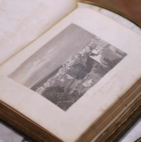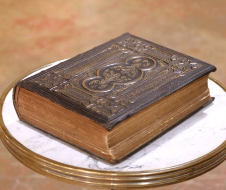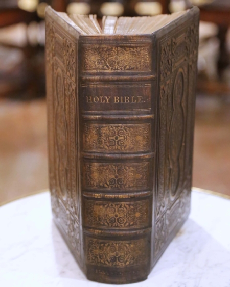 An impressive mid-19th century “Illustrated National Family Bible,” published circa 1860 by William Collins, Sons & Company of Glasgow, Edinburgh & London. Edited by Reverend John Eadie, D.D., LL.D., this monumental volume features the Authorized King James Version with the celebrated commentaries of Matthew Henry and Thomas Scott, along with extensive marginal readings and parallel references. The Bible is bound in richly tooled and gilt-embossed leather, with all page edges gilt for a luminous, refined finish. The interior boasts numerous full-page colorplate illustrations, finely engraved scenes from original photographs taken expressly for this edition, and detailed hand-colored maps of Egypt, Canaan, and the Holy Land. Condition is good overall, with some expected wear to the leather, light foxing and toning to pages, and some loose pages throughout, though the binding remains largely sound. A substantial volume, it measures approximately 4 inches high by 13.5 inches long by 10.5 inches wide, and weighs 12.5 pounds. This antique family Bible is both a decorative display piece and a significant devotional work, ideal for collectors of 19th-century religious books or heirloom library collections.