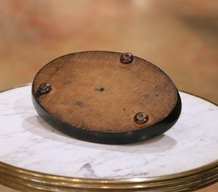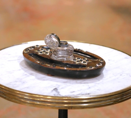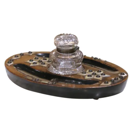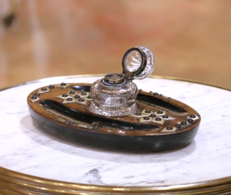 Add a touch of 19th-century elegance to your desk with this Victorian Aesthetic Movement inkwell, crafted in England circa 1870. The oval base is built from warm walnut and features two recessed pen trays, ebonized for contrast and bordered with intricate mother-of-pearl and brass inlay in star and diamond motifs. At the center, a cut crystal glass ink pot with a faceted lid and silver-plated hinged collar opens to reveal the original well. This piece exemplifies the Aesthetic Movement’s appreciation for beauty and craftsmanship, combining fine materials with harmonious design. The richly patinated wood and luminous nacre create a striking contrast, while the low profile and functional compartments make it as practical as it is decorative. In excellent condition commensurate with age and use, this antique inkwell would be perfect on a library desk, executive office, or writing table. Dimensions: 11″ W x 8″ D x 4″ H