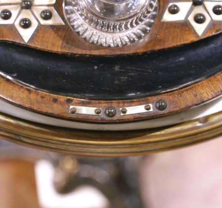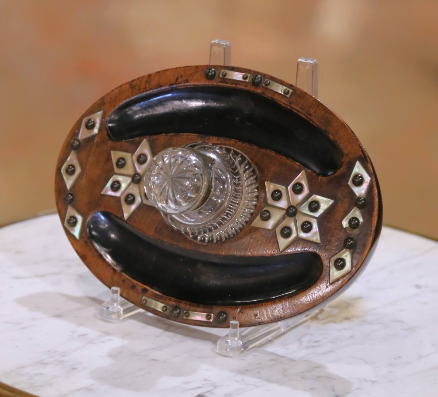 19th Century English Walnut and Mother-of-Pearl Oval Inkwell with Glass Insert